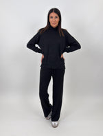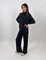 Cordset composto da maglia modello mezzo collo con trama a coste, manica lunga con polsino finale a coste e spacchetti laterali. Pantalone a gamba larga con bustino elastico e laccetti regolabili.