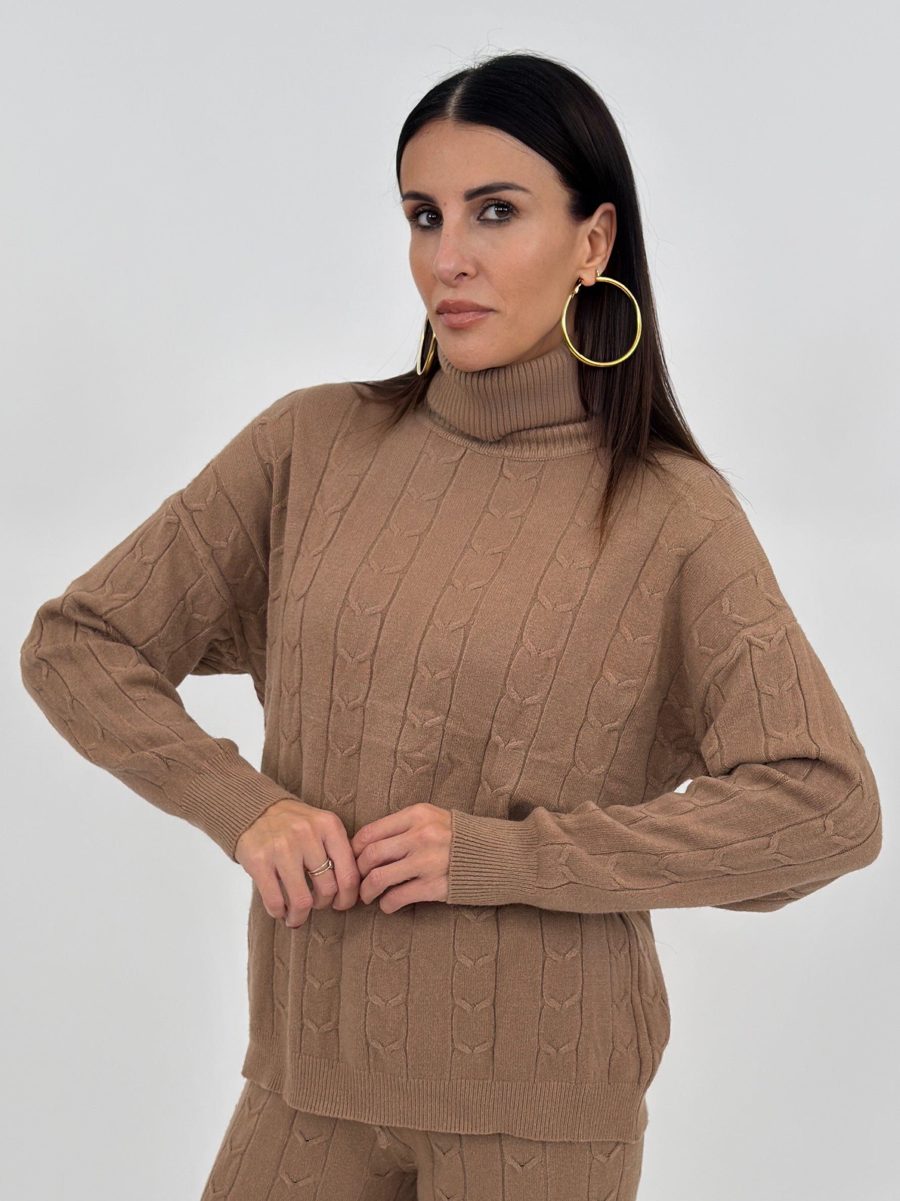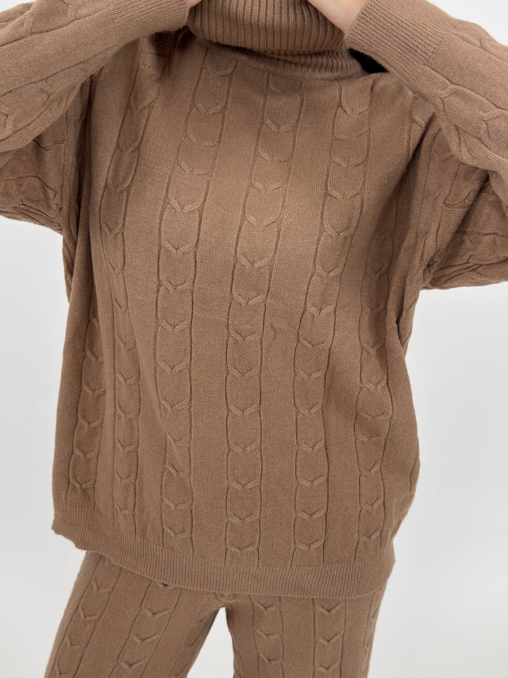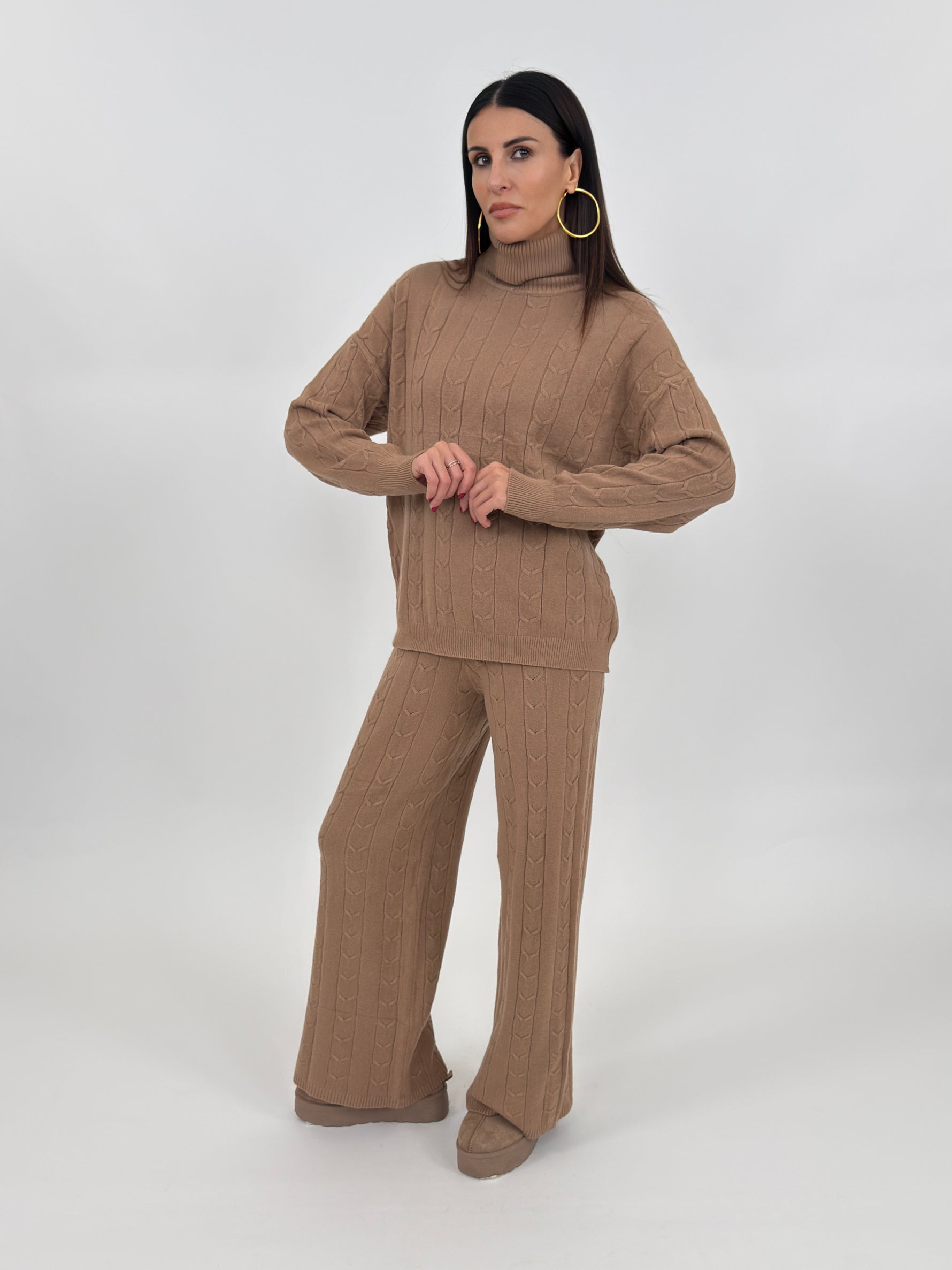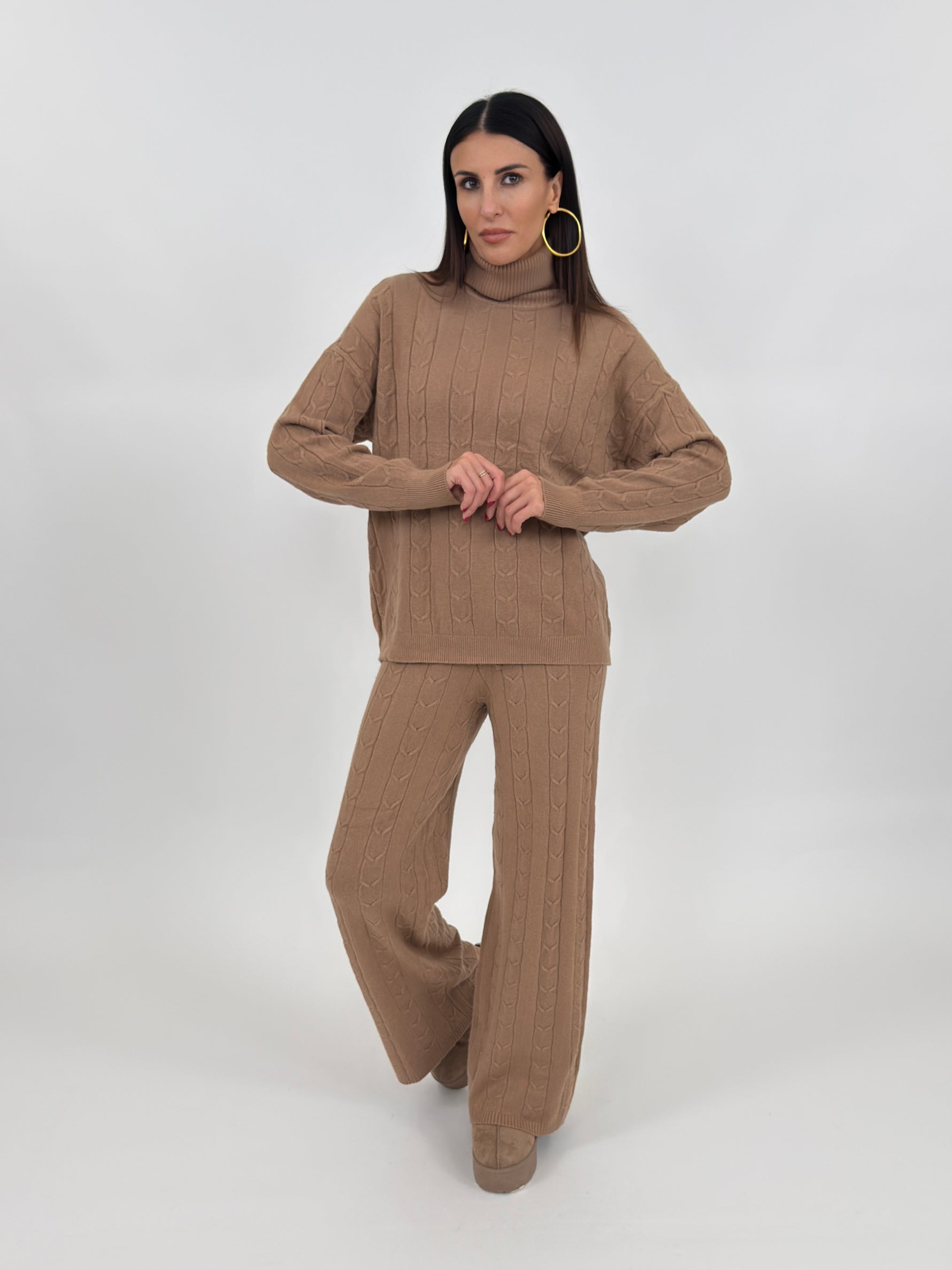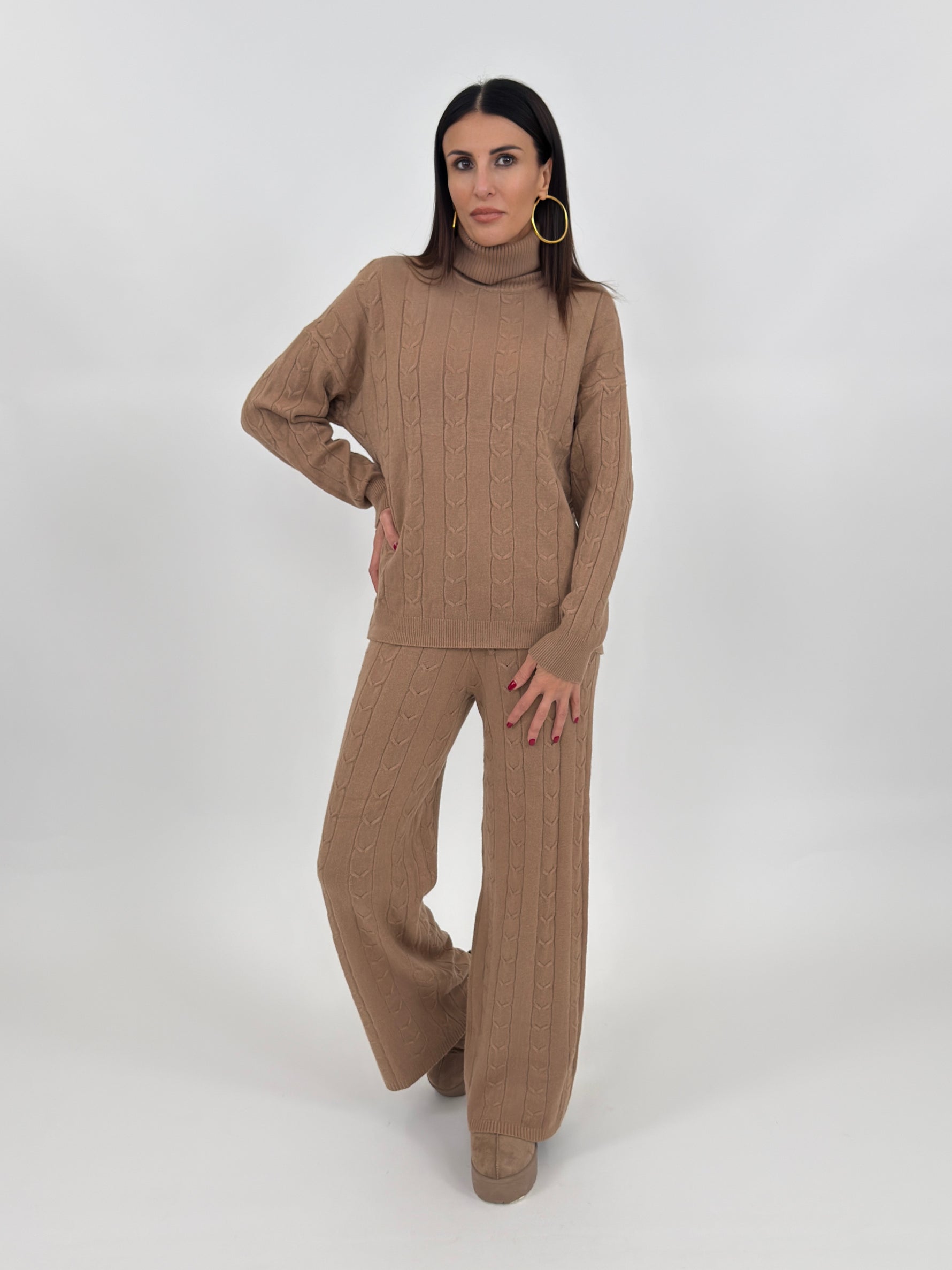 Cordset composto da maglia modello dolcevita con motivo stampato sul davanti e sul retro. Maniche lunghe con spalle cadenti e polsino finale a coste. Pantalone a gamba larga con bustino elastico e laccetti regolabili.
