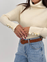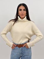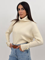 Dolcevita nella trama a coste, modello collo alto, maniche lunghe con polsino decorato da tre bottoni a cupola.