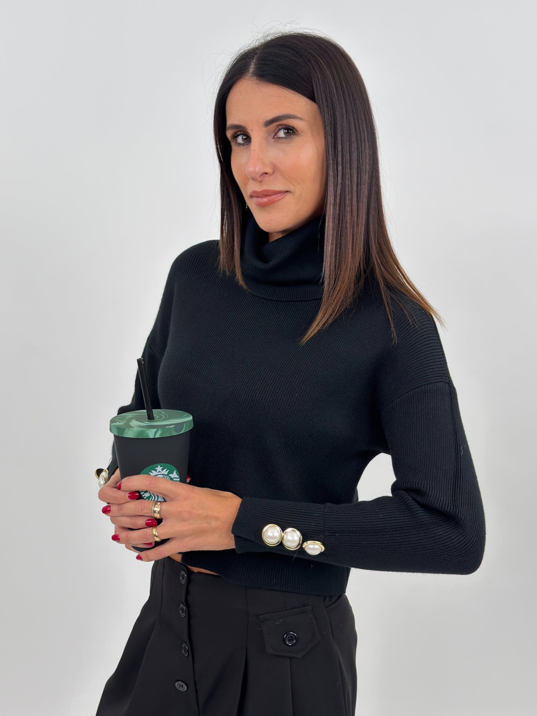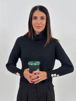 Dolcevita nella trama a coste, modello collo alto, maniche lunghe con polsino decorato da tre bottoni a cupola.