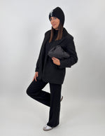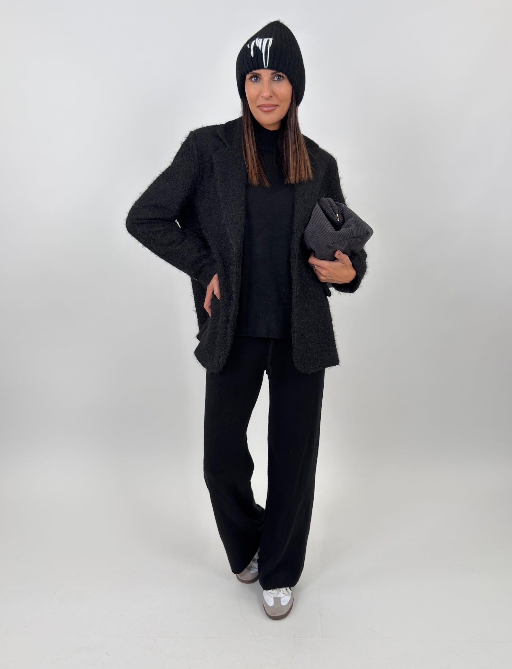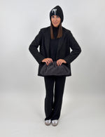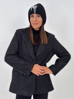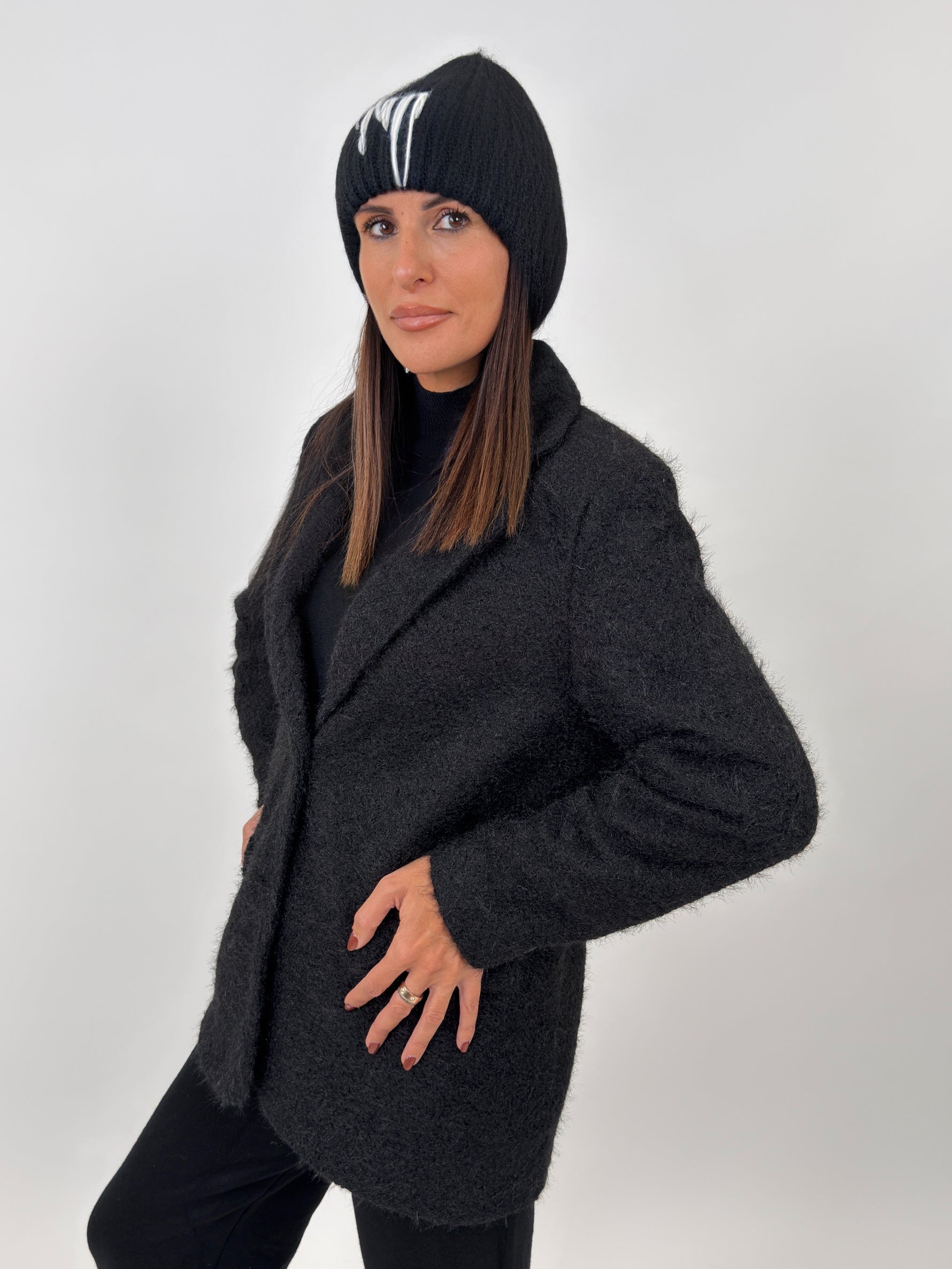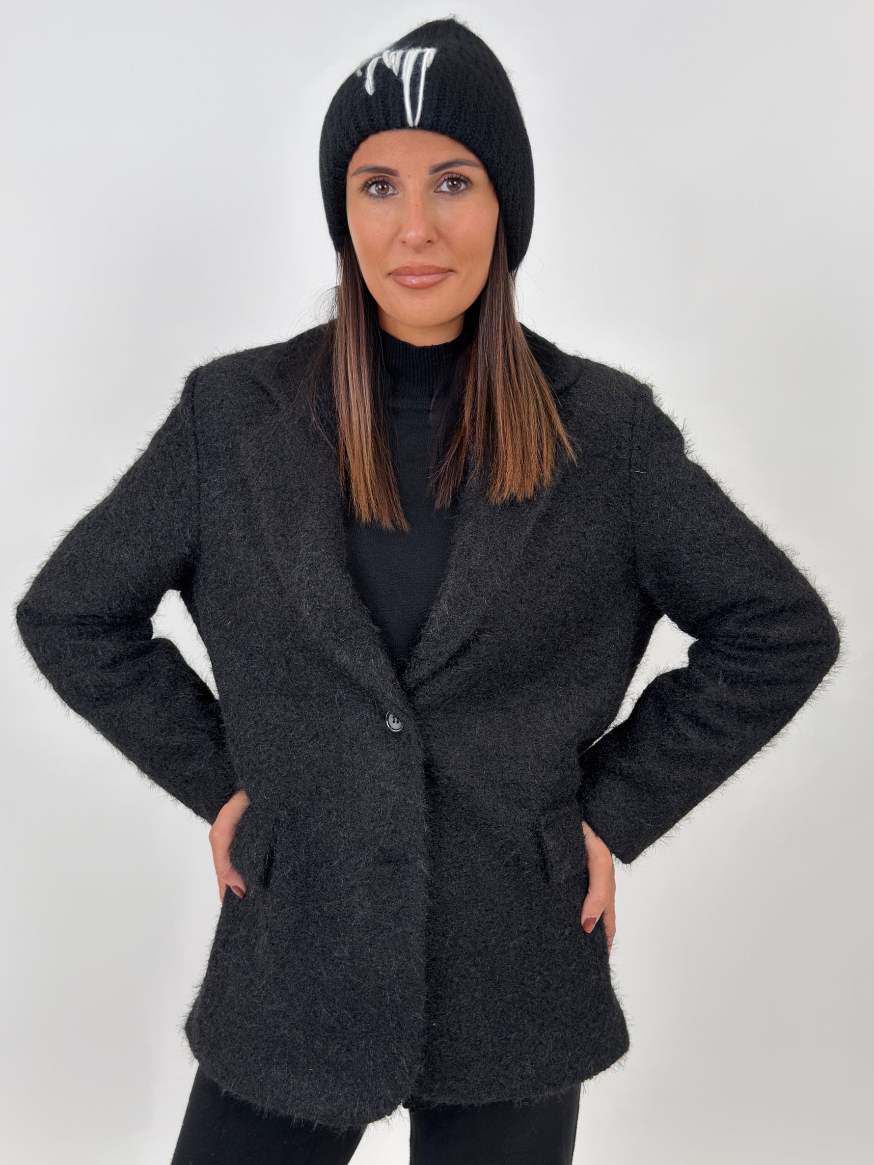 Giacca modello mono petto in effetto bouclè, maniche lunghe con spalline imbottite.
