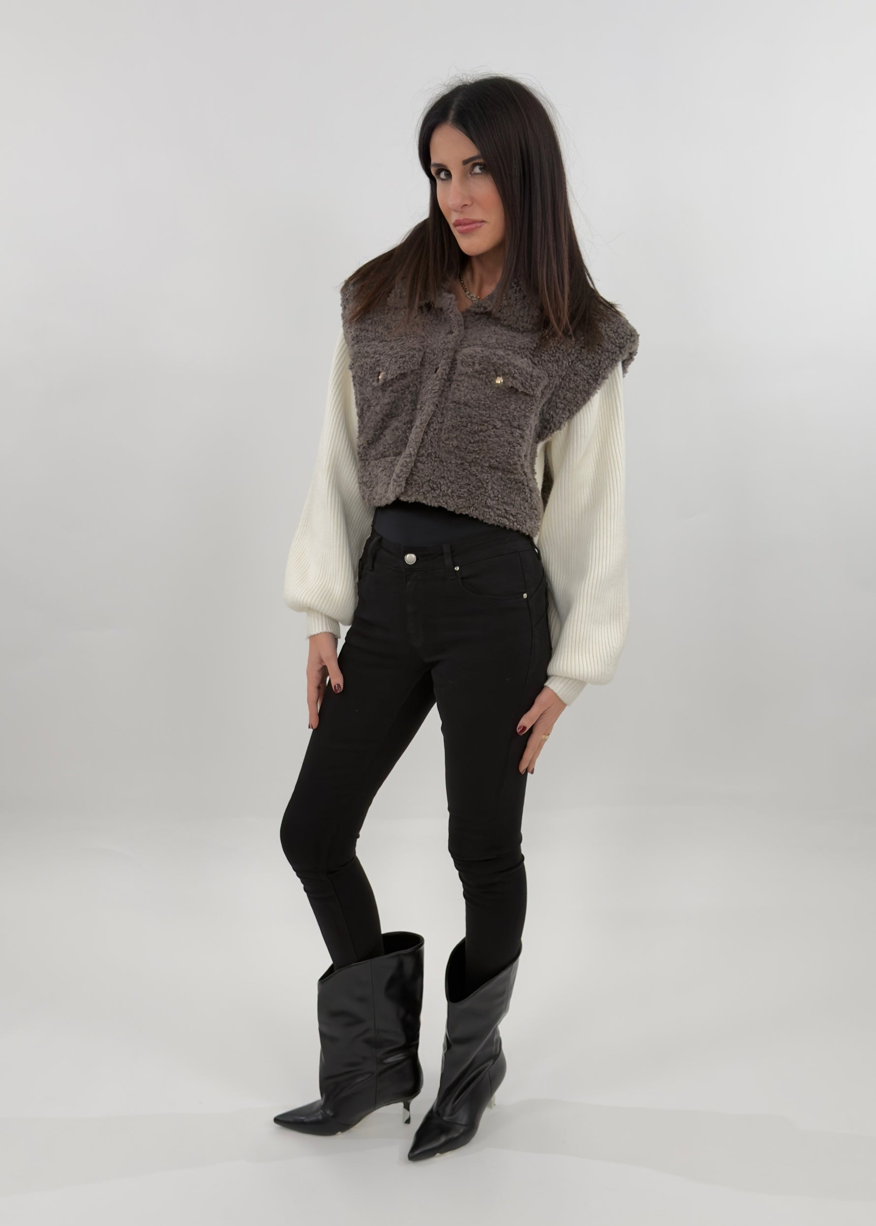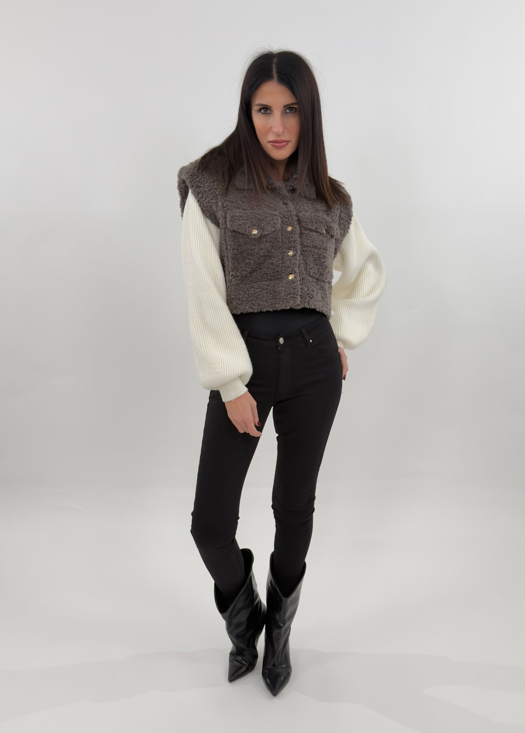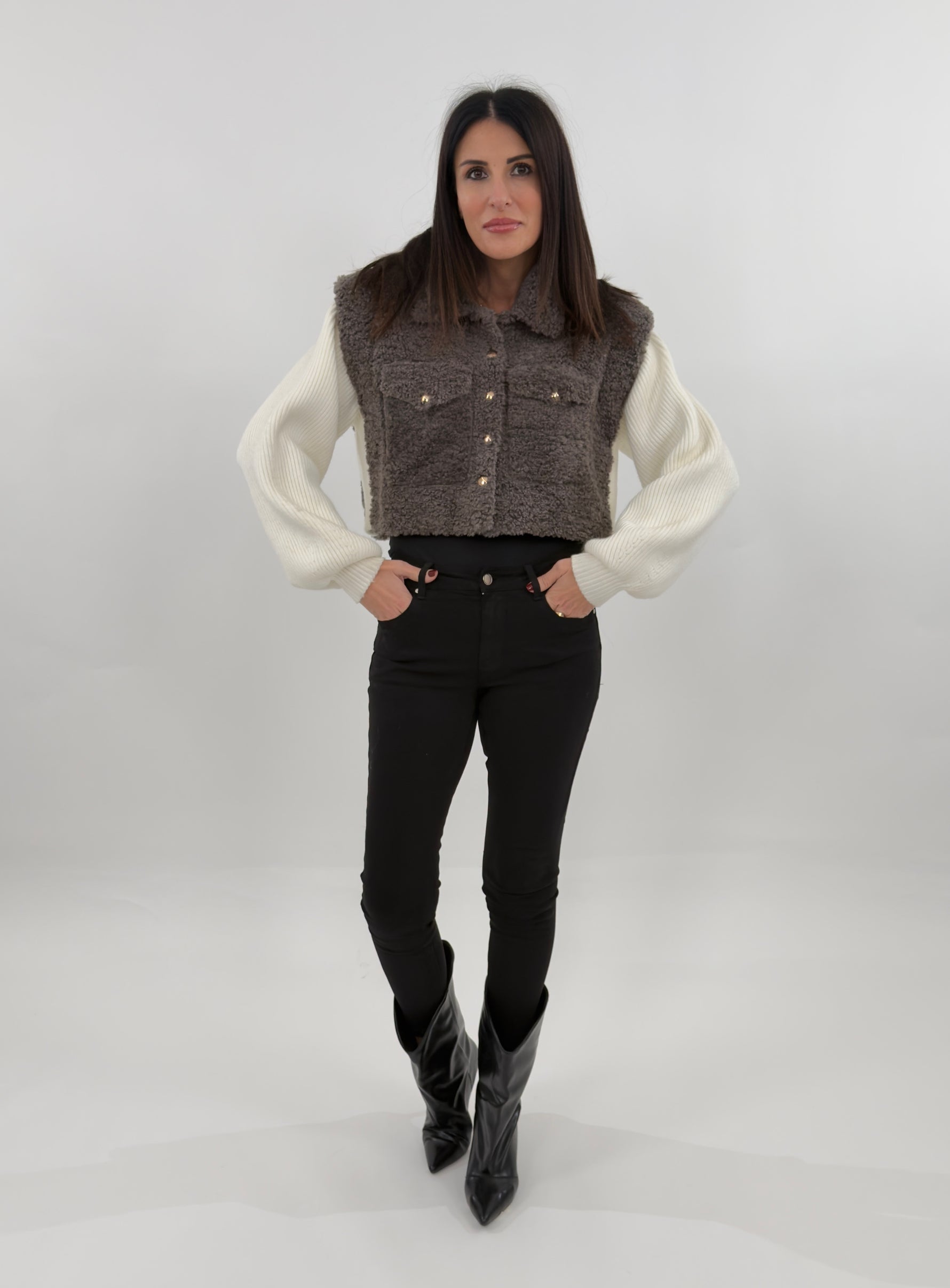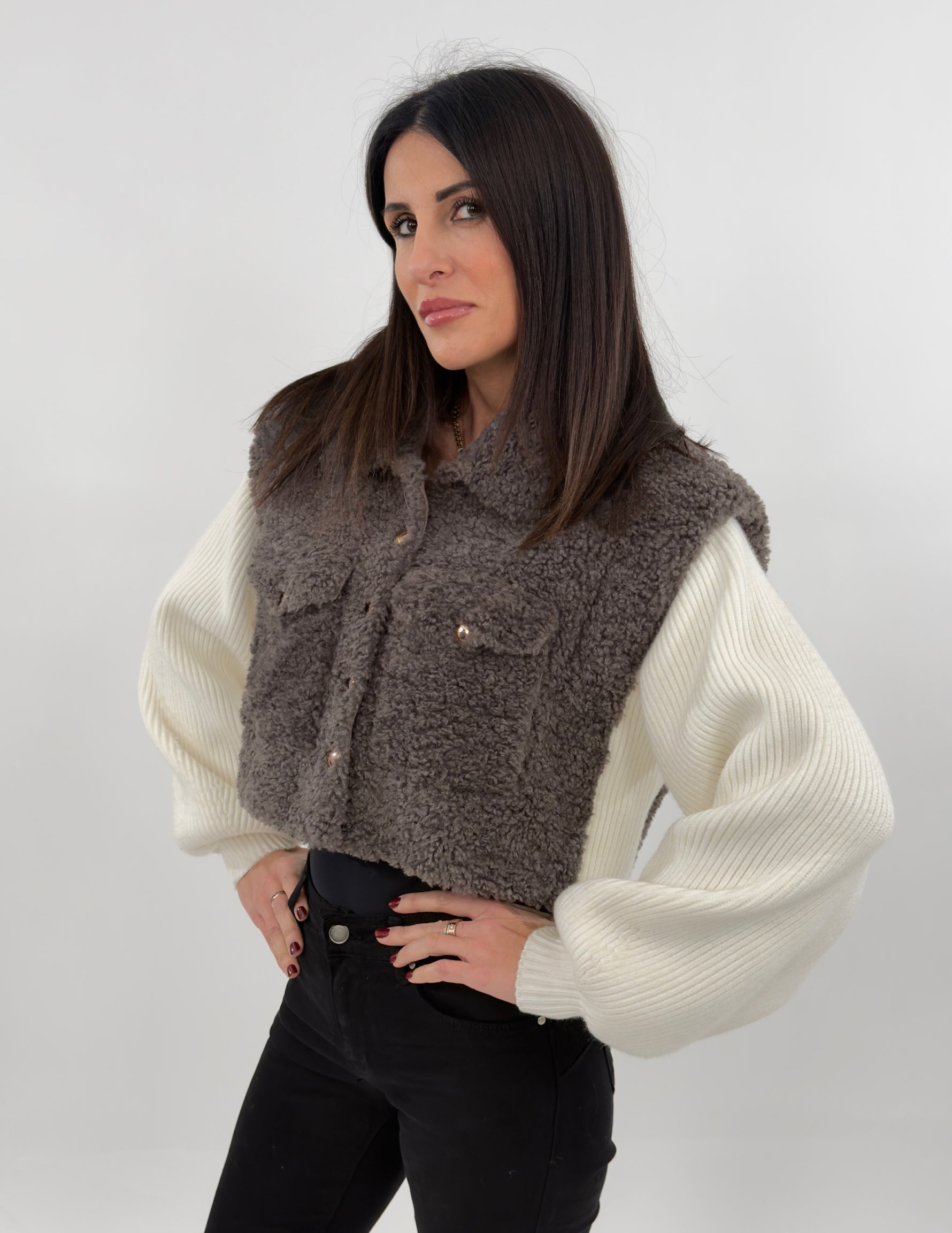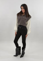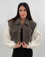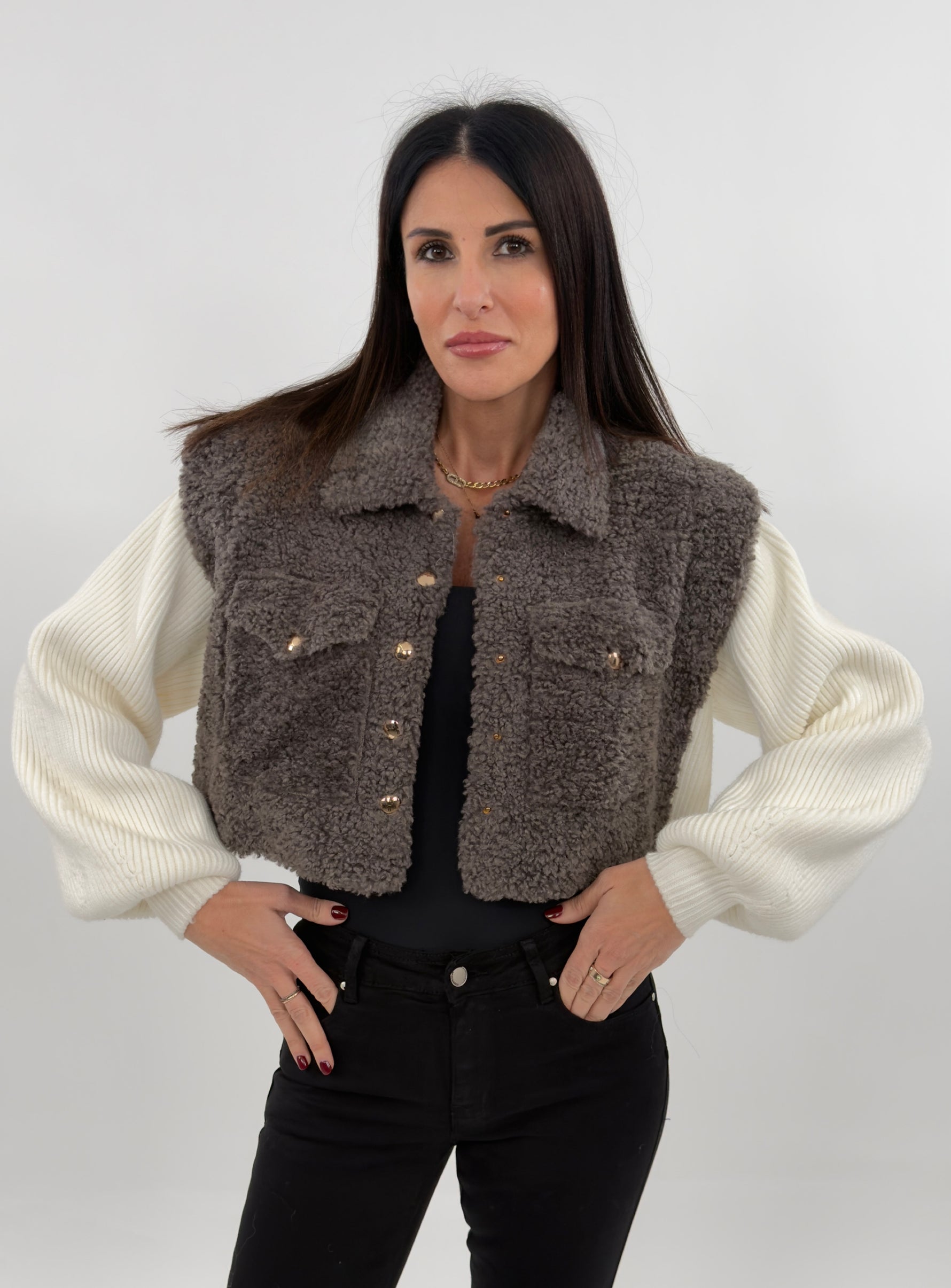 Giubbotto sfoderato modello crop in effetto teddy. Si presenta con maniche lunghe in maglia a costine a contrasto con il corpo in tessuto teddy. Chiusura frontali con bottoni a pressione e tasche applicate sul petto.
