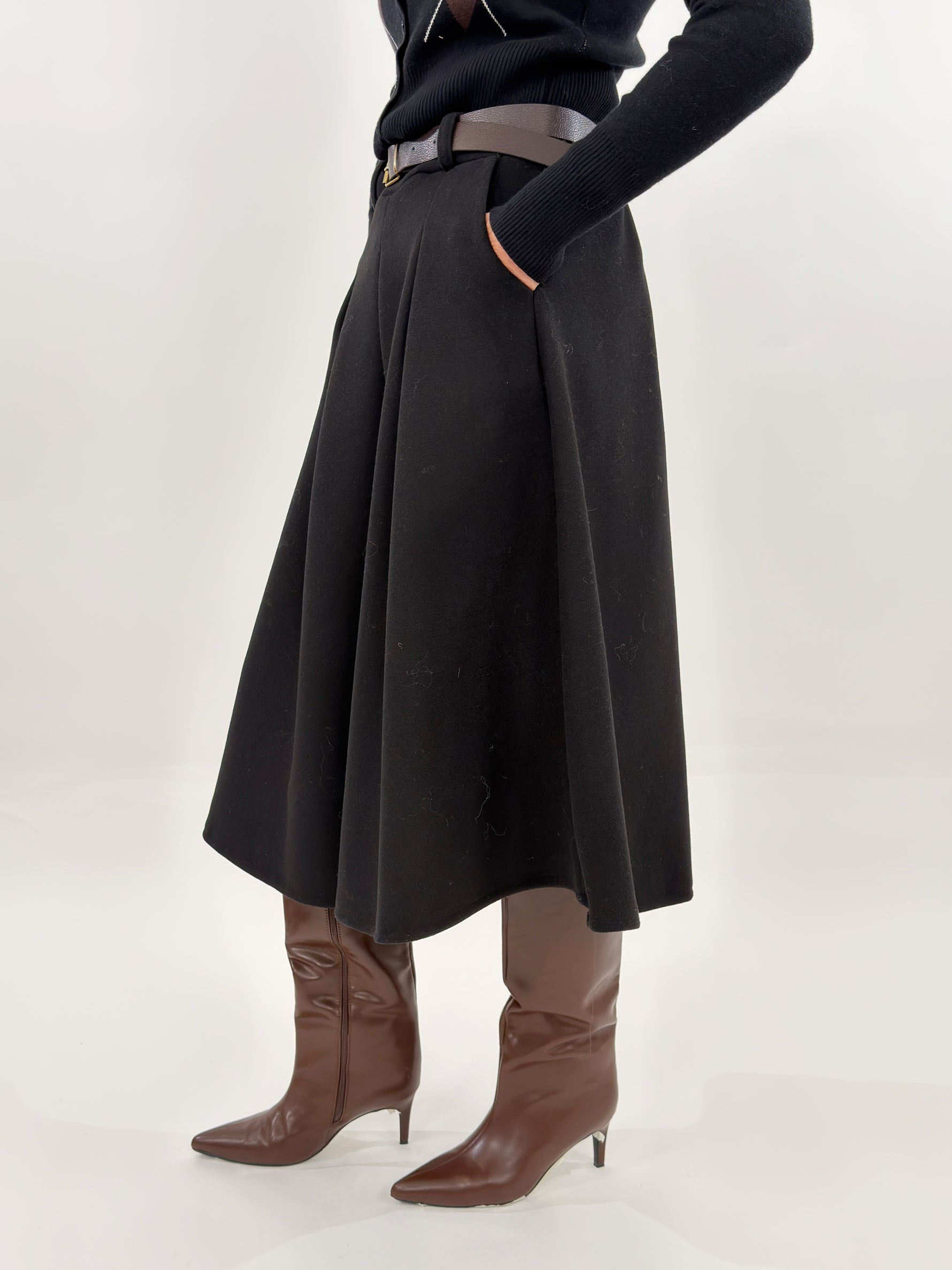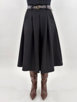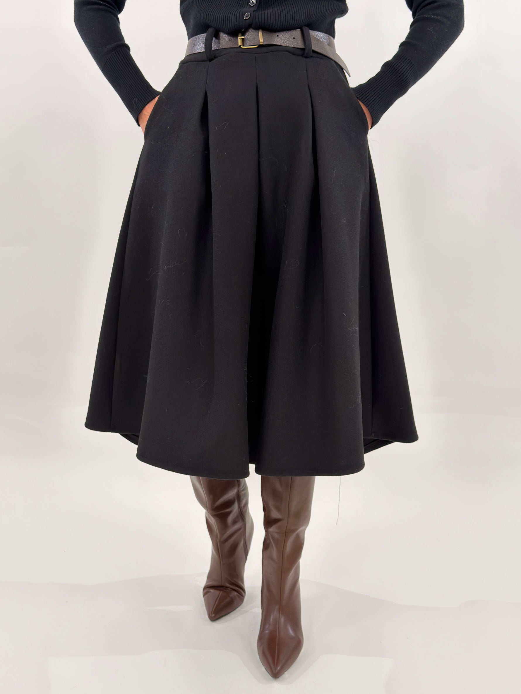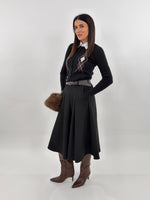 Gonna modello longuette a ruota con tasche laterali. Bustino con elastico sul retro. Passanti e cintura inclusa.
