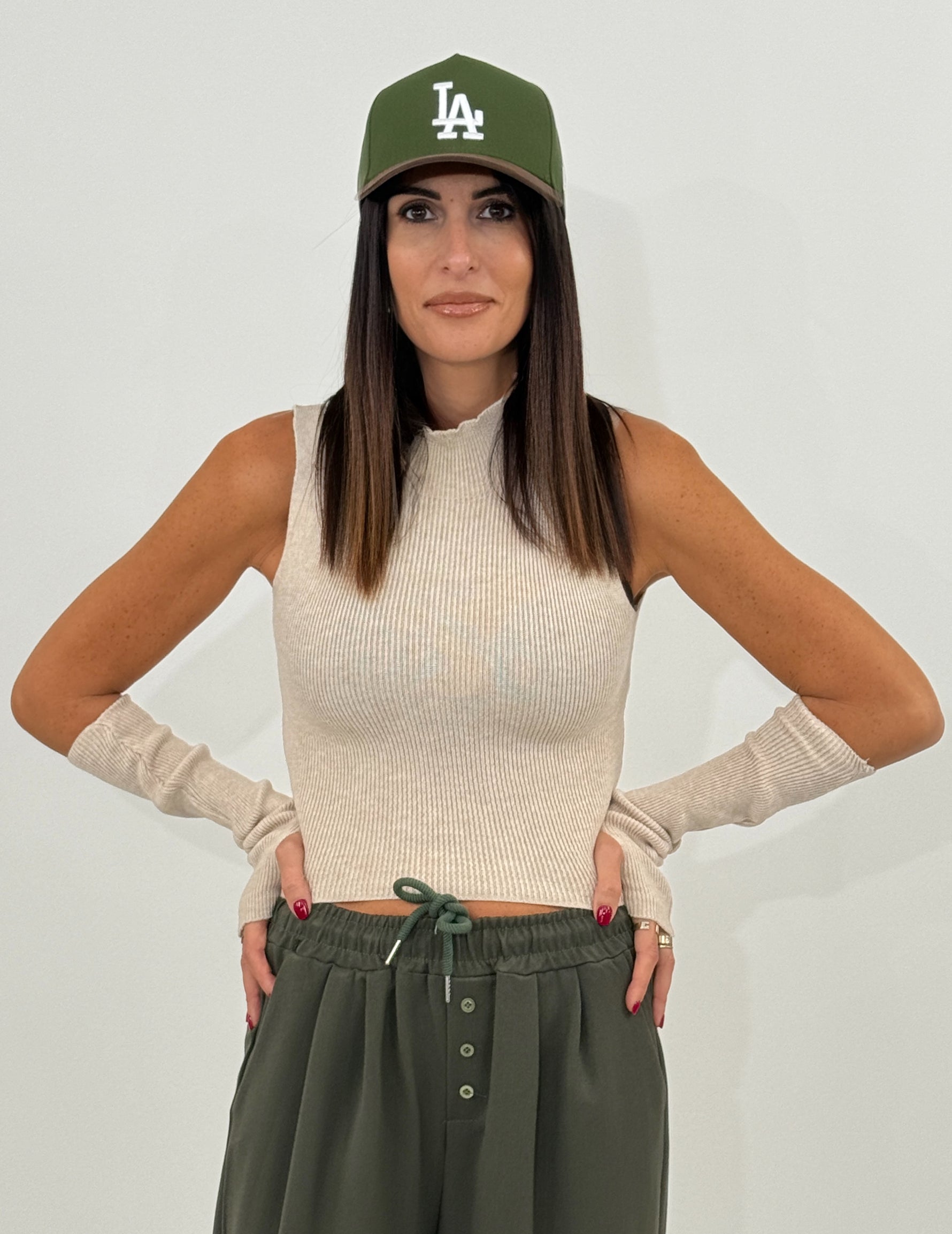 Maglia nella trama a coste, modello giromanica, mezzo collo. Dotata di manicotti.