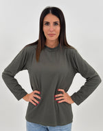 Maglia modello lungo girocollo alto e maniche lunghe.