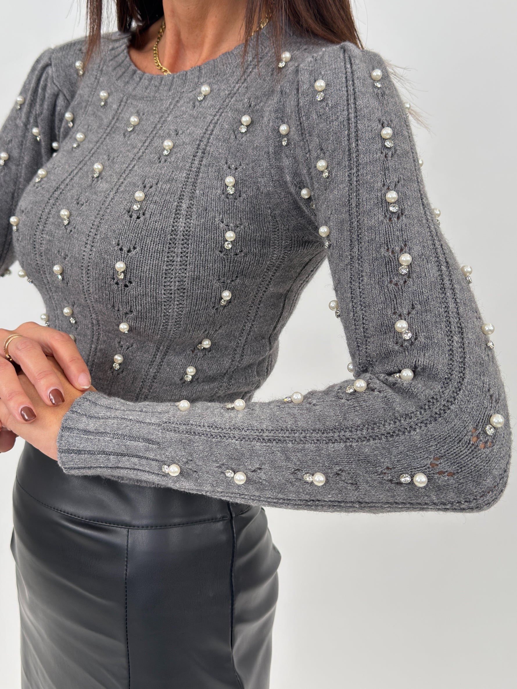 Maglia modello crop girocollo a maniche lunghe leggermente a sbuffo con polsino finale. Ornato da piccole perline e strass sul davanti e sulle maniche.