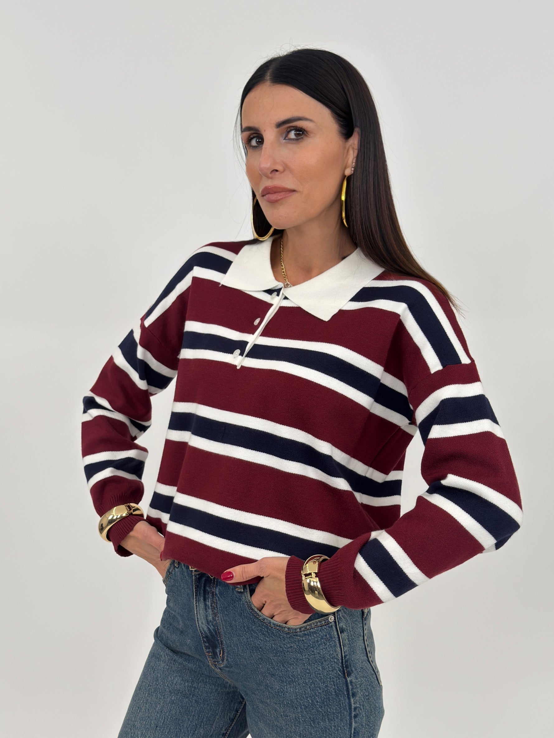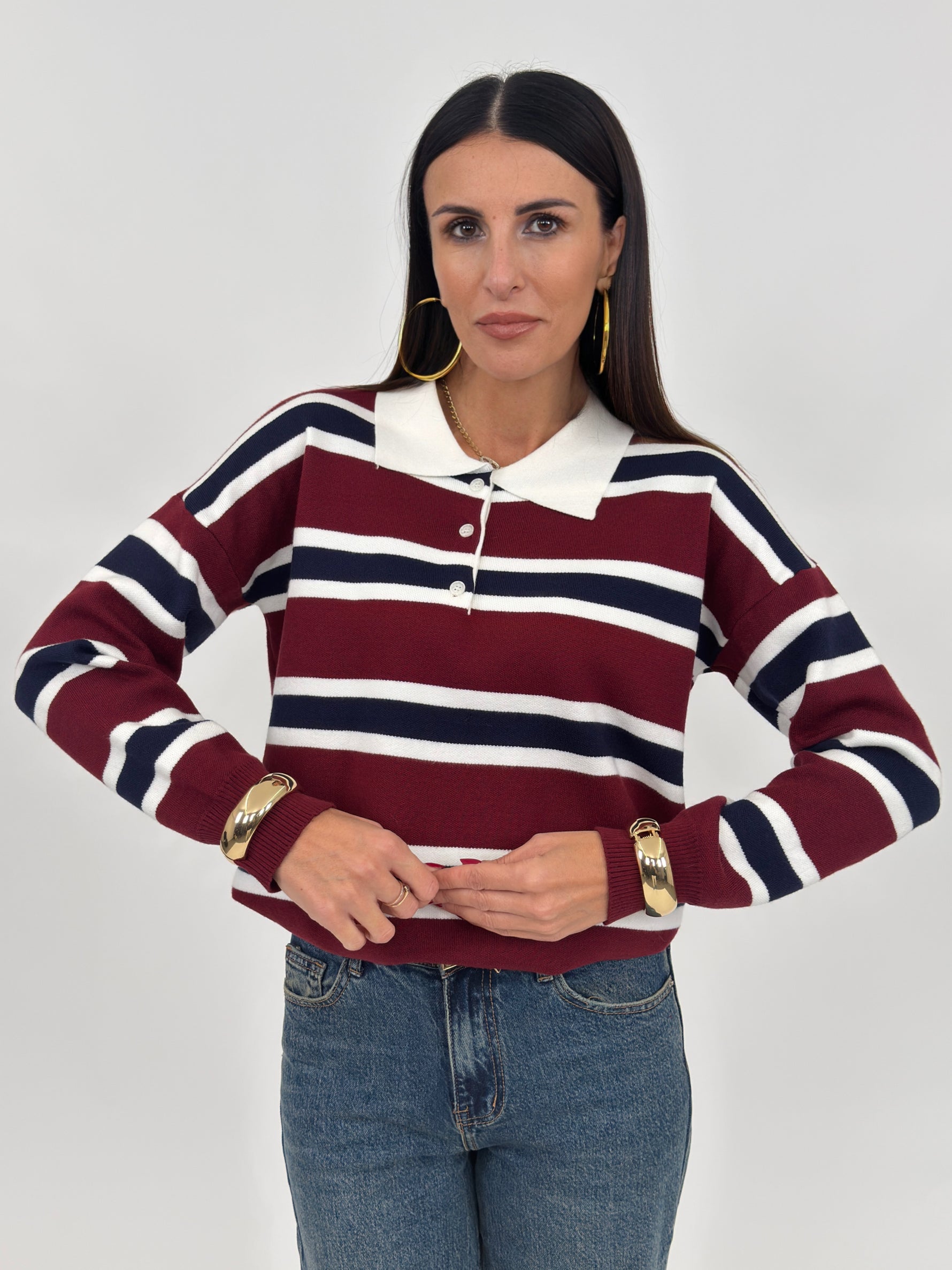 Maglia modello polo con colletto e bottoncini sul davanti con motivo a righe orizzontali a contrasto di colore. Maniche lunghe con polsino finale.