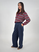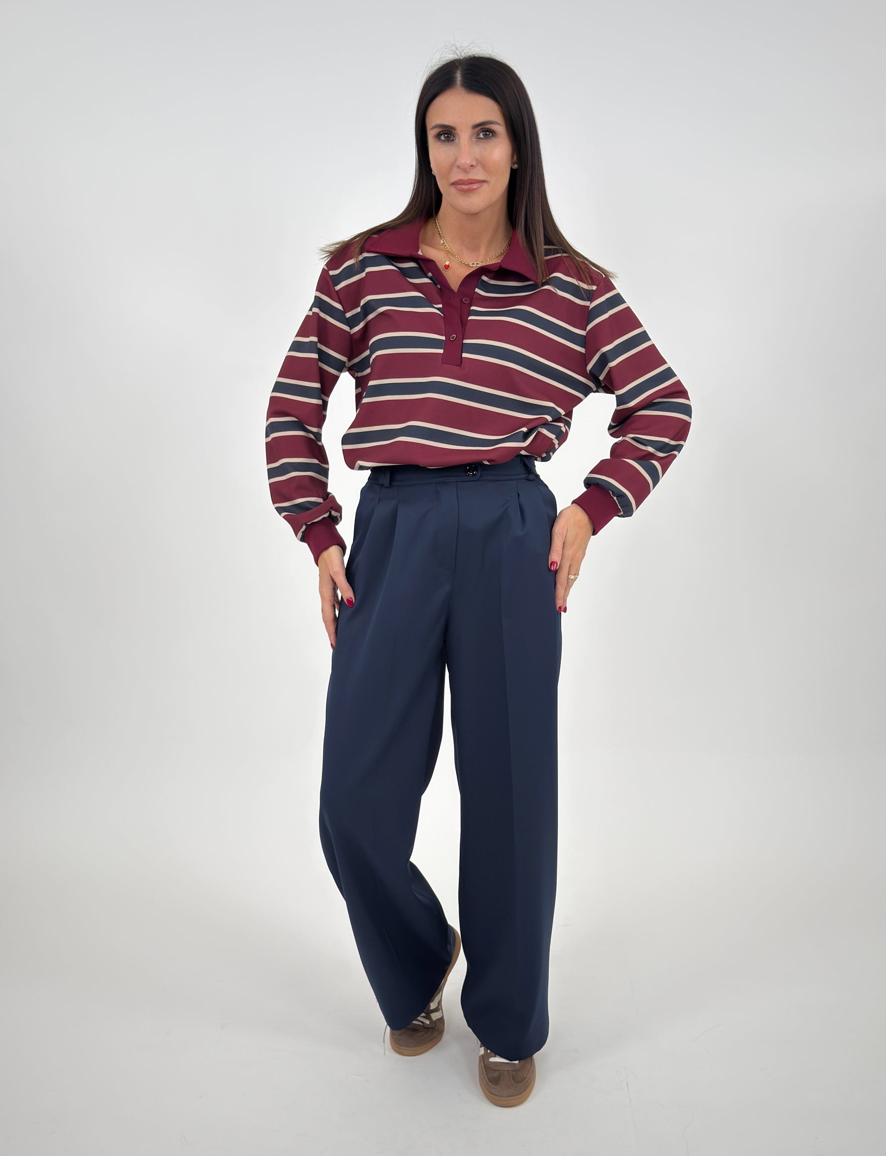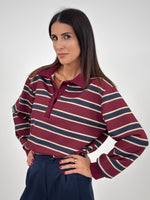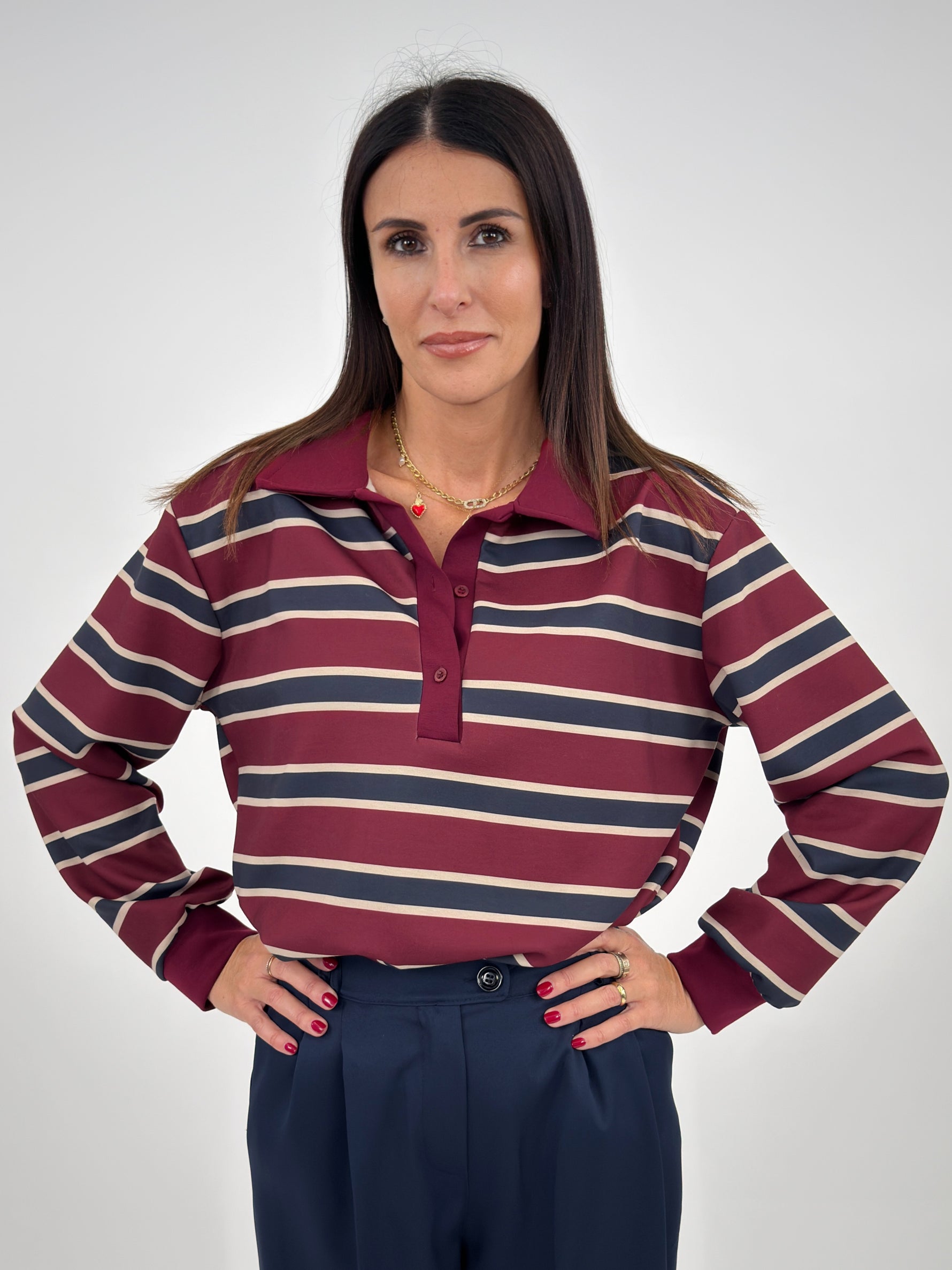 Maglia modello polo con colletto e bottoncini sul davanti con motivo a righe orizzontali a contrasto di colore. Maniche lunghe con polsino finale.