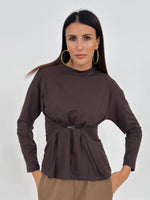 Maglia modello lungo girocollo. Maniche lunghe con spalline imbottite. Dettaglio frontale con clip metallica.