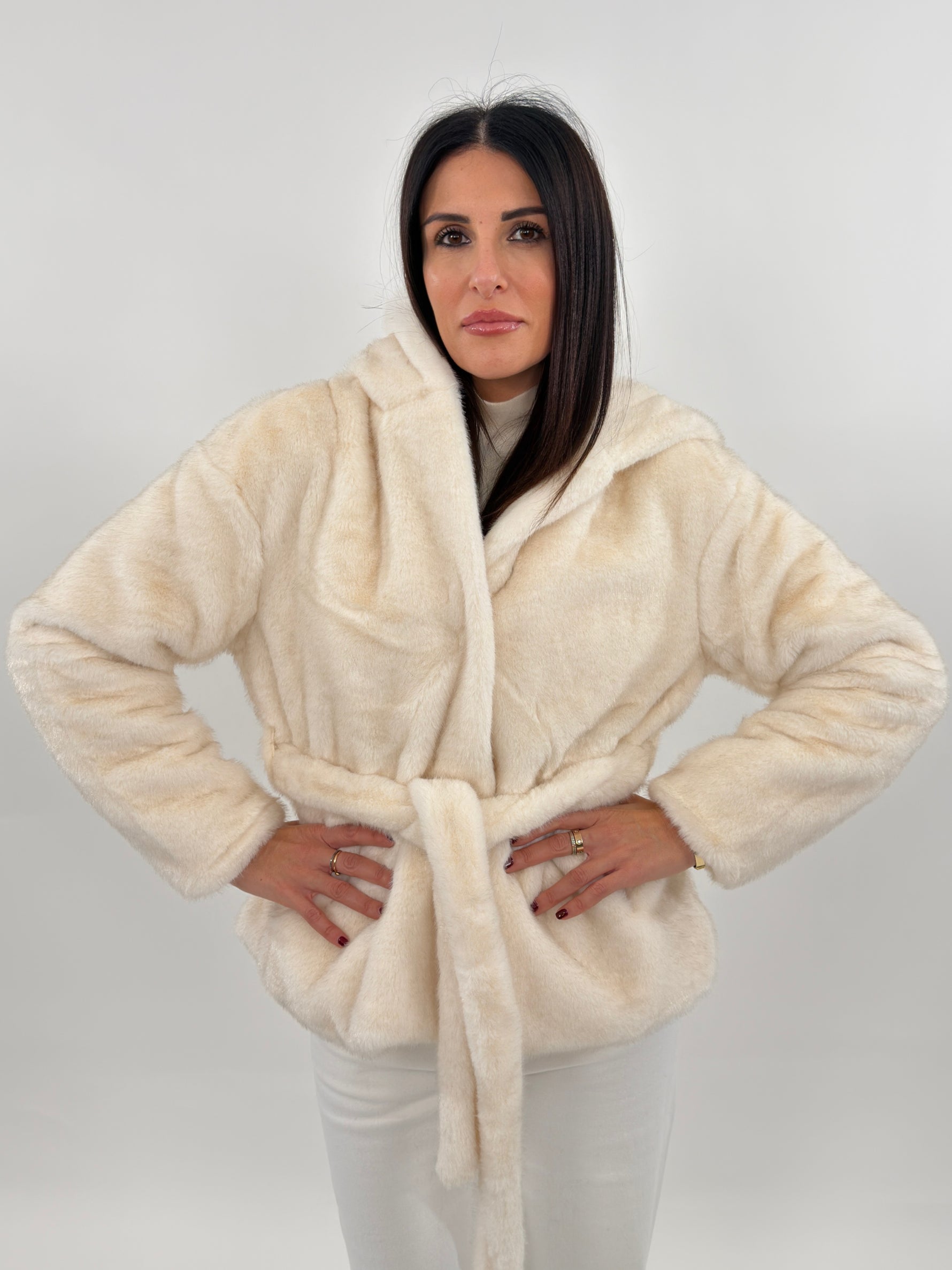 Tra i Nuovi Arrivi in casa Amishops Vi presnetiamo la nostra EcoPelliccia sintetica Budapest modello lunghezza media con cappuccio e fodera interna. Maniche lunghe e tasche laterali. Chiusura frontale con bottoni a pressione e cintura in vita.