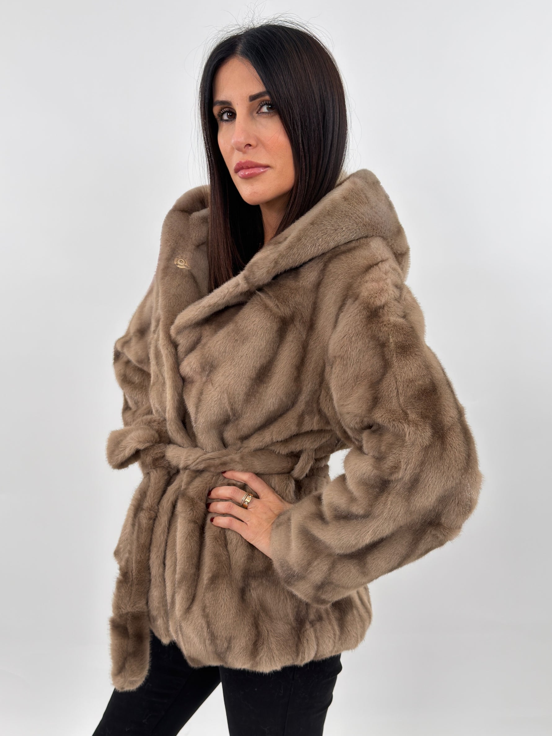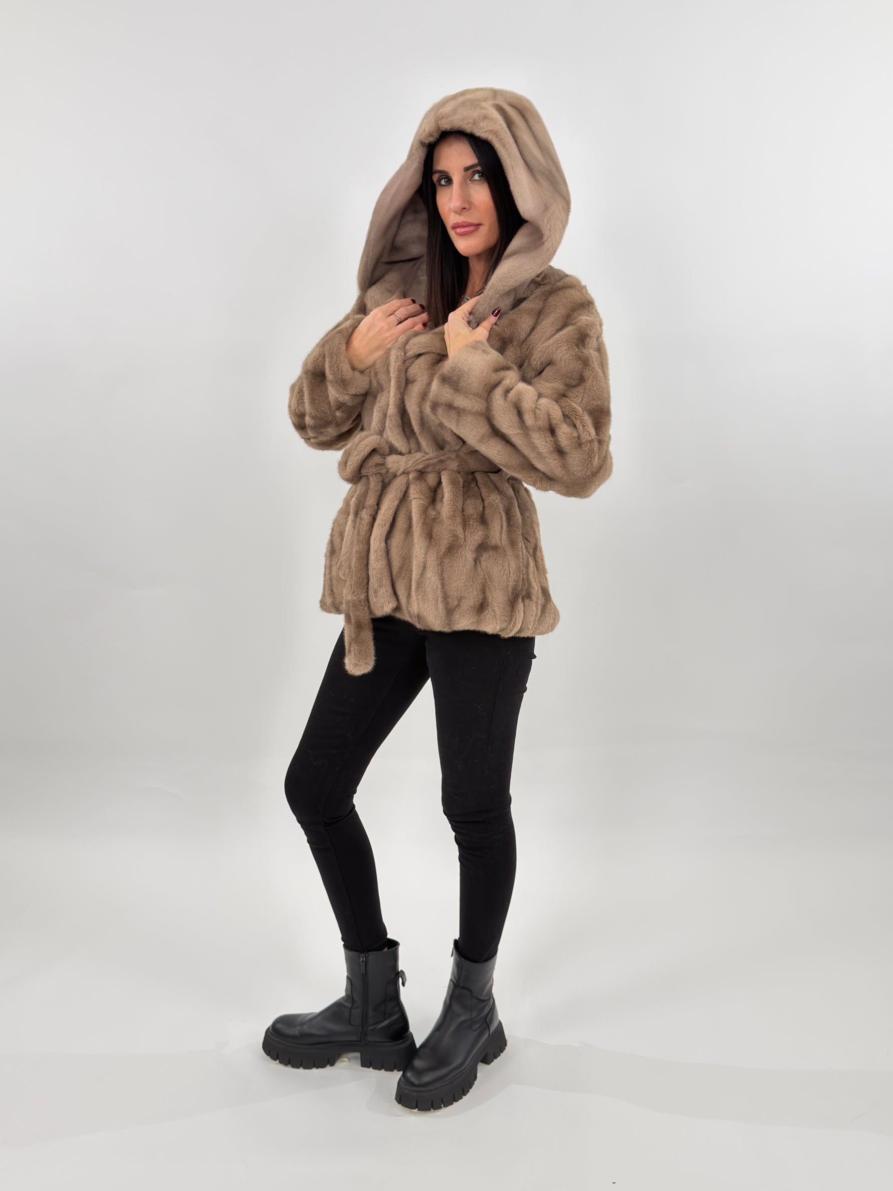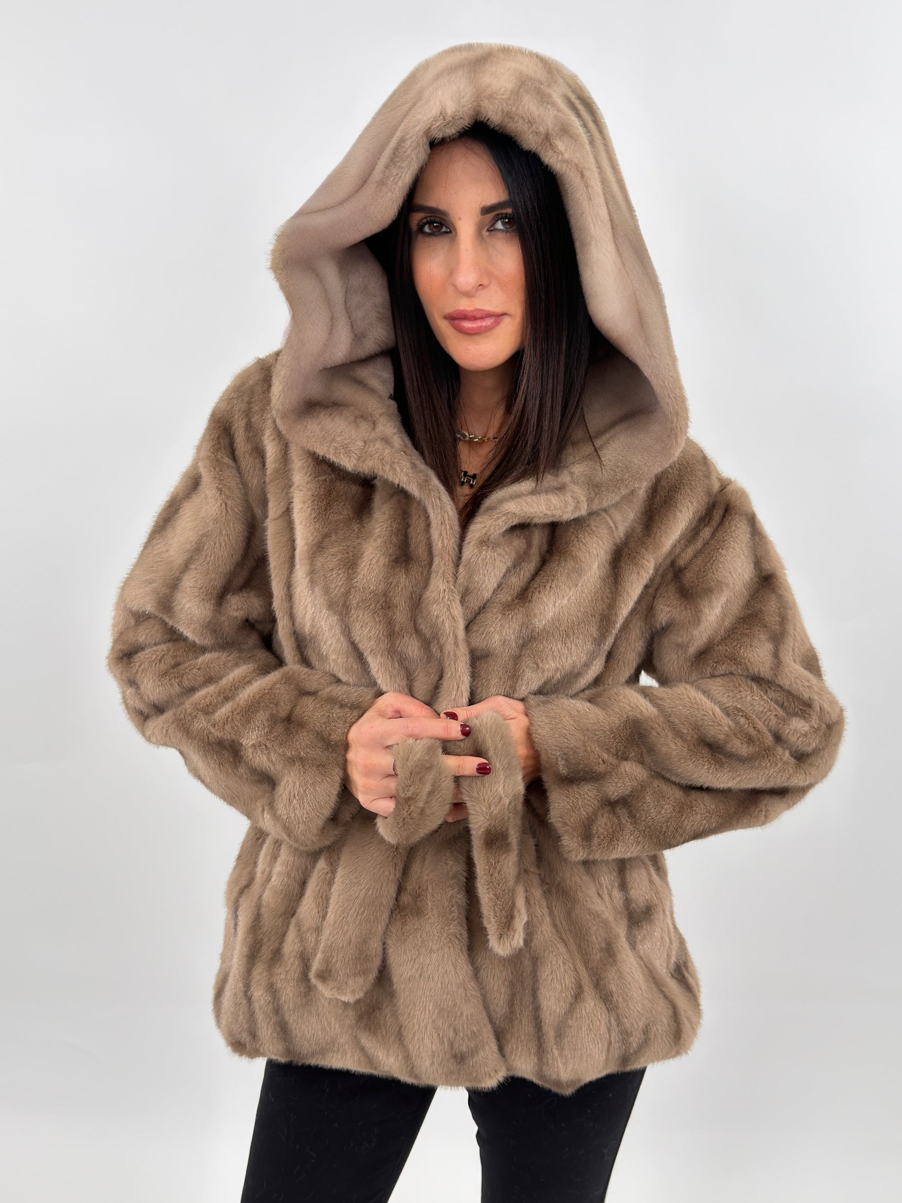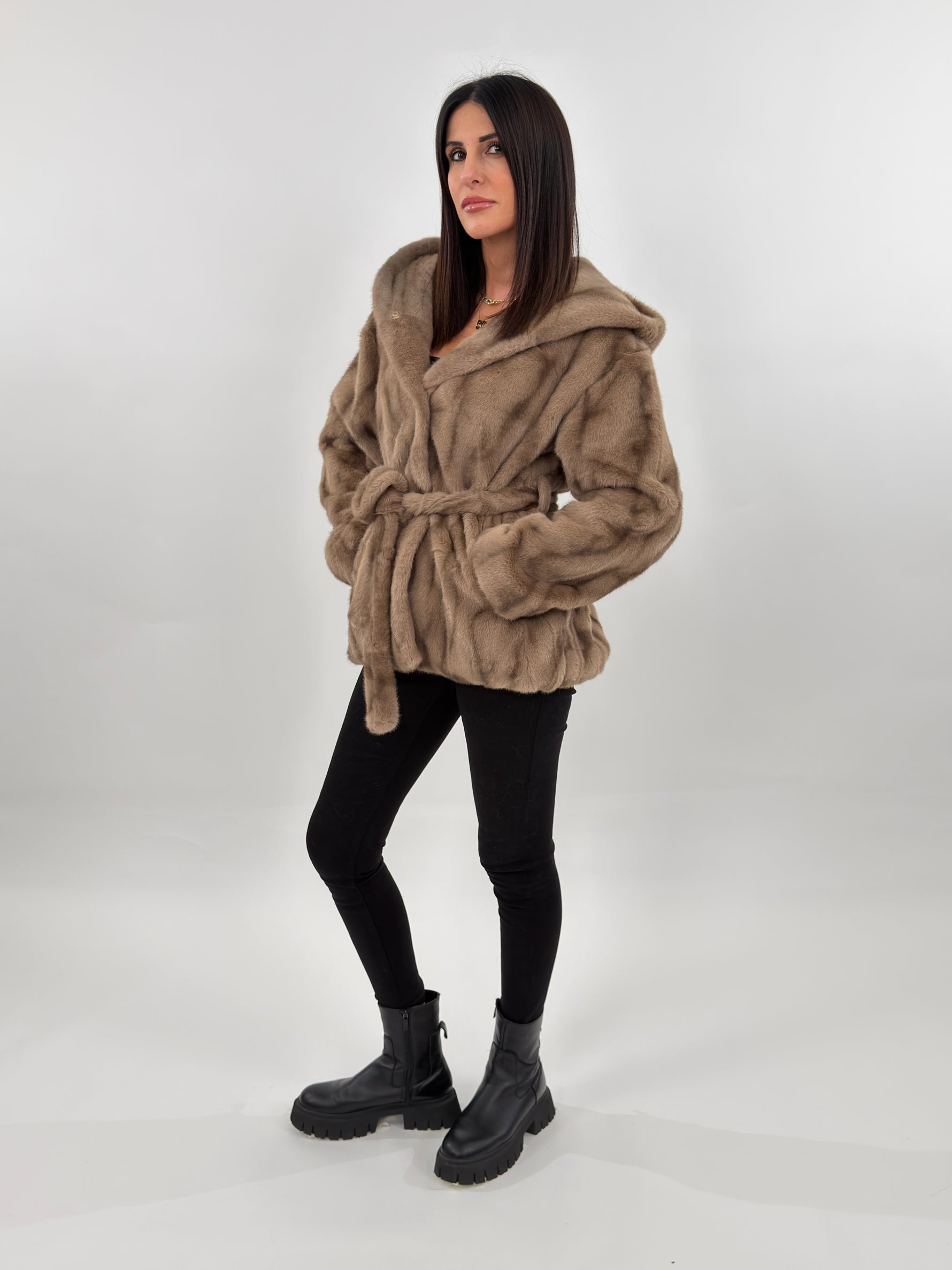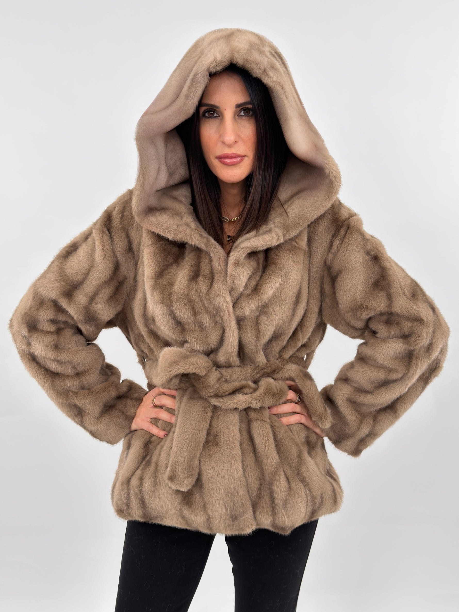 Tra i Nuovi Arrivi in casa Amishops Vi presnetiamo la nostra EcoPelliccia sintetica Budapest modello lunghezza media con cappuccio e fodera interna. Maniche lunghe e tasche laterali. Chiusura frontale con bottoni a pressione e cintura in vita.