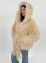 Pelliccia sintetica modello corto con cappuccio. Maniche lunghe e tasche laterali.