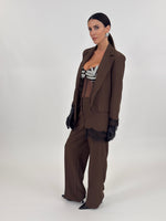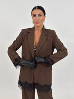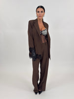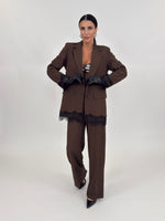 Tailleur composto da giacca modello monopetto, tasche frontali con patta e maniche lunghe con spalline imbottite. Dettaglio ricamo in pizzo ai polsi e sul fondo della giacca. Pantalone a gamba larga con tasche laterali, bustino con elastico sul retro. Chiusura con zip e bottone.