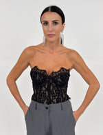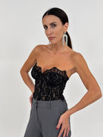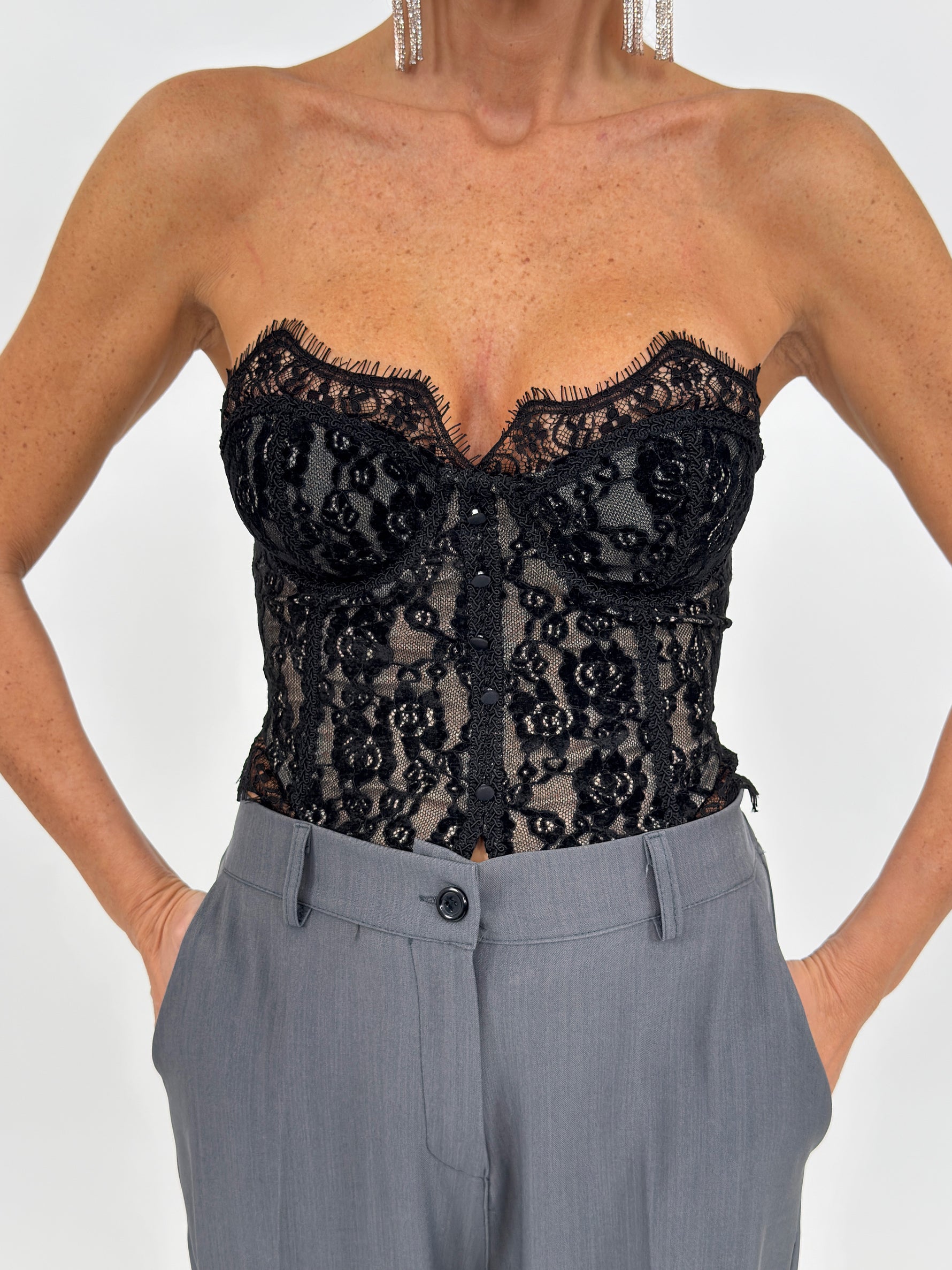 Top in pizzo con coppe preformate e spalline sottili regolabili. Rifinito con bordature in pizzo lavorato. Finti bottoncini sul davanti e chiusura sul retro con zip.