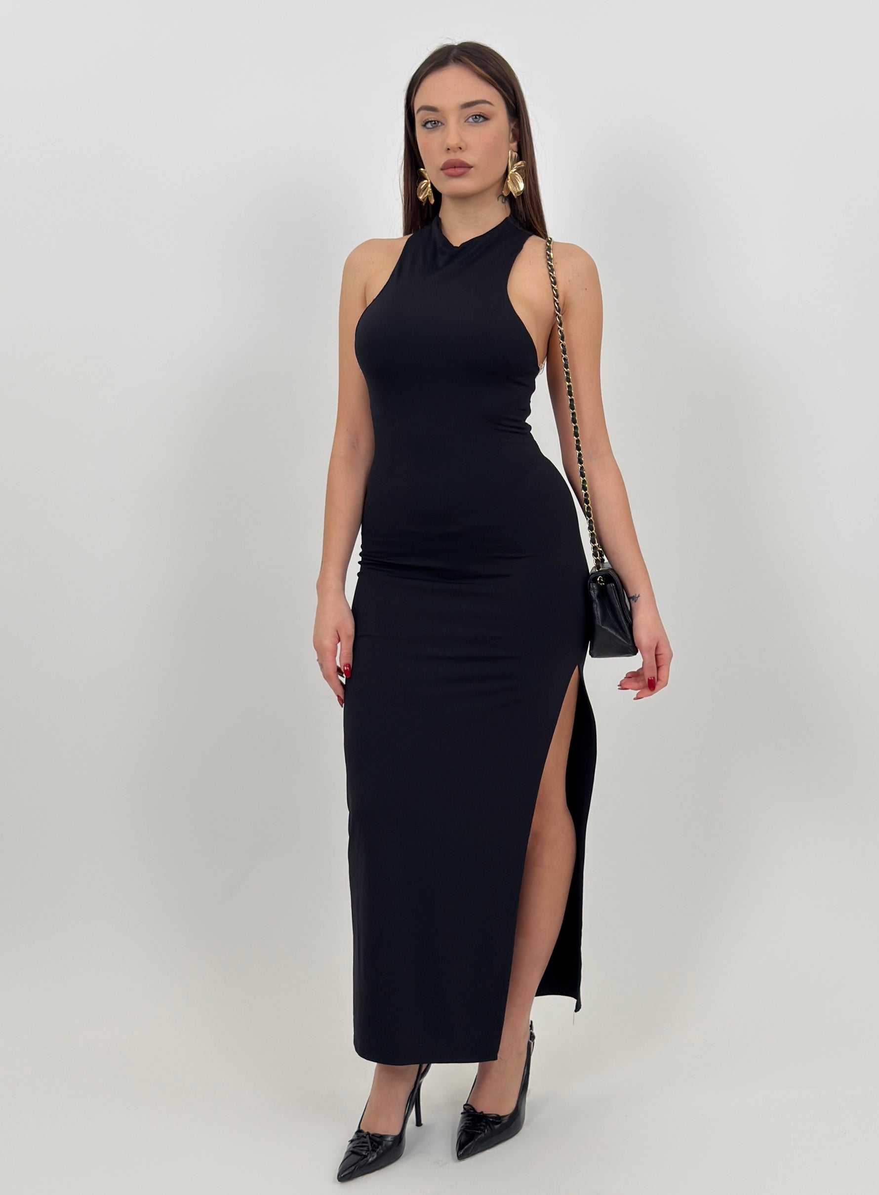 Abito in effetto lycra, modello lungo giromanica con spacco laterale.
