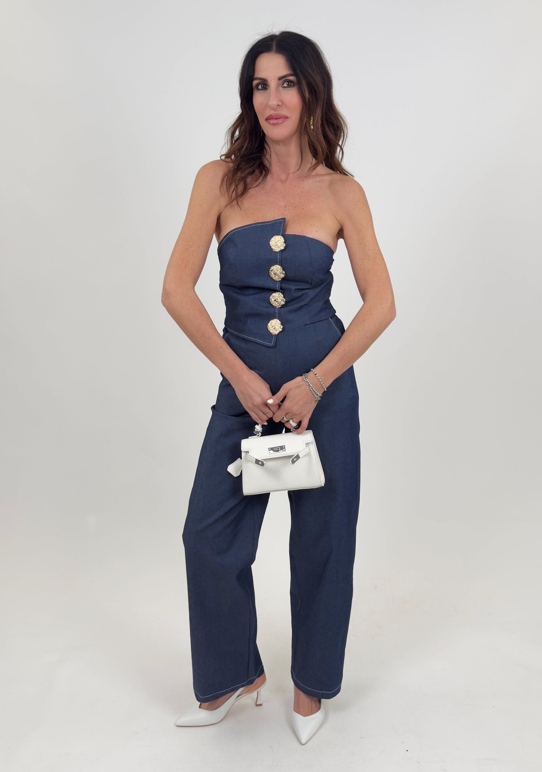 Tuta modello lungo in denim scuro, modello con gamba larga, modello a fascia con retro elastico e tasche laterali. Presenta spille frontali nel colore oro.