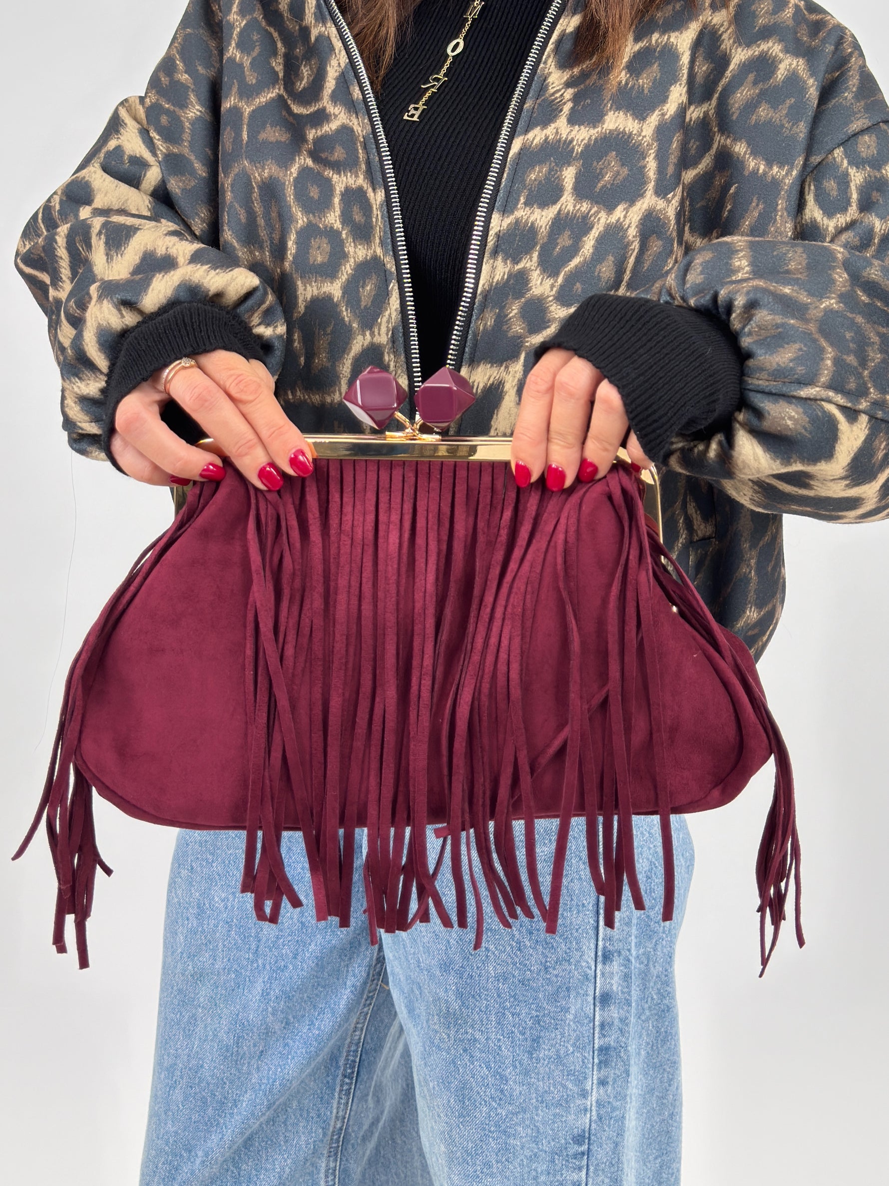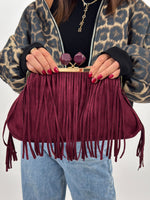 Borsa modello clutch in effetto camoscio con frange sul davanti. Chiusura a scatto in metallo dorato con pietre geometriche bordeaux come pomelli decorativi. Dotata di tasca piatta interna e tasca con zip. Esclusa di tracolla.