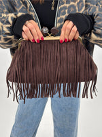 Borsa modello clutch in effetto camoscio con frange sul davanti. Chiusura a scatto in metallo dorato con pietre geometriche marroni come pomelli decorativi. Dotata di tasca piatta interna e tasca con zip. Esclusa di tracolla.