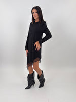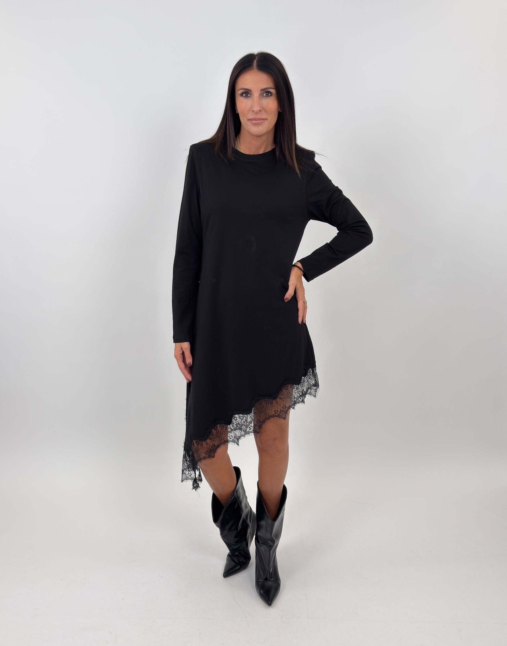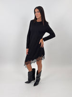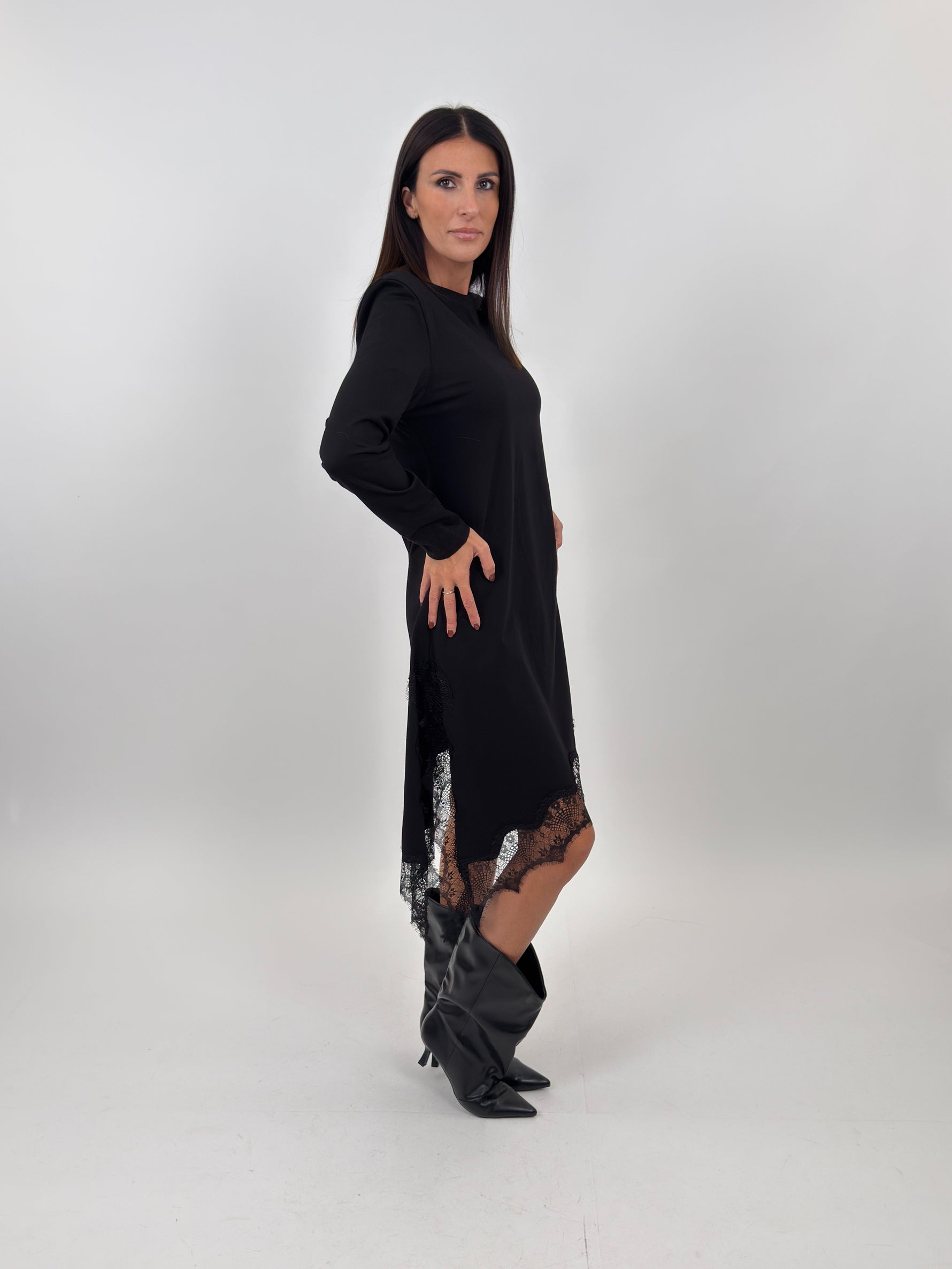 Abito targato LUMINA modello lungo girocollo con parte basse realizzata in pizzo trasparente con motivo floreale. Maniche lunghe con spalline imbottite.