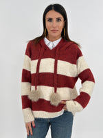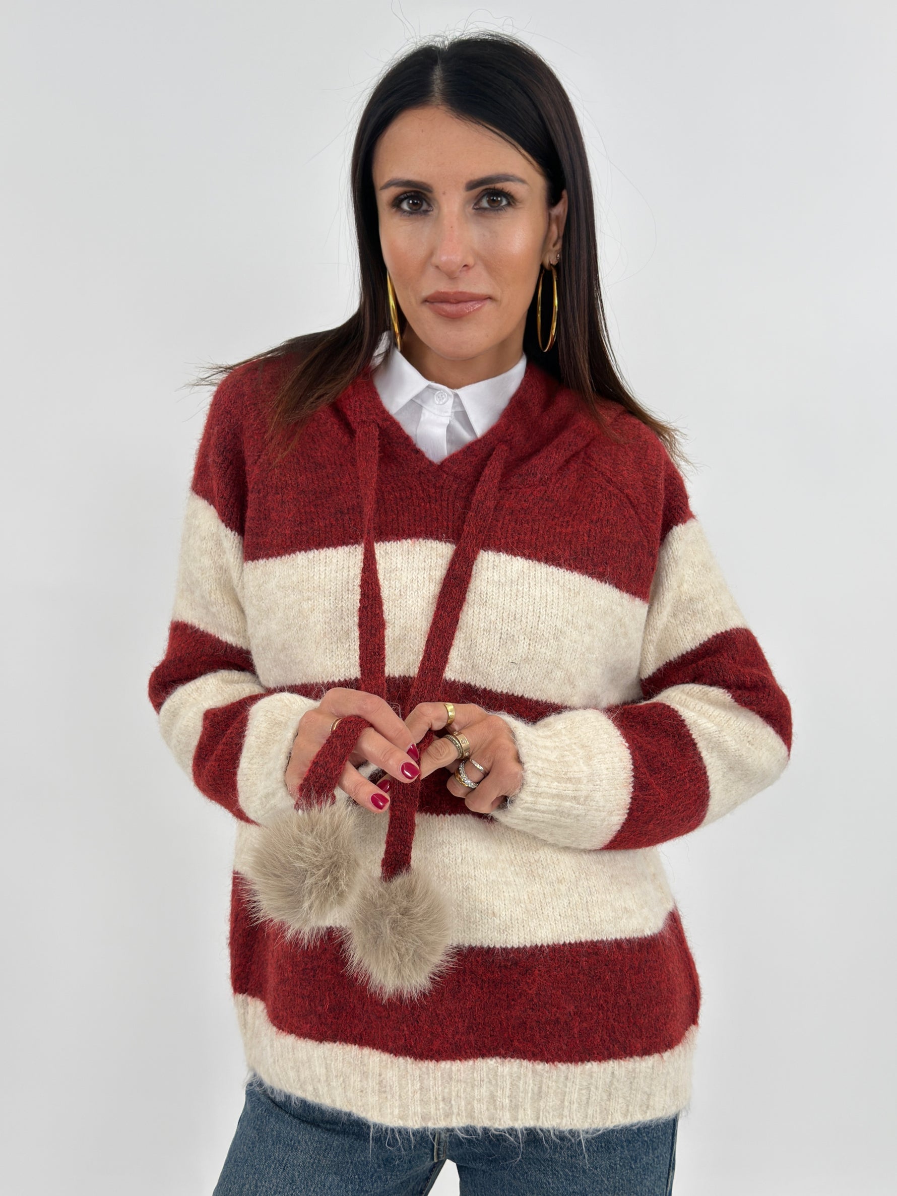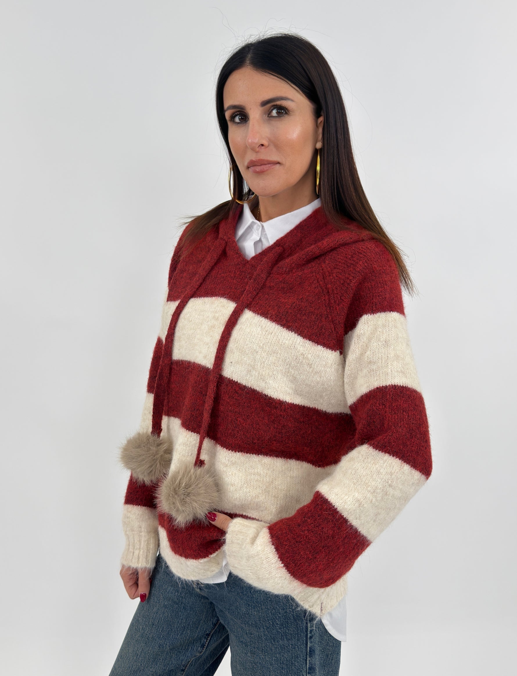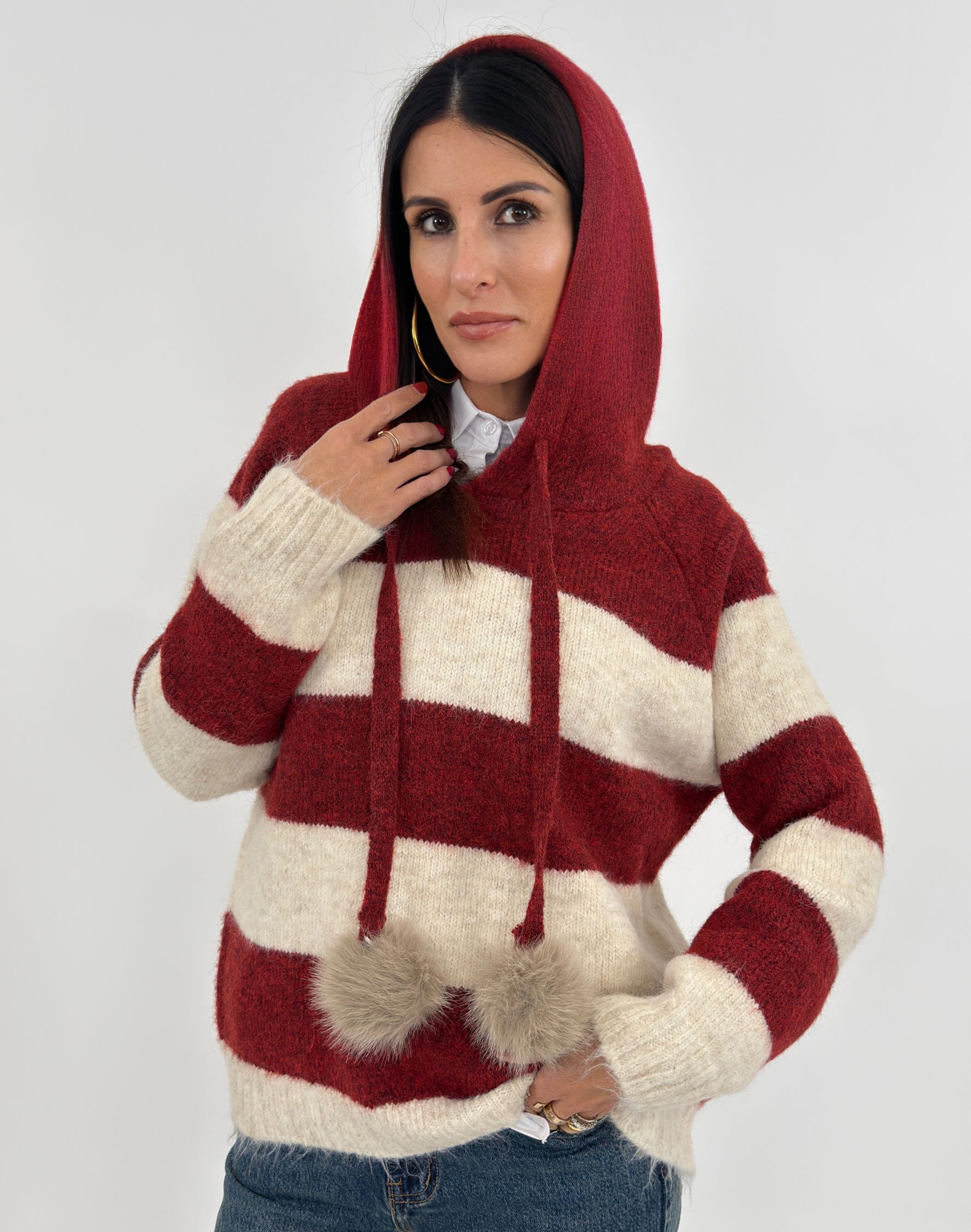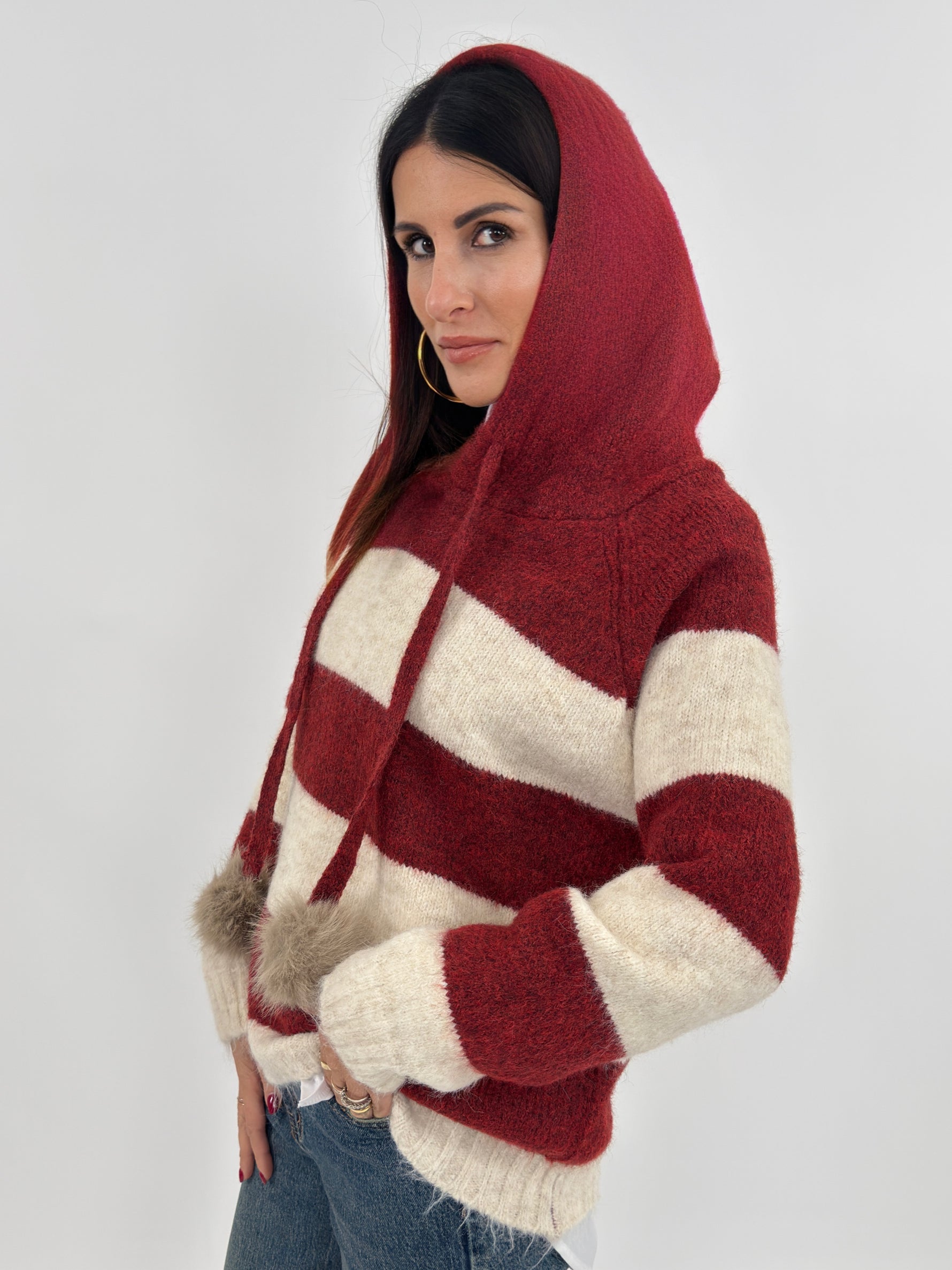 Maglia modello felpa lungo nella trama a righe orizzontali. Maniche lunghe con spalle cadenti e polsino finale a coste. Cappuccio e laccetti con pompon di pelliccia sintetica nel colore beige.