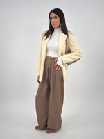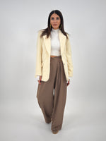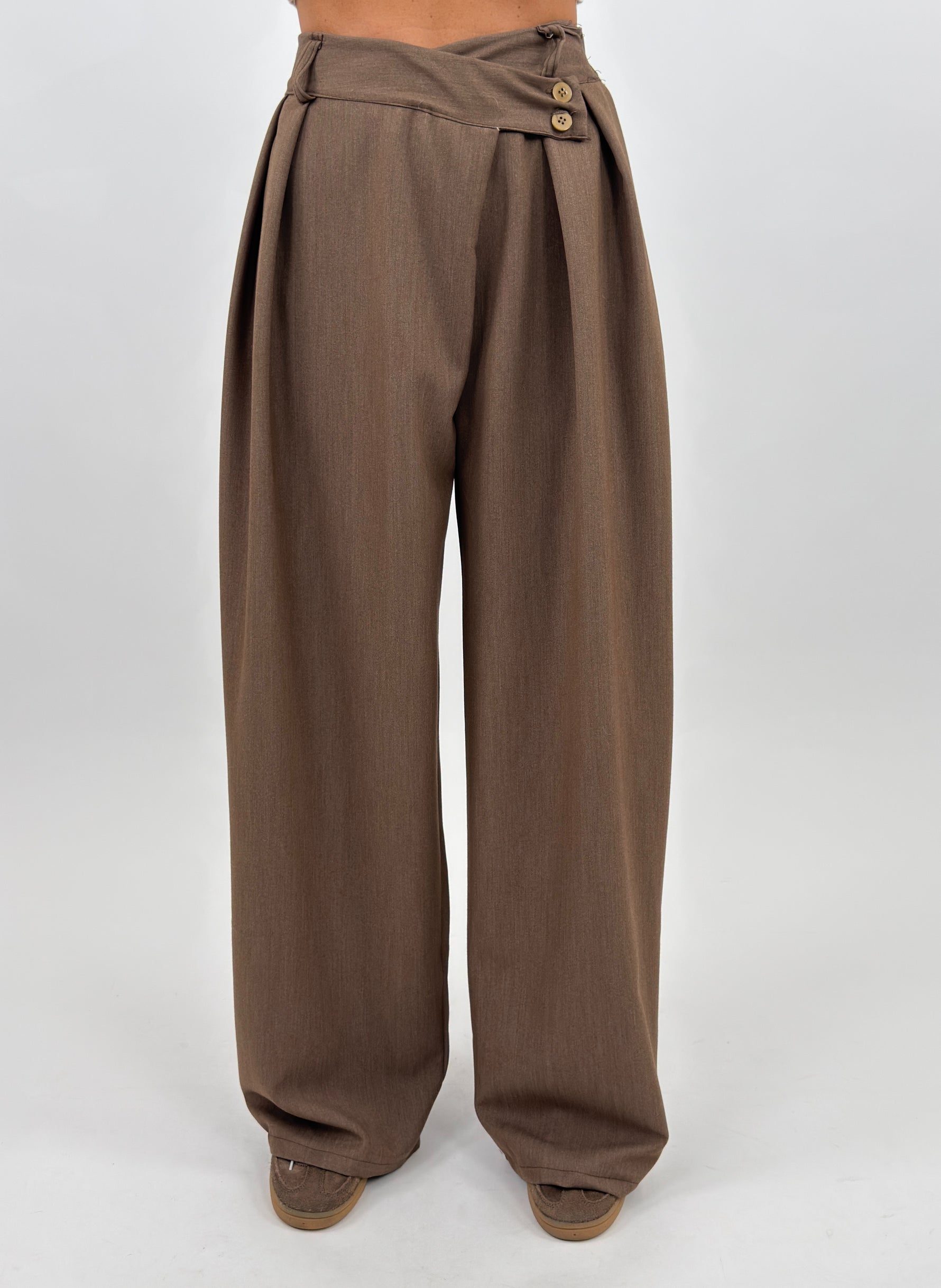 Pantalone a gamba larga con pinces sul davanti. Bustino con elastico sul retro e chiusura asimmetrica con due bottoni sul lato sinistro e zip.