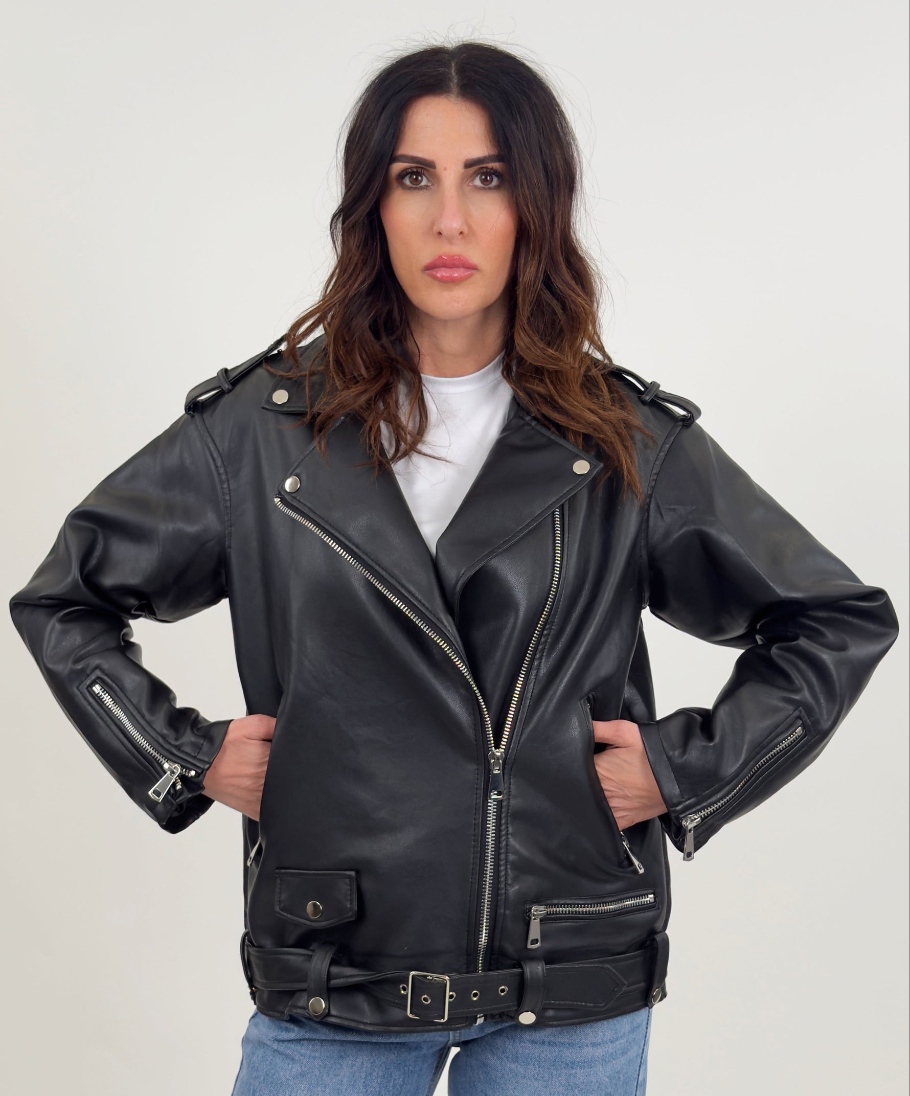 Giubbotto in ecopelle modello Bikers Oversize, a maniche lunghe con cerniera e passanti sulle spalle. Tasche laterali con cerniera. Fondo con cintura non rimovibile e fibbia.