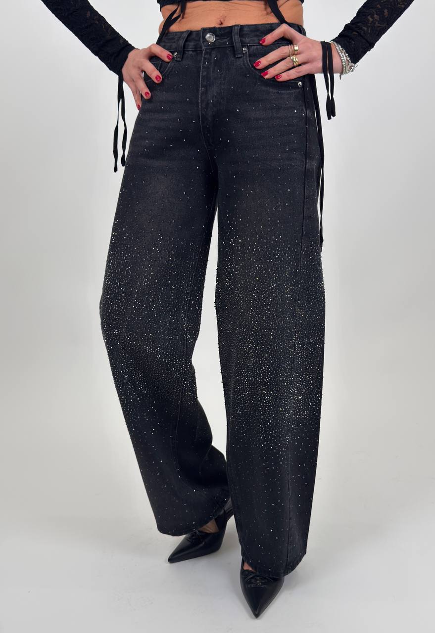 Jeans in denim blu modello balloon. Presenta cinque tasche e micro brillantini sul d'avanti e sul retro. Chiusura con zip e bottone.