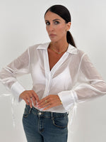 Camicia modello lungo in effetto velato, scollo a V e maniche lunghe con laccetti ai polsi. Drappeggio laterale e chiusura con asola e bottoncini frontali.
