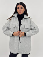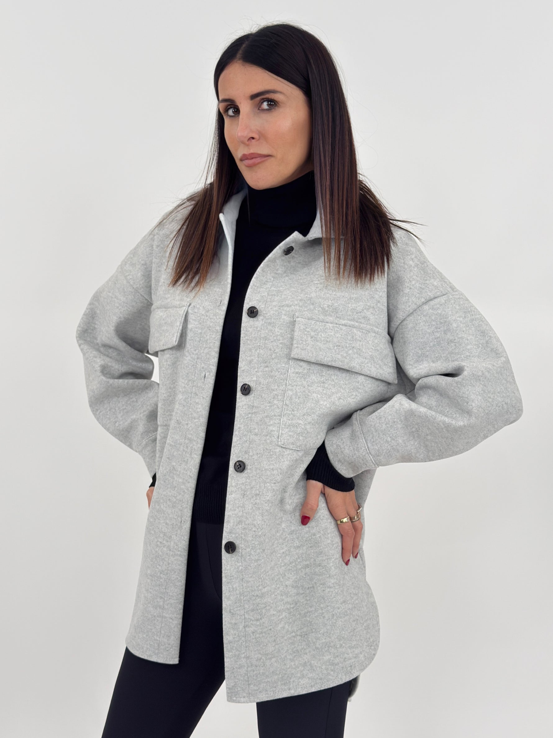 Camicia in panno modello oversize, maniche lunghe con spalle cadenti. Tasche frontali con patta e chiusura con asola e bottoni. Taglio asimmetrico sul fondo.