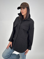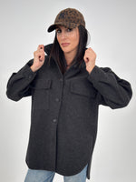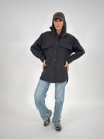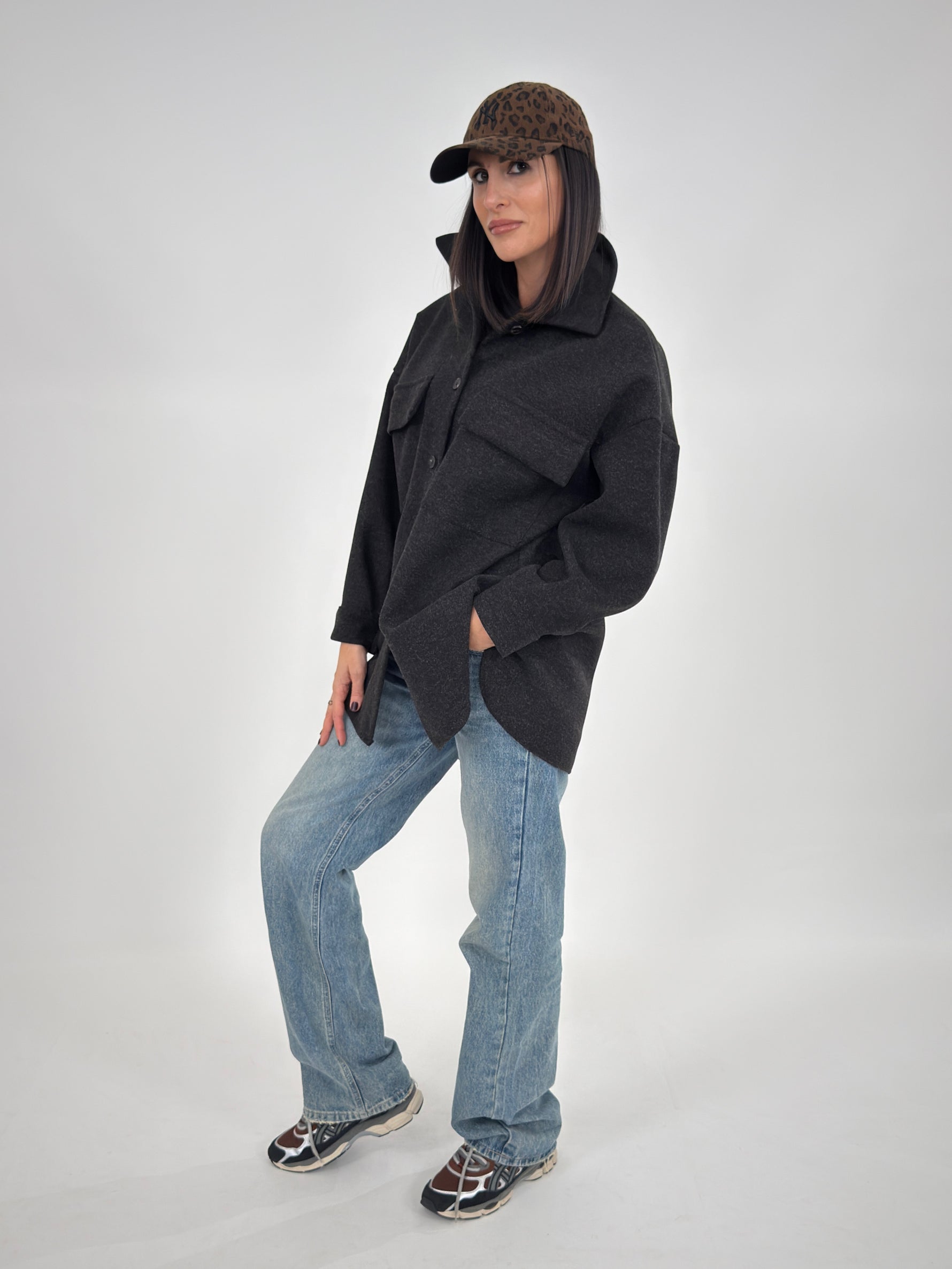 Camicia in panno modello oversize, maniche lunghe con spalle cadenti. Tasche frontali con patta e chiusura con asola e bottoni. Taglio asimmetrico sul fondo.