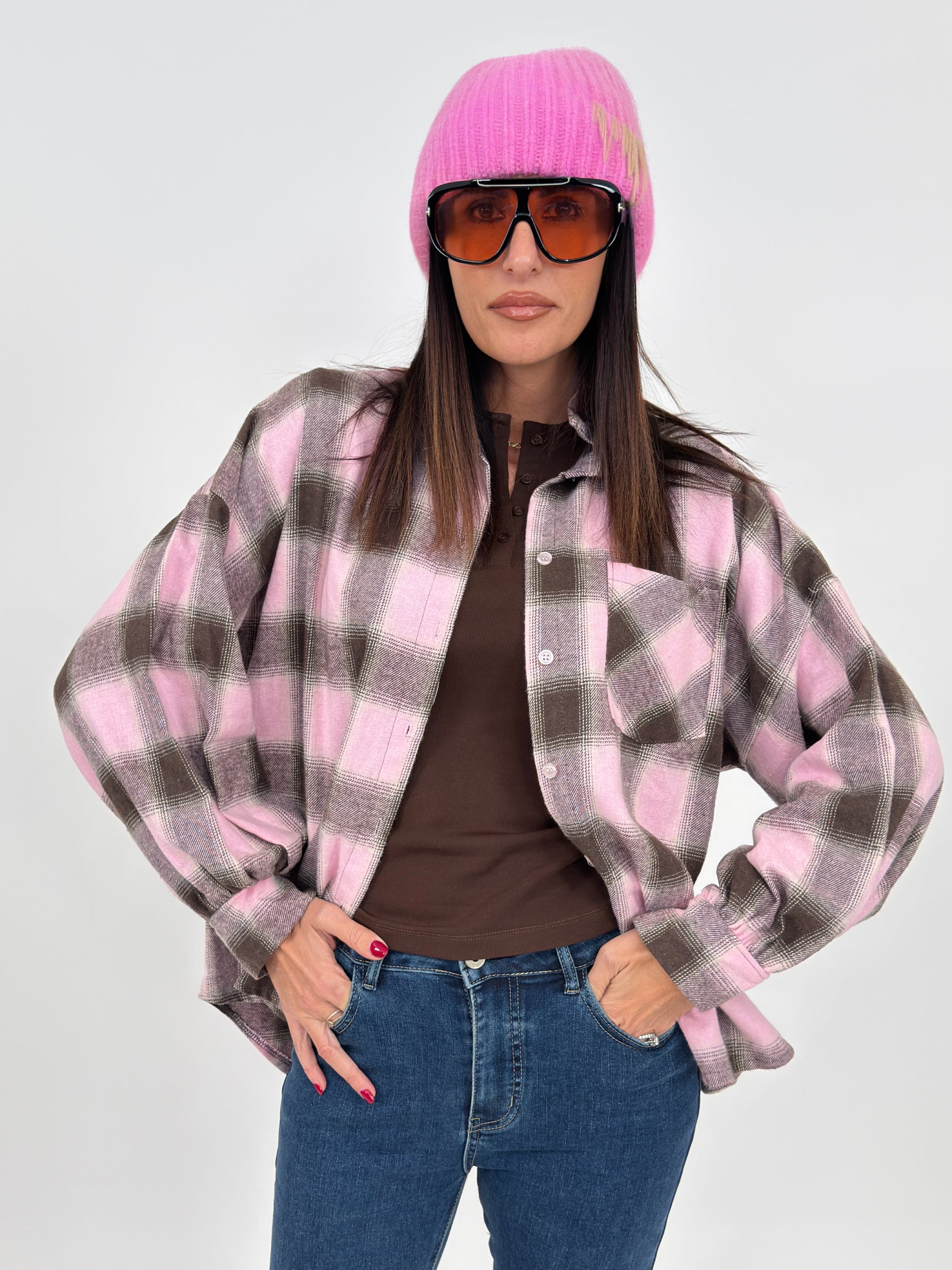 Camicia modello lungo nella trama a quadri, maniche lunghe con spallina imbottita, polsino finale con bottoncino e taschino frontale. Chiusura con bottoncini frontali.