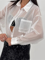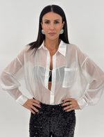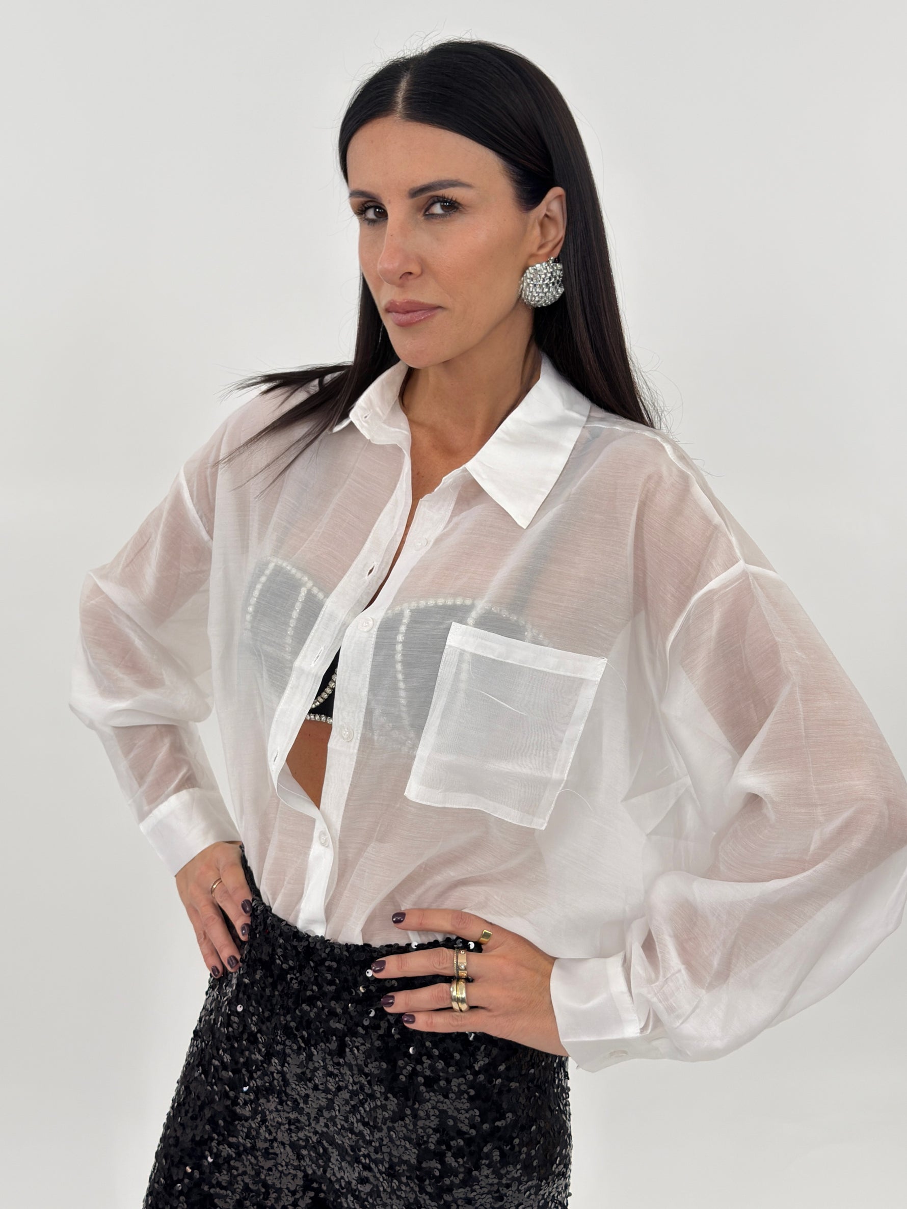 Camicia modello lungo in effetto velato, presenta taschino sul d'avanti e maniche lunghe con polsino e bottoncino. Chiusura frontale con asola e bottoncini.