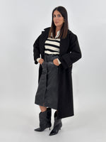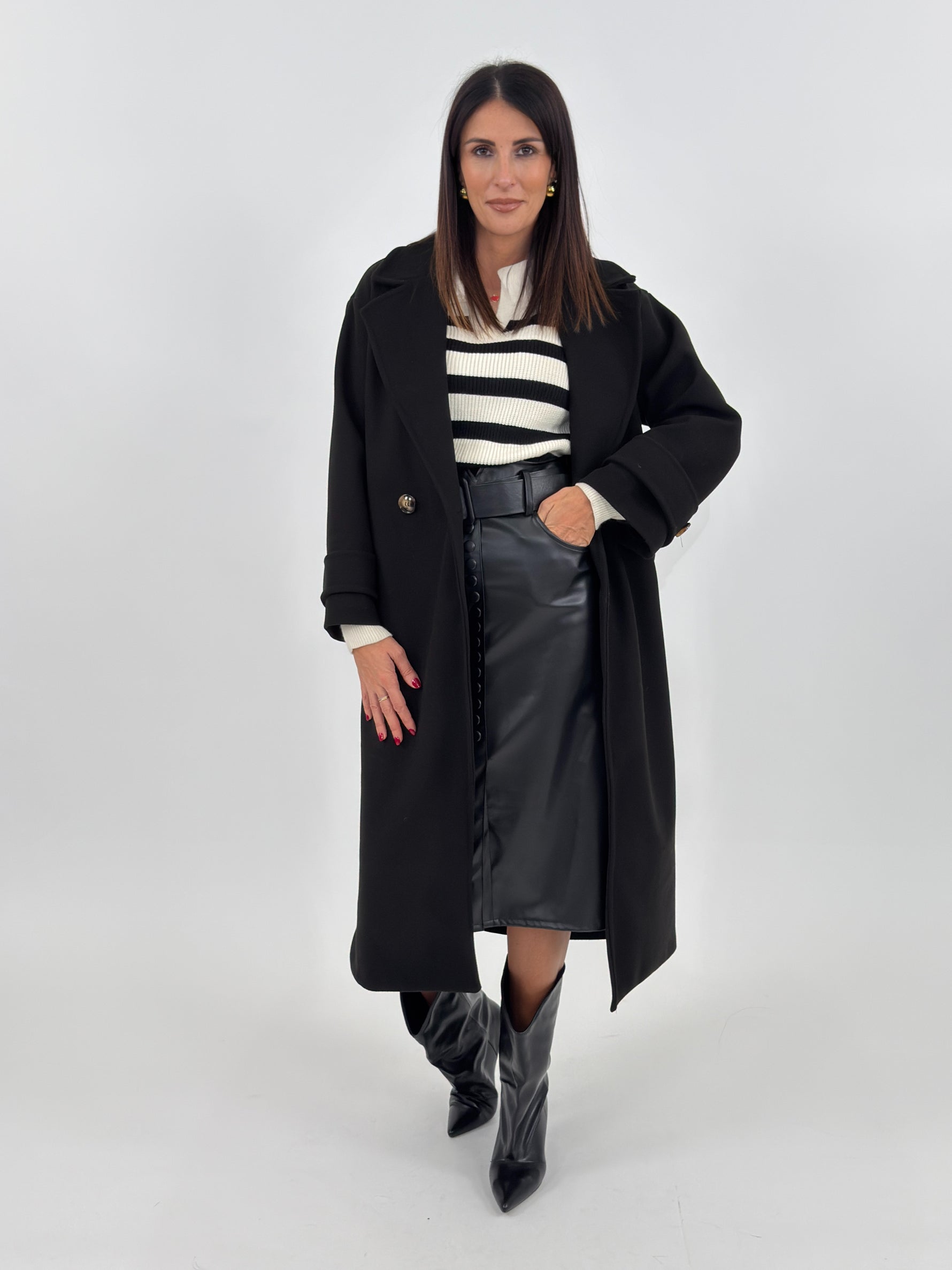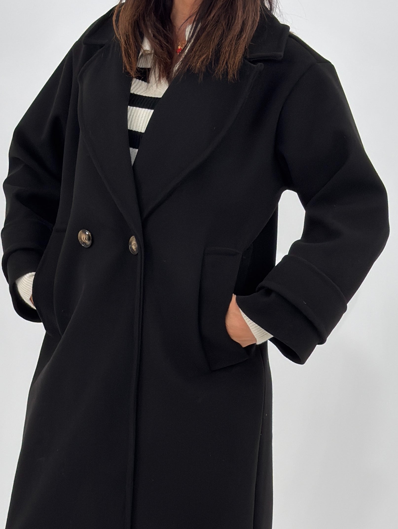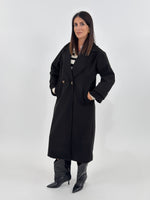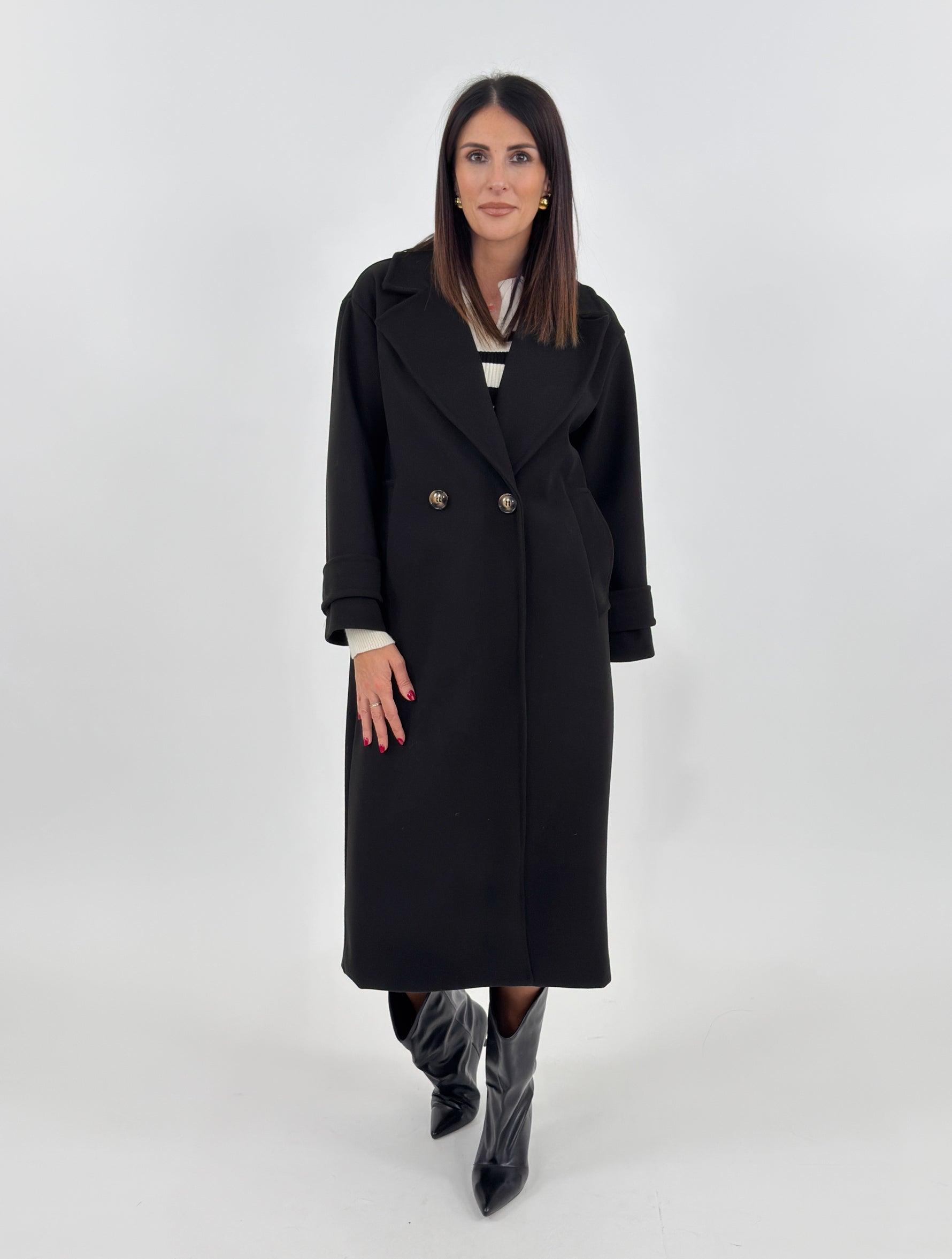 Cappotto modello lungo doppio petto, tasche laterali, maniche lunghe con passanti sul polsino. Chiusura frontale con bottone. Fodera interna.