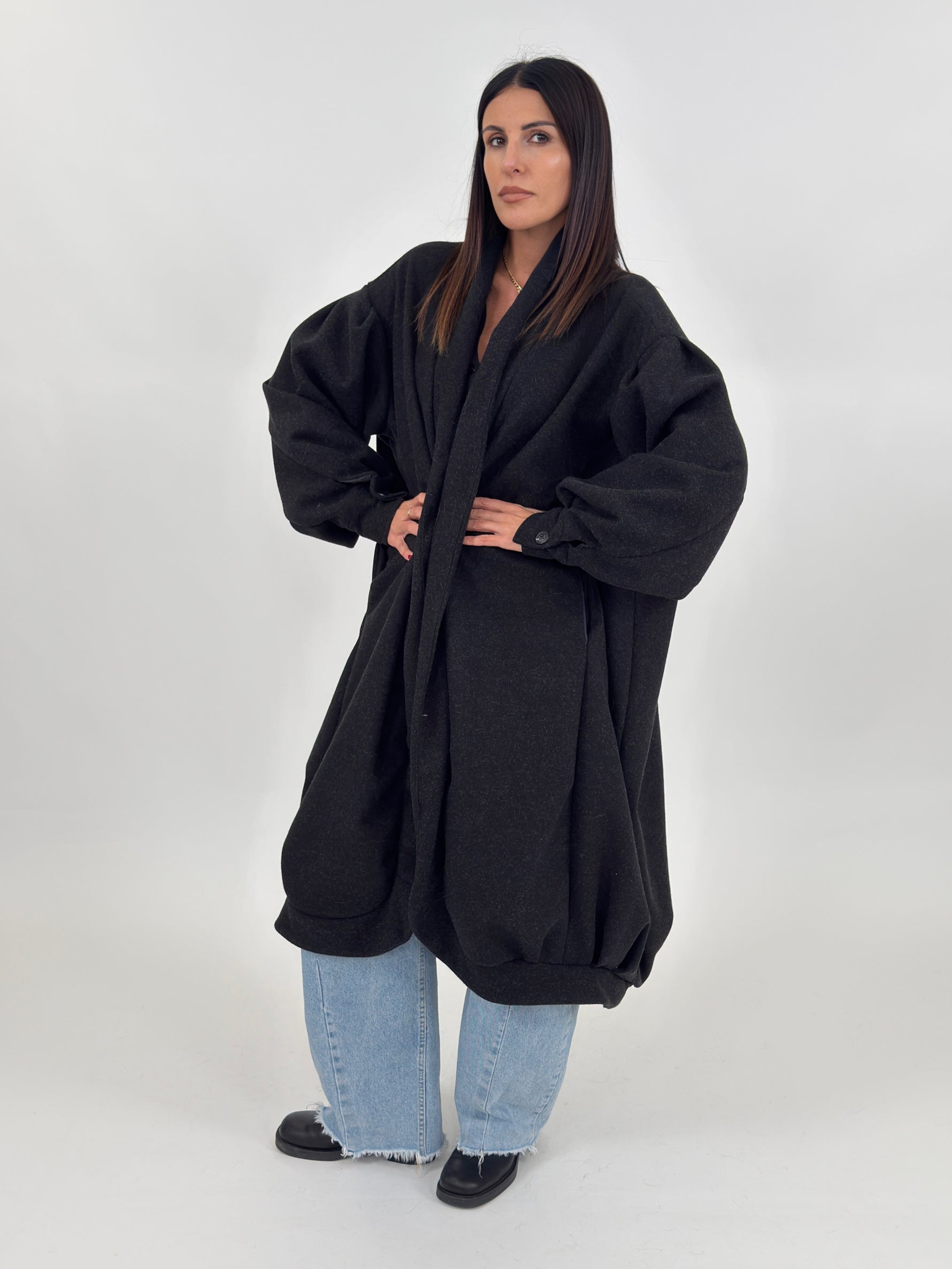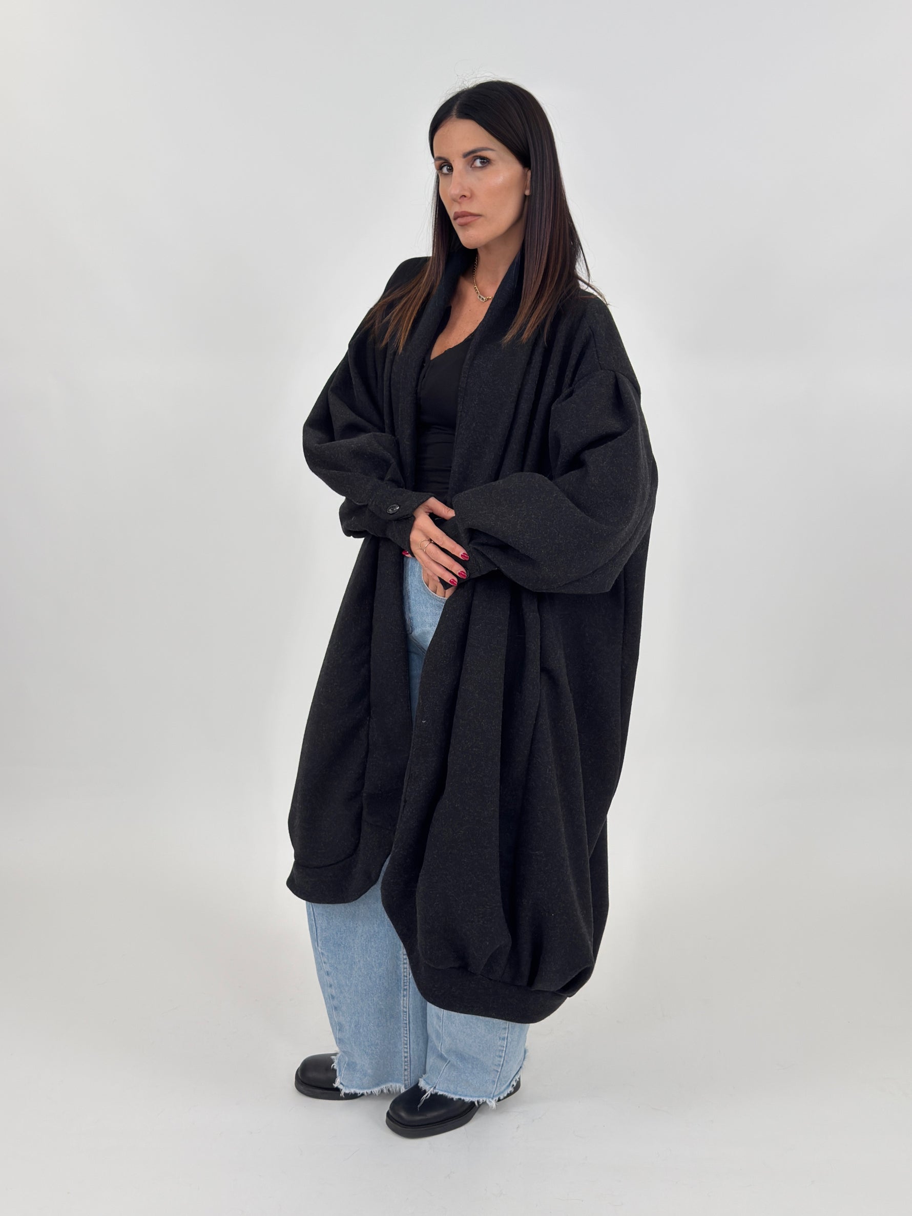 Cappotto modello lungo ad uovo con collo a scialle, manica lunga con polsino finale. Tasche laterali e fodera interna.