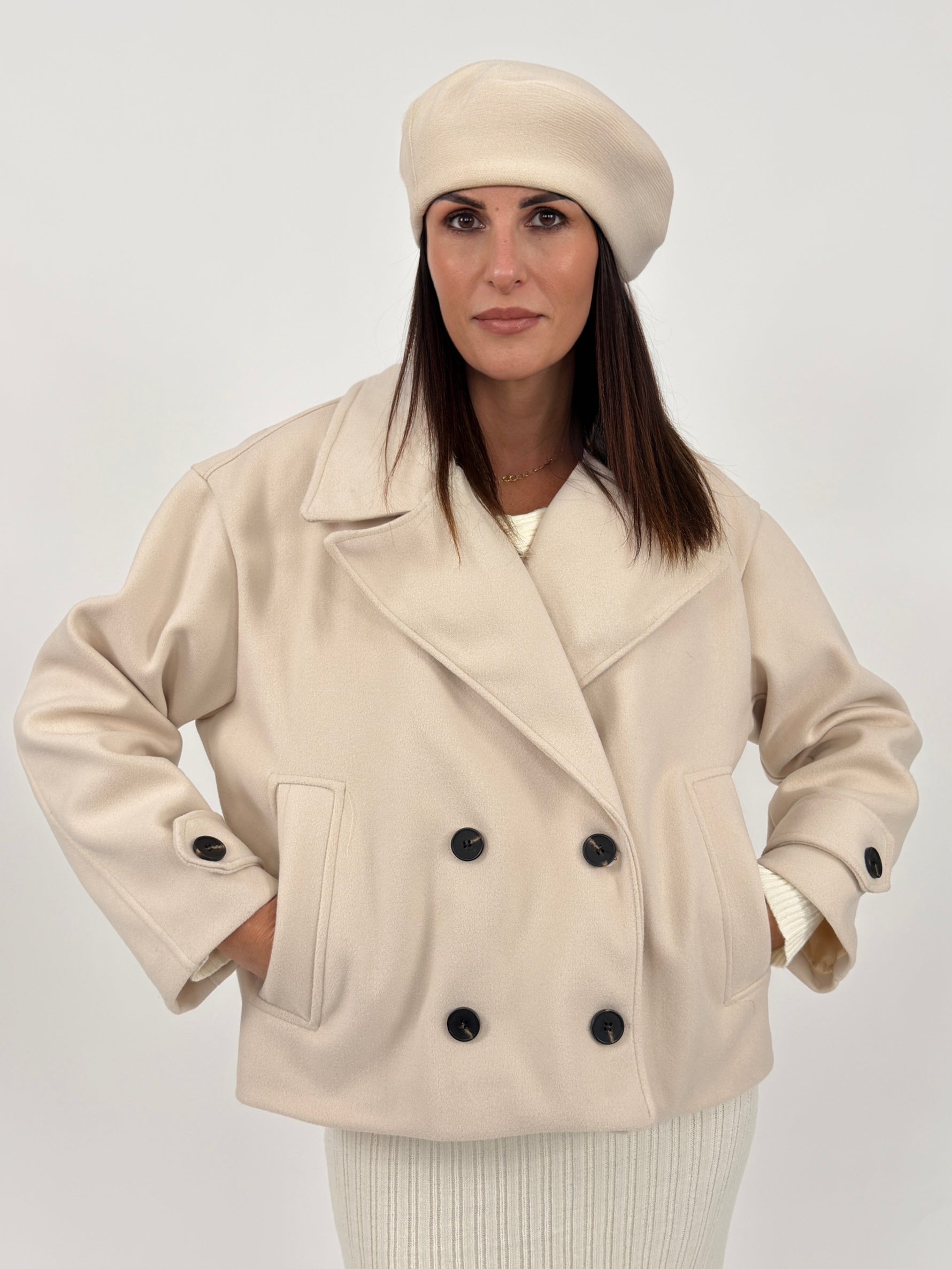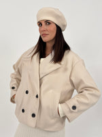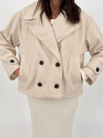 Cappotto corto modello doppiopetto con revers, maniche lunghe e tasche a filo. Chiusura con bottoni.