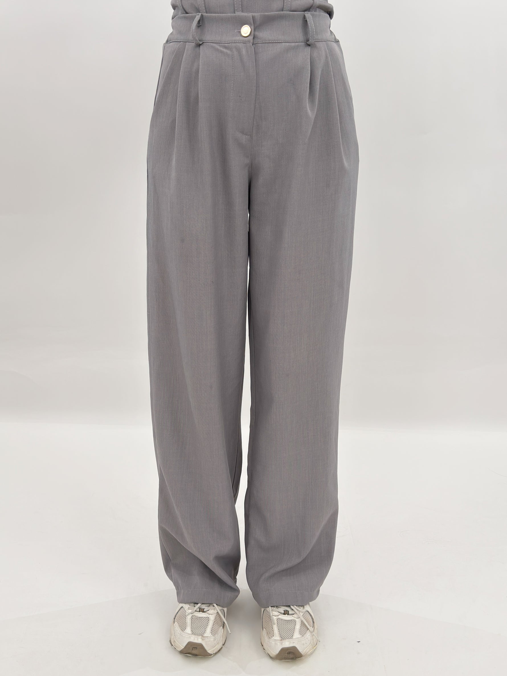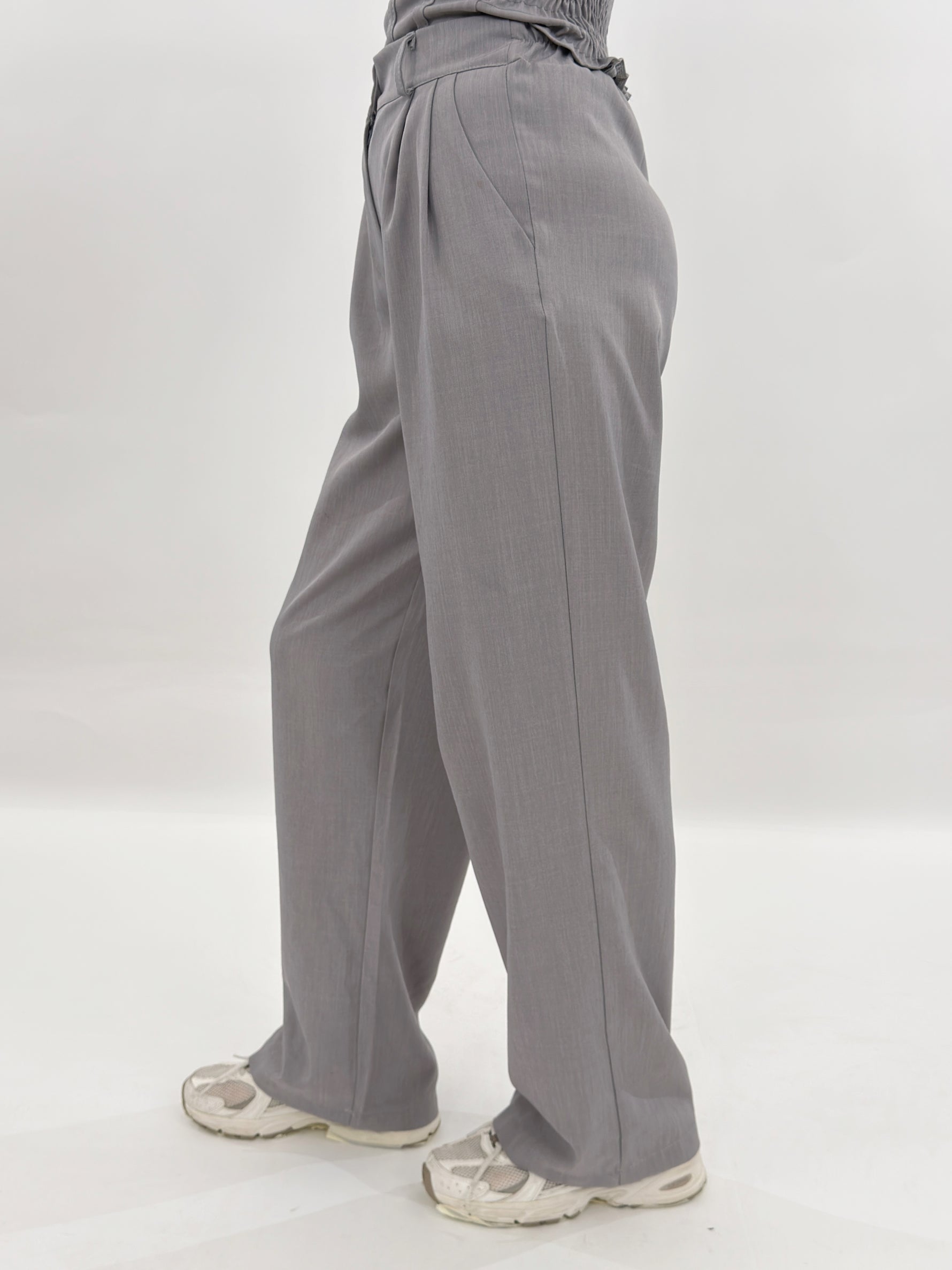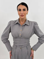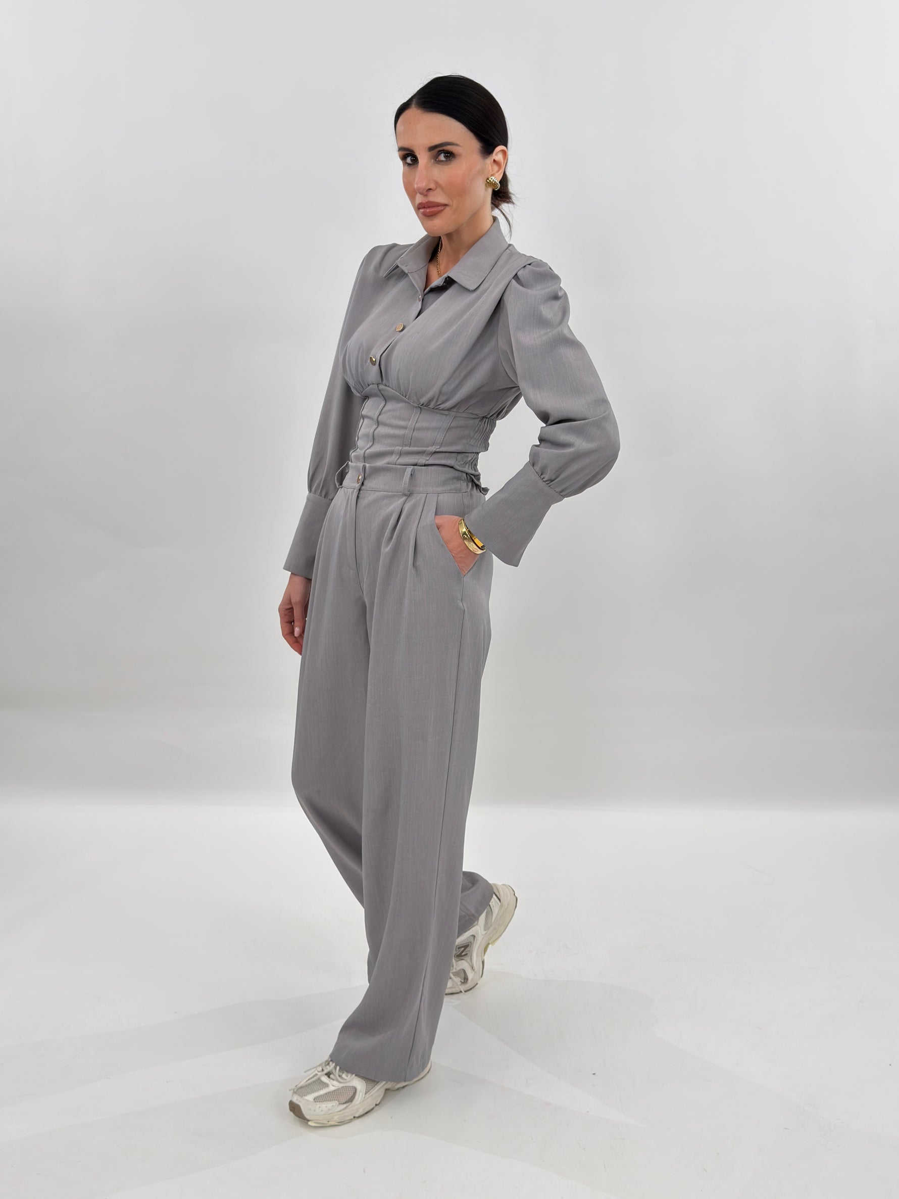 Cordset composto da camicia con maniche a sbuffo e corpetto strutturato. Fascia elastica sul retro e chiusura frontale con bottoni. Pantalone a gamba larga con tasche laterali. Bustino elastico sul retro e chiusura con zip e bottone.