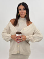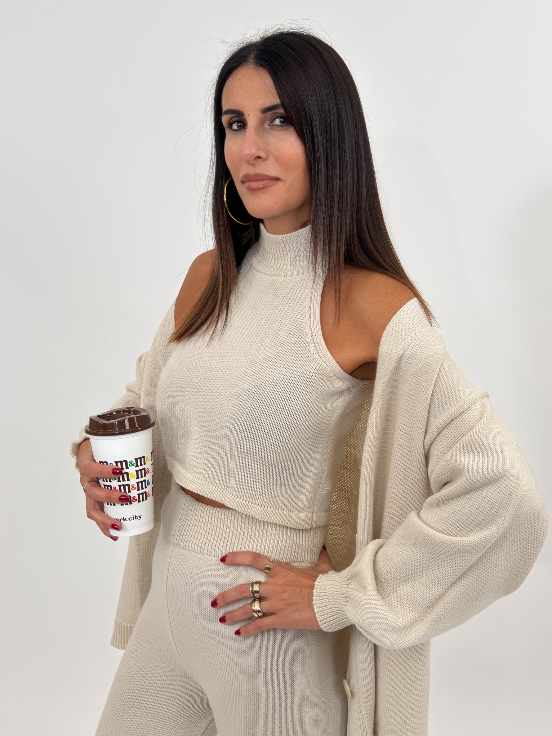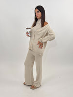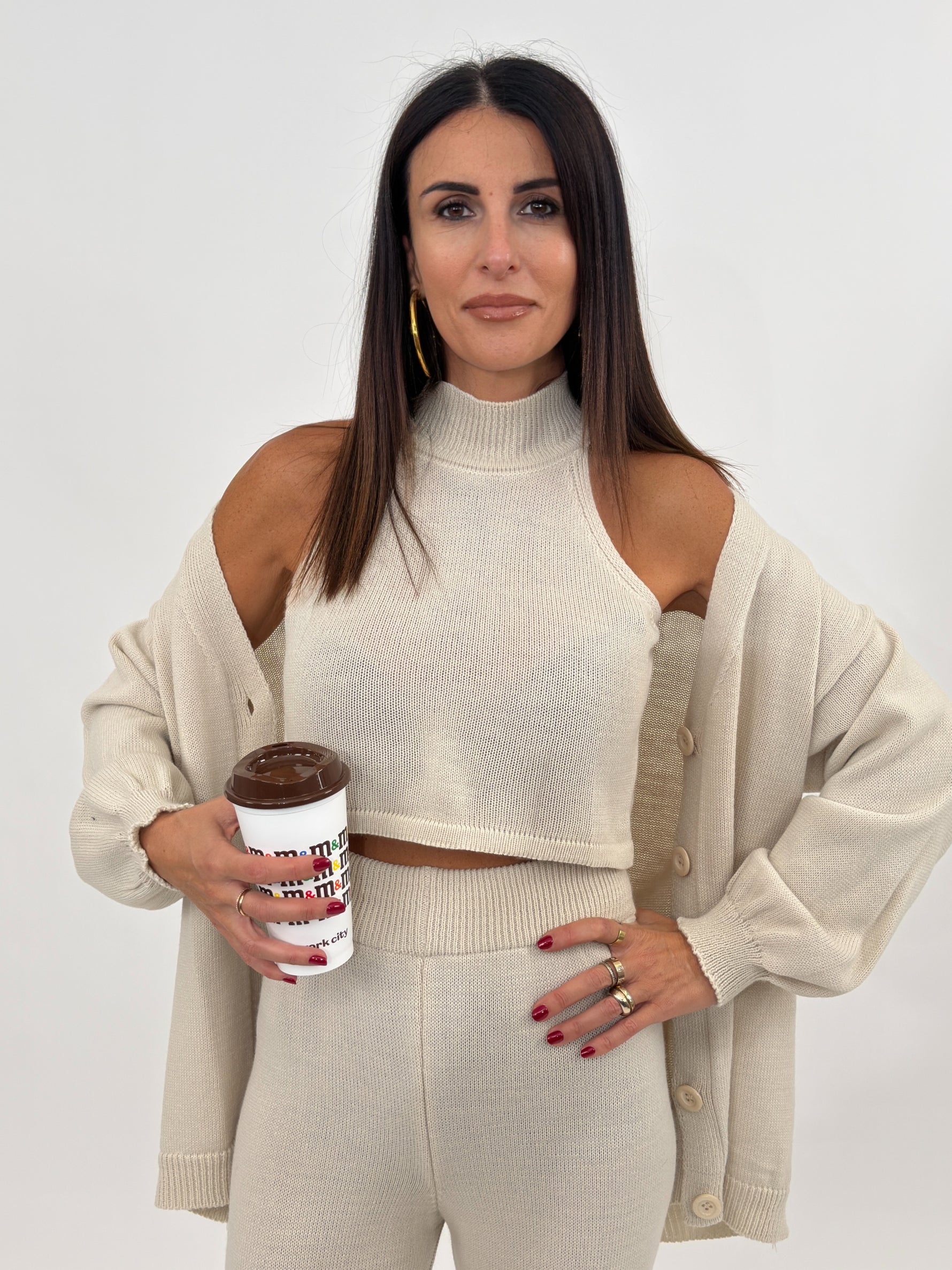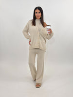 Cordset composto da tre pezzi: maglia modello cardigan manica lunga con polsino finale e chiusura frontale con bottoni. Top modello mezzocollo giromanica. Pantalone a gamba larga con bustino elastico.