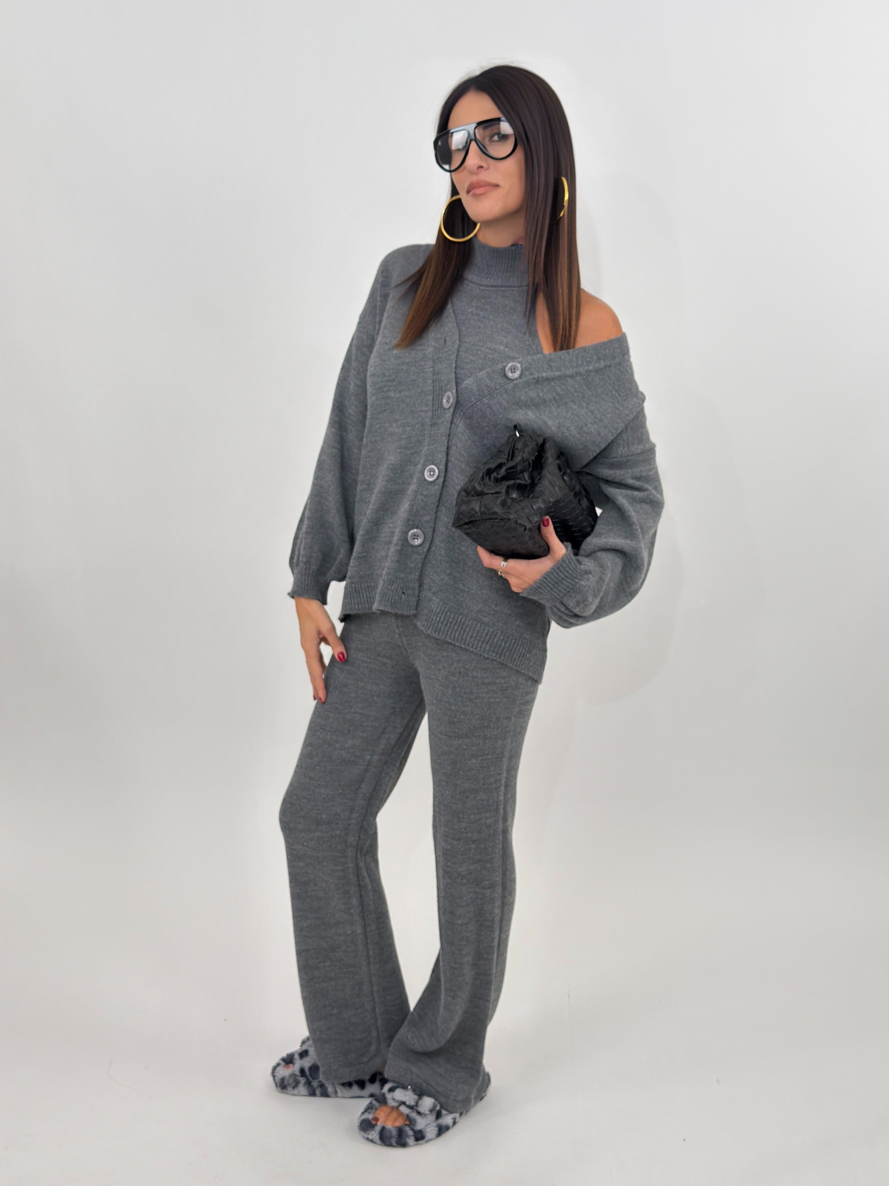 Cordset composto da tre pezzi: maglia modello cardigan manica lunga con polsino finale e chiusura frontale con bottoni. Top modello mezzocollo giromanica. Pantalone a gamba larga con bustino elastico.