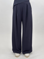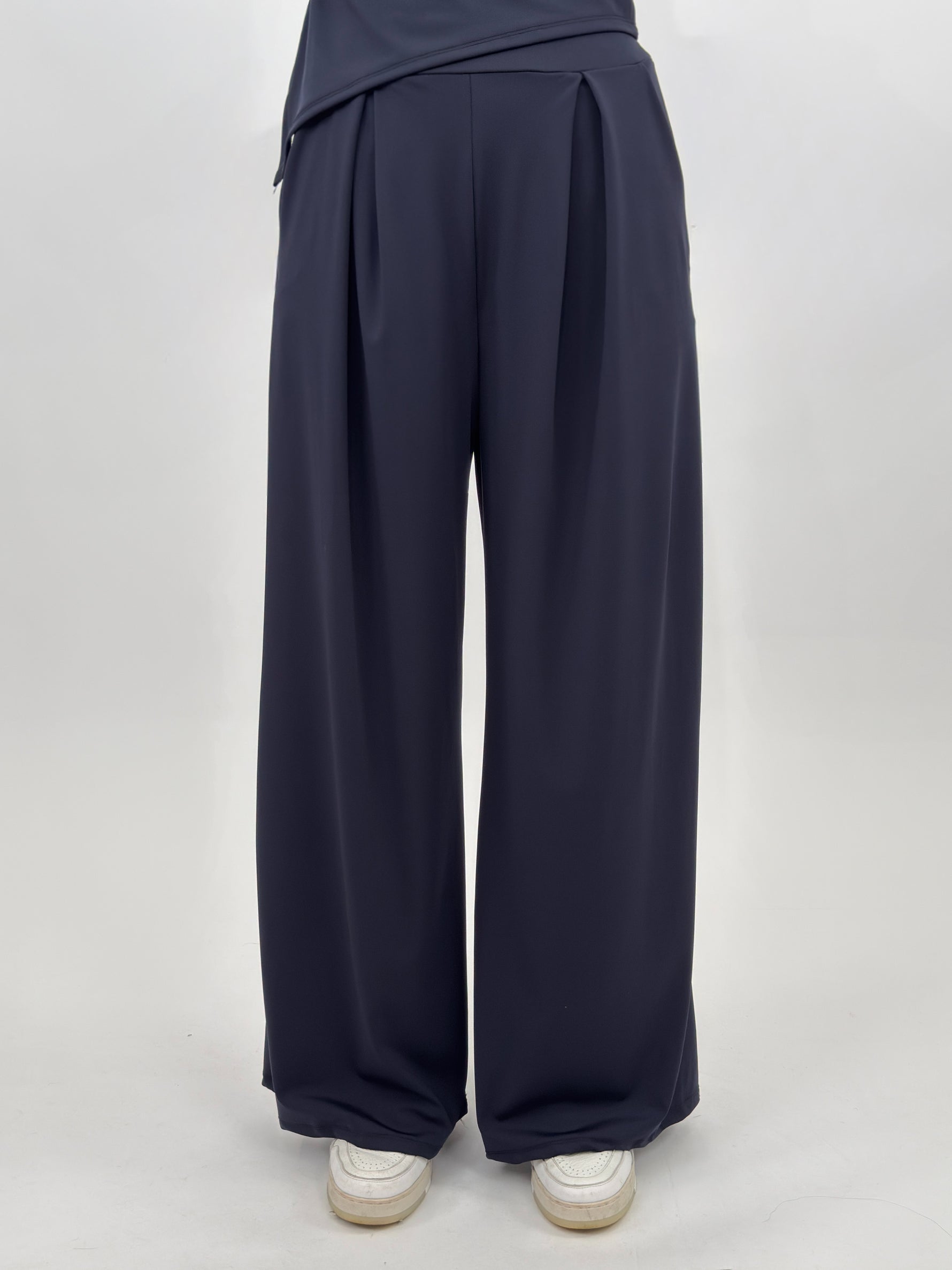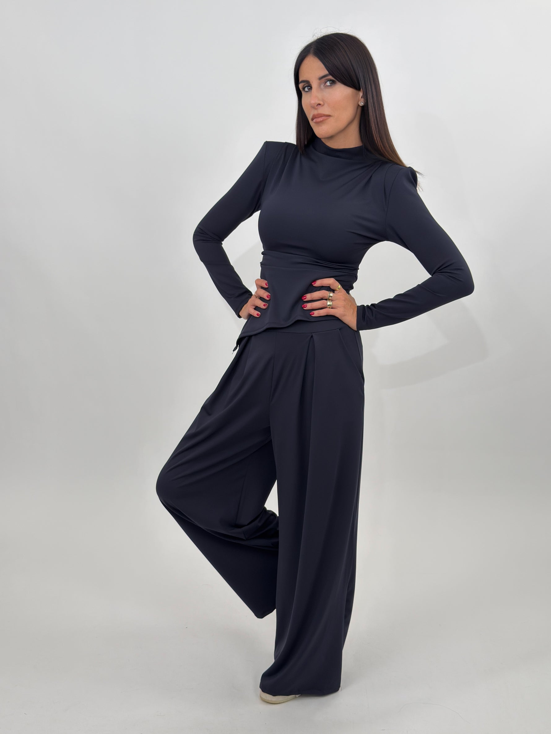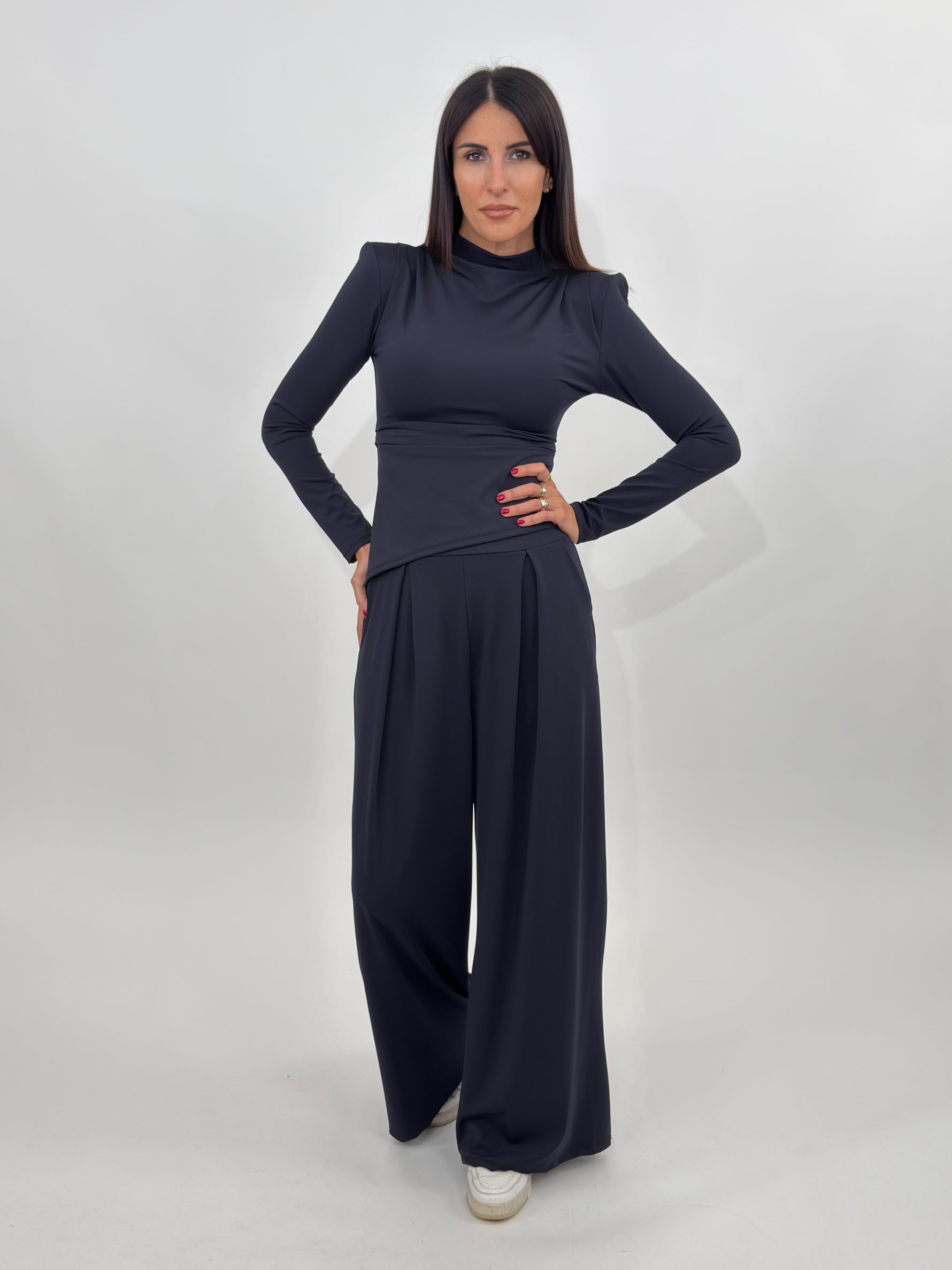 Cordset composto da maglia modello mezzo collo, manica lunga con spallina imbottita, taglio asimettrico sul fondo con arriccio laterale. Pantalone modello a gamba larga con tasche laterali e pinces sul davanti. Bustino elastico.