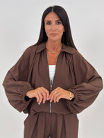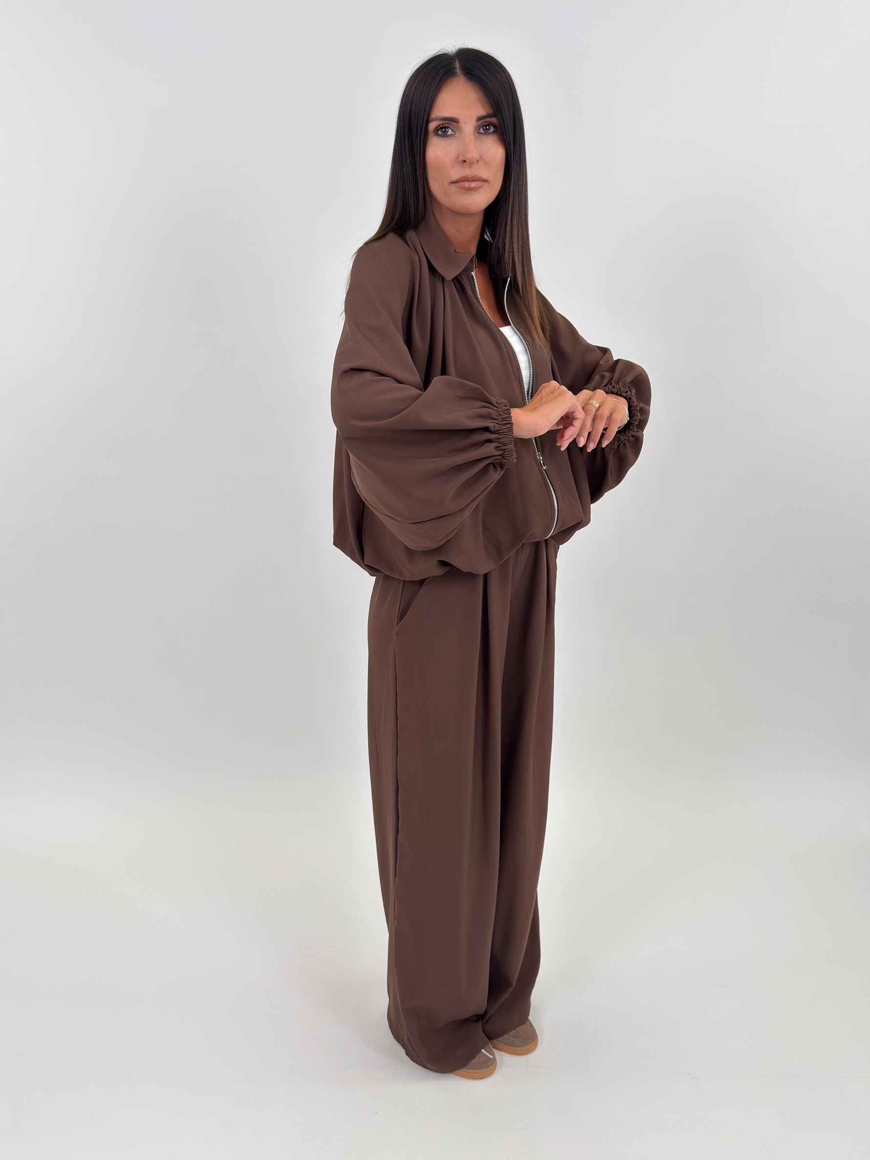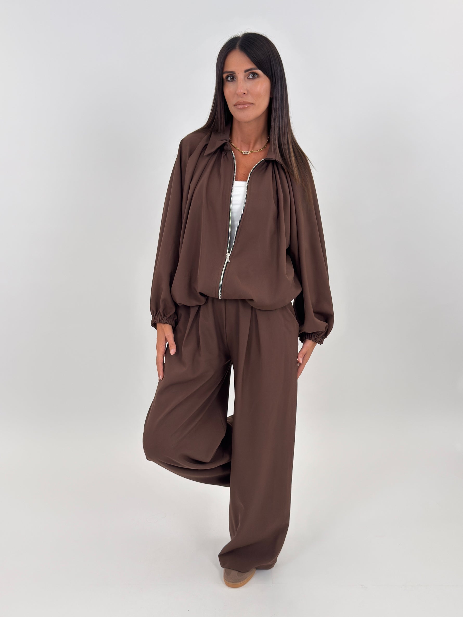 Cordset composto da giacca/giubbotto con colletto e maniche lunghe ampie con polsino elastico. Chiusura frontale con zip in metallo. Pantalone modello palazzo con tasche laterali e pinces sul davanti. Bustino con elastico.