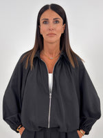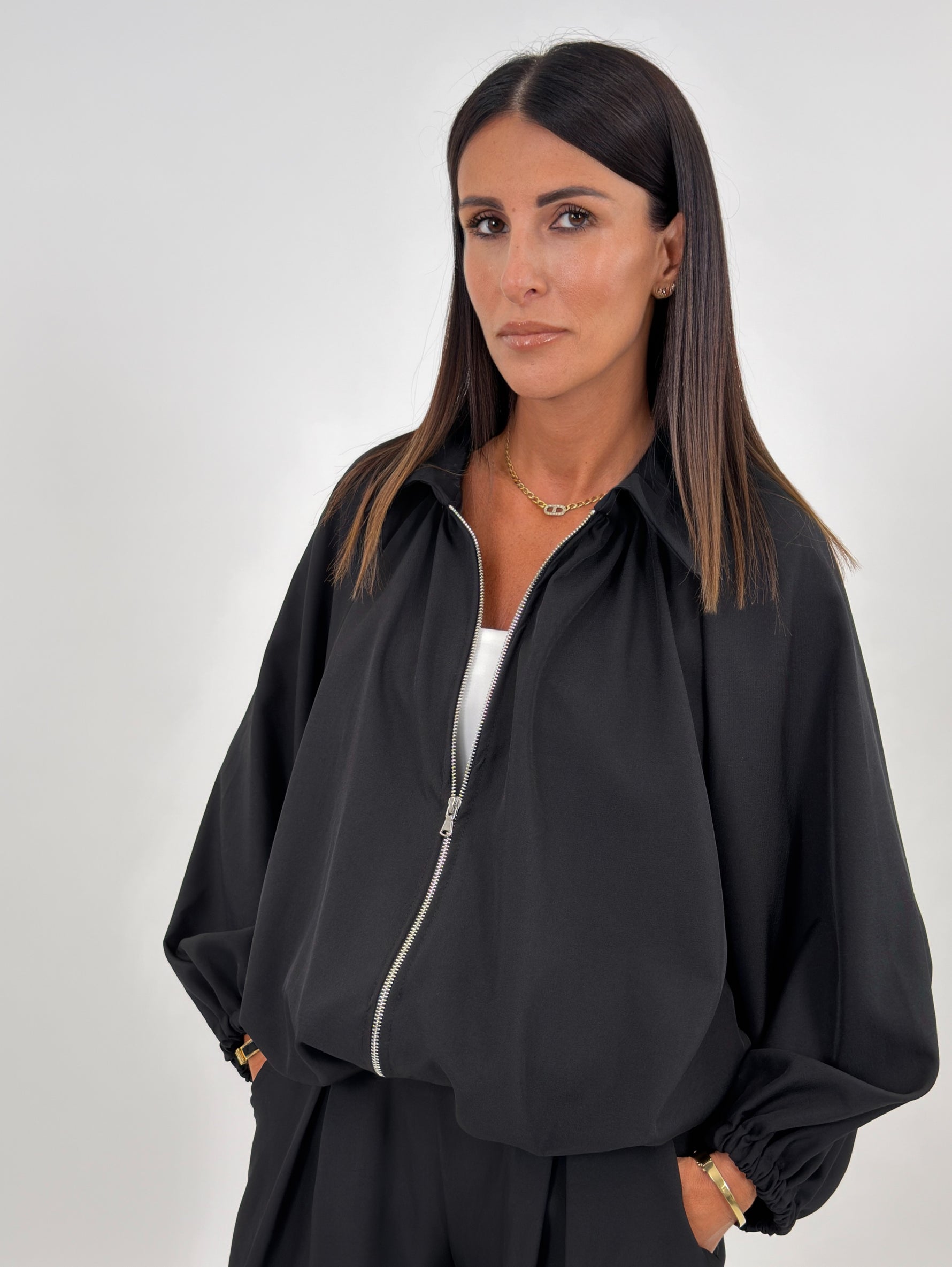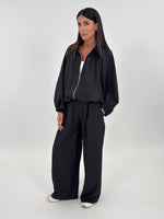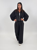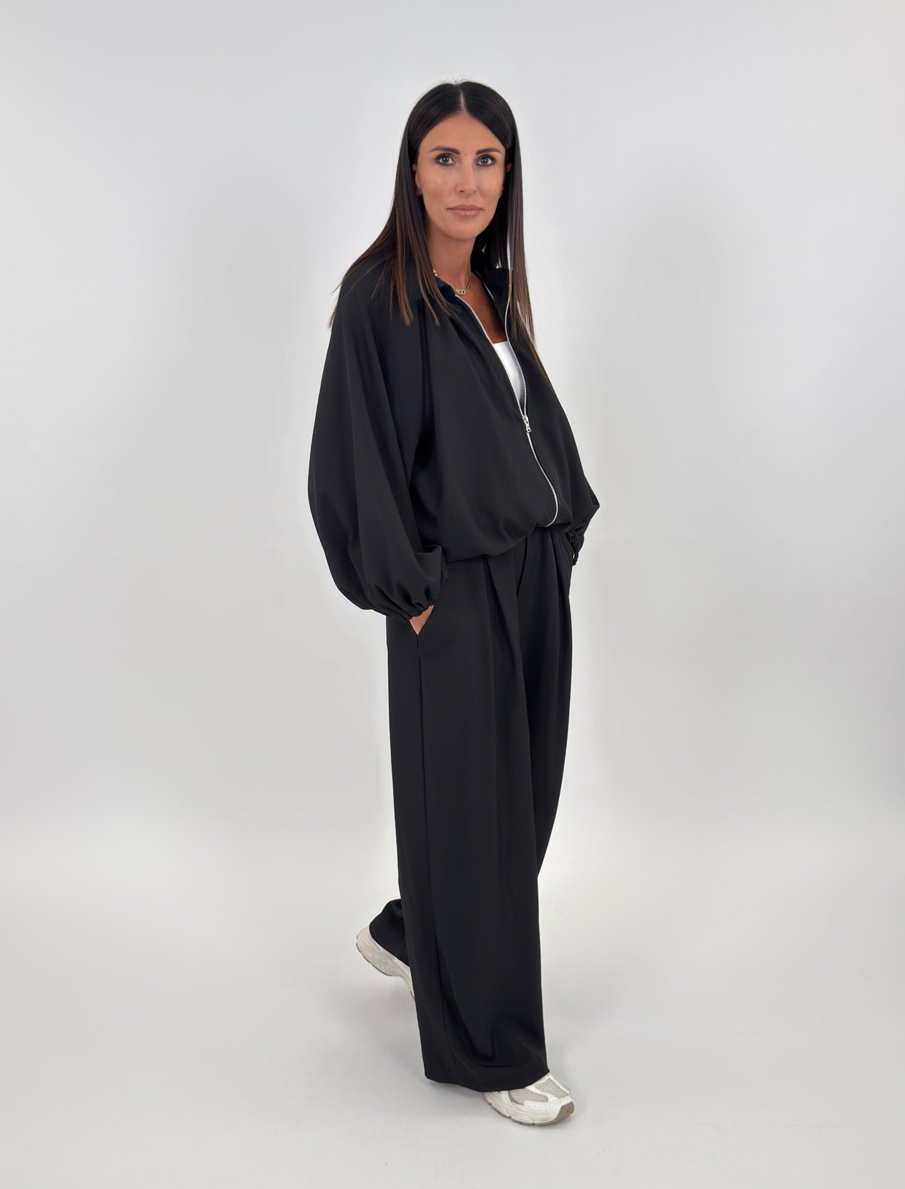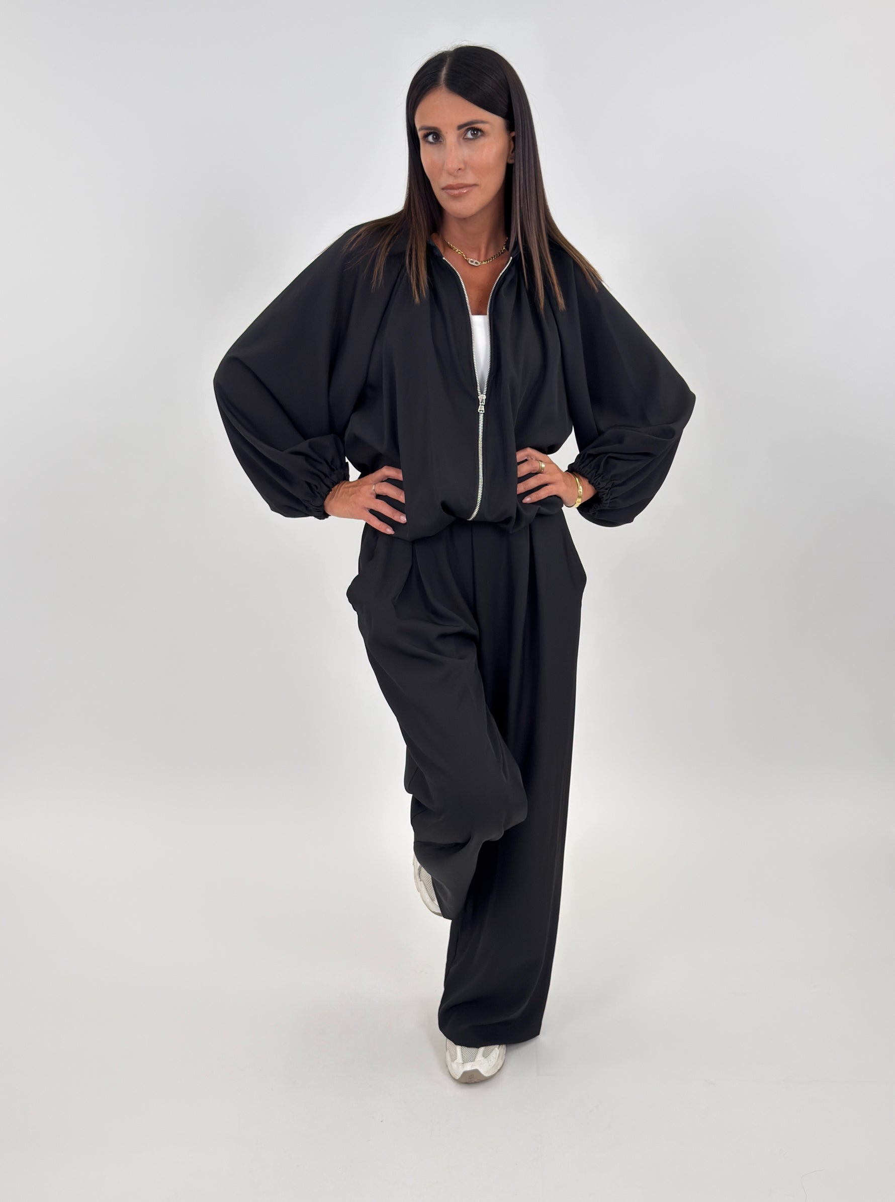 Cordset composto da giacca/giubbotto con colletto e maniche lunghe ampie con polsino elastico. Chiusura frontale con zip in metallo. Pantalone modello palazzo con tasche laterali e pinces sul davanti. Bustino con elastico.