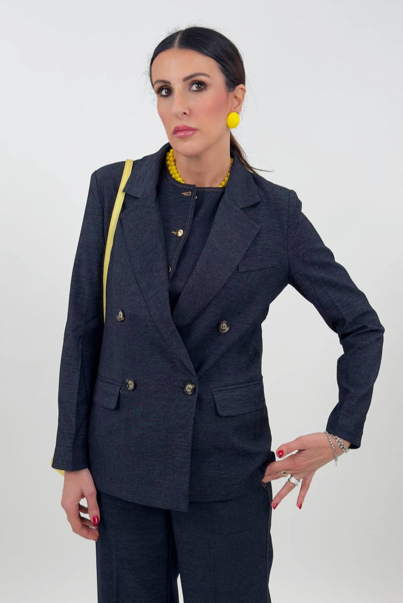 Giacca in denim modello lungo, doppio petto e tasche con pattina frontale.
