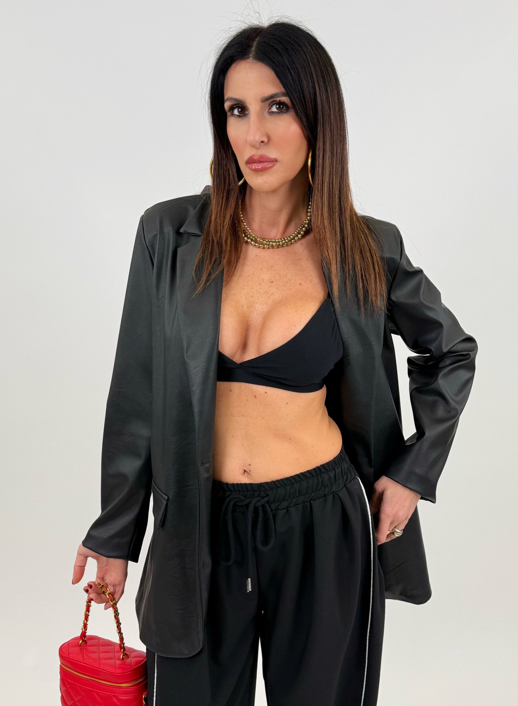 Giacca modello oversize, in ecopelle monopetto, con due tasche frontali,nmanica lunga, chiusura con bottone in taglia unica. Disponibile in taglia uica.
