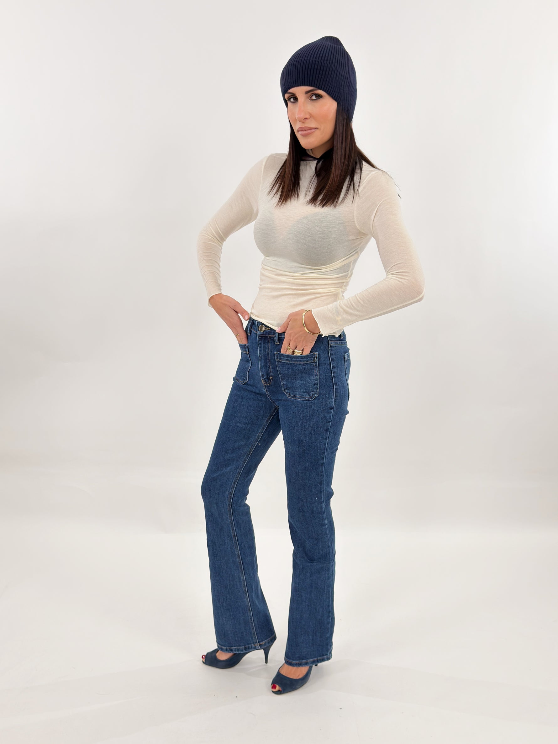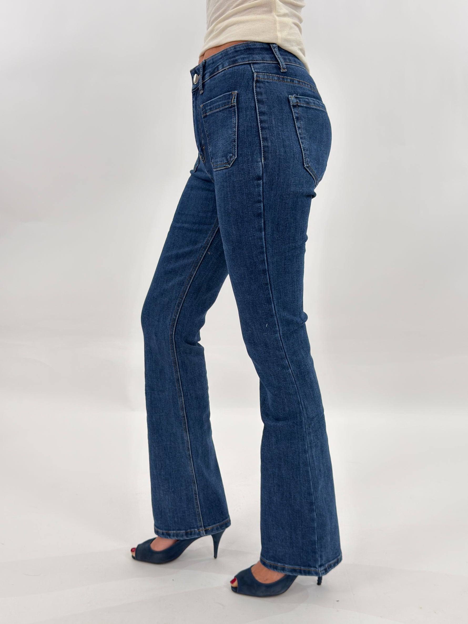 Jeans in denim blu modello a zampetta. Presenta due tasche anteriore e posteriori. Chiusura con zip e bottone.
