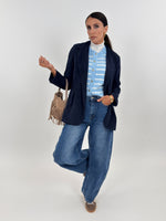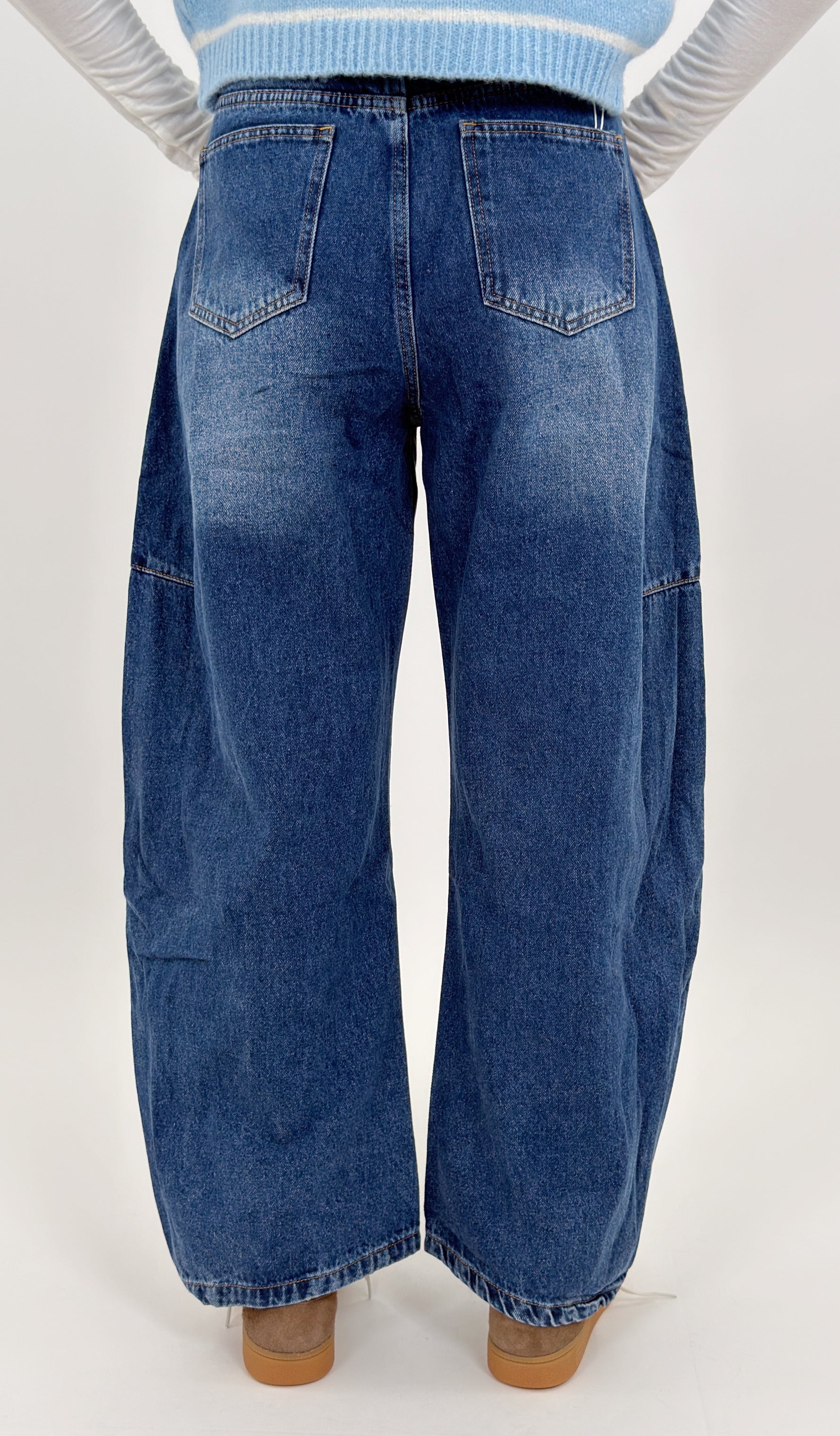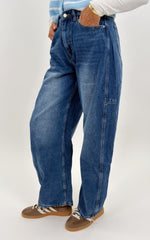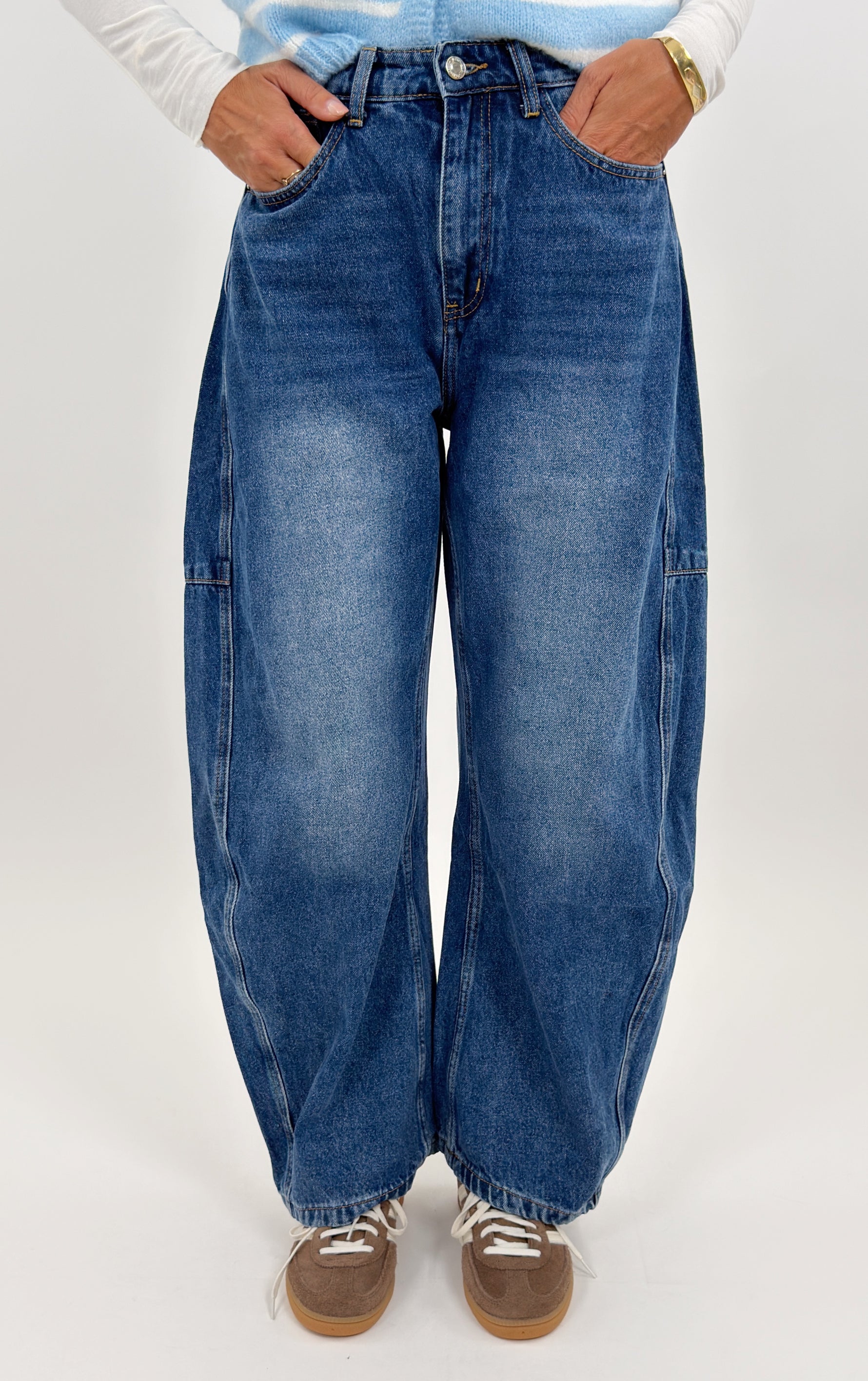Jeans in denim blu modello balloon fit. Presenta cinque tasche. Chiusura con zip e bottone.