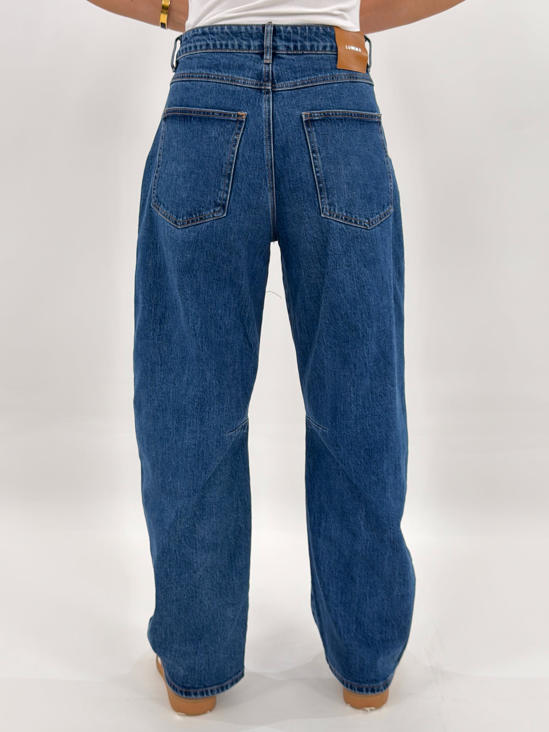 Jeans targato LUMINA in denim blu modello balloon, cinque tasche. Chiusura con zip e bottone.