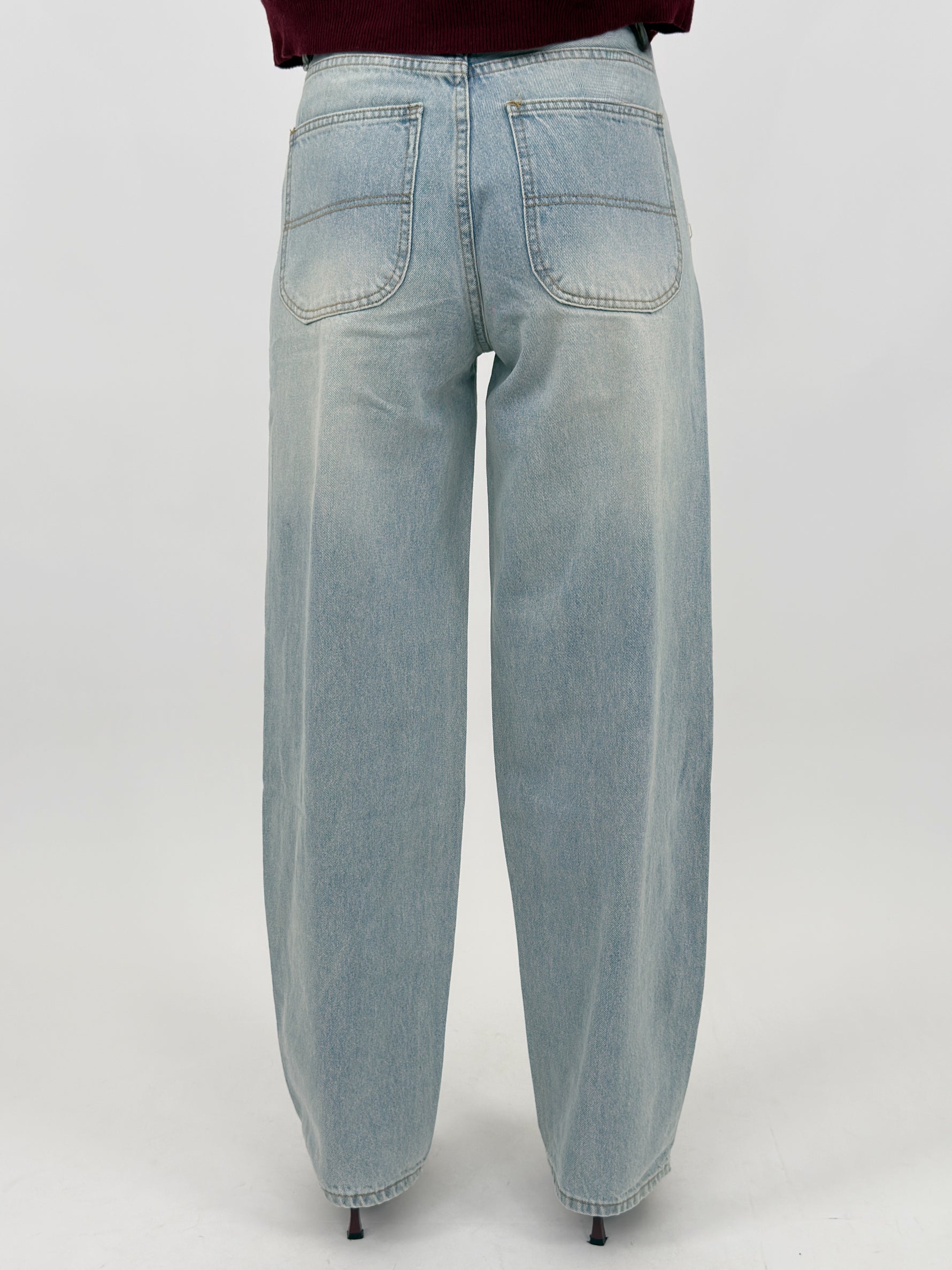 Jeans in denim chiaro modello wide leg cinque tasche con finale sfrangiato. Chiusura con zip e bottone.
