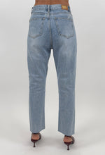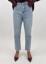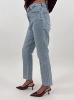 Jeans in denim chiaro modello straight cinque tasche con finale sfrangiato. Chiusura con zip e bottone.