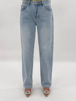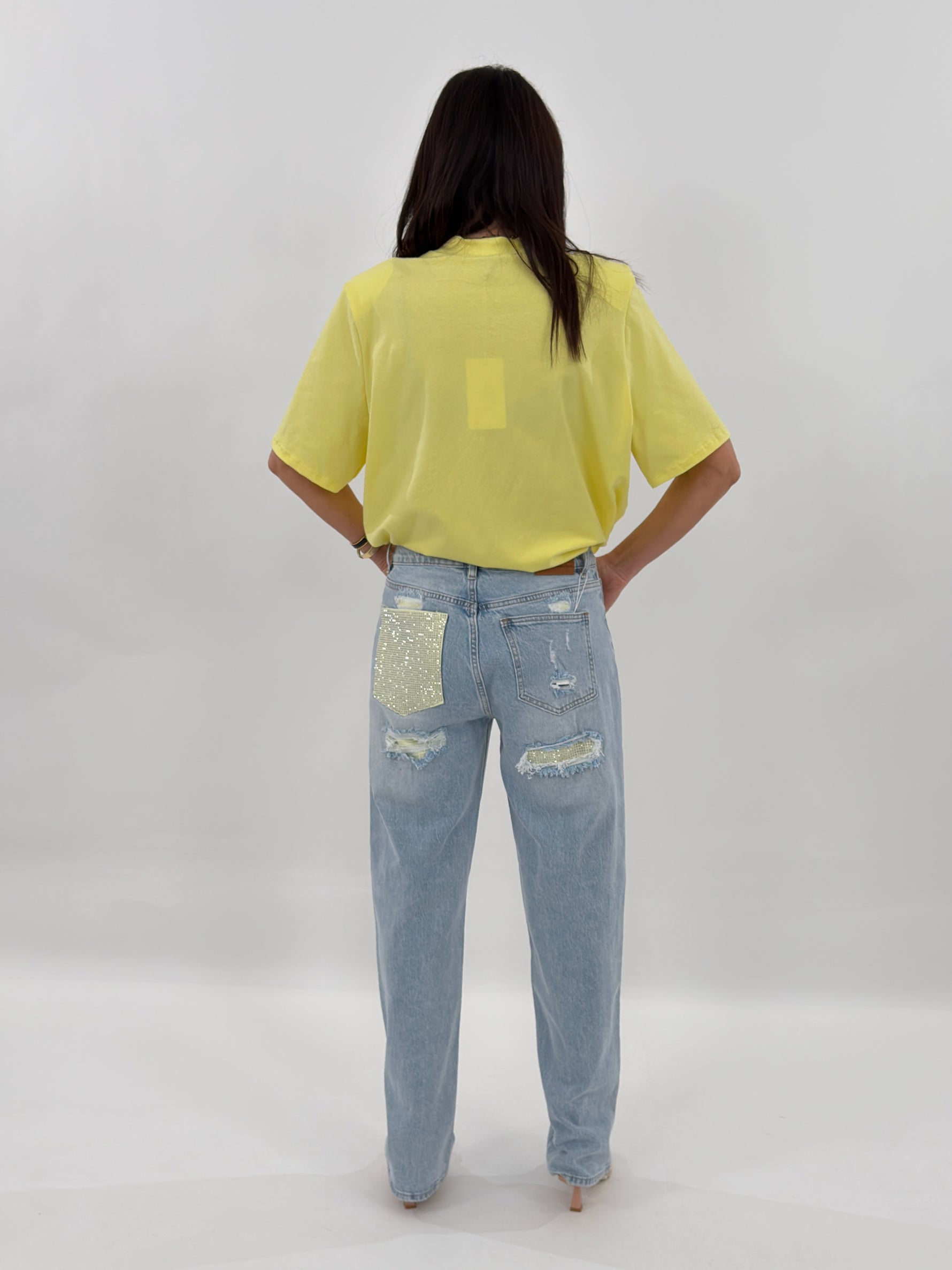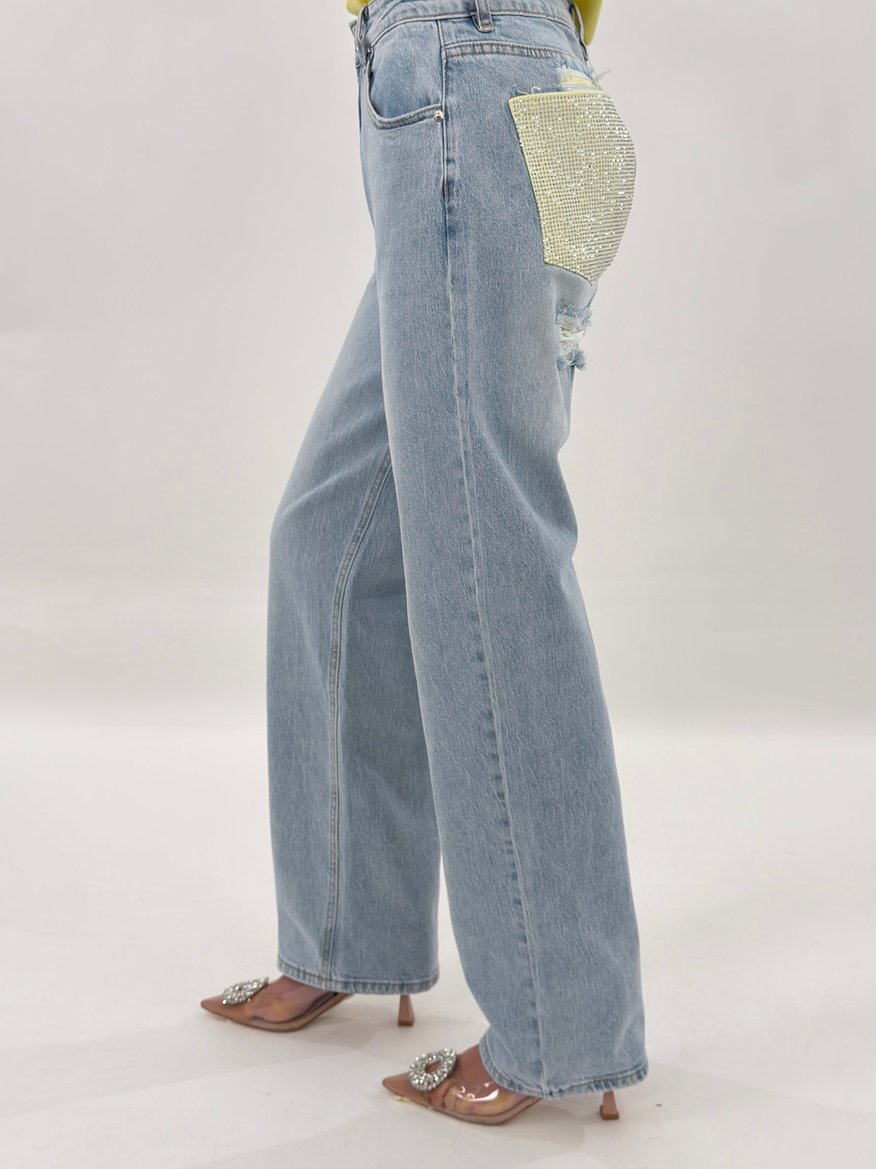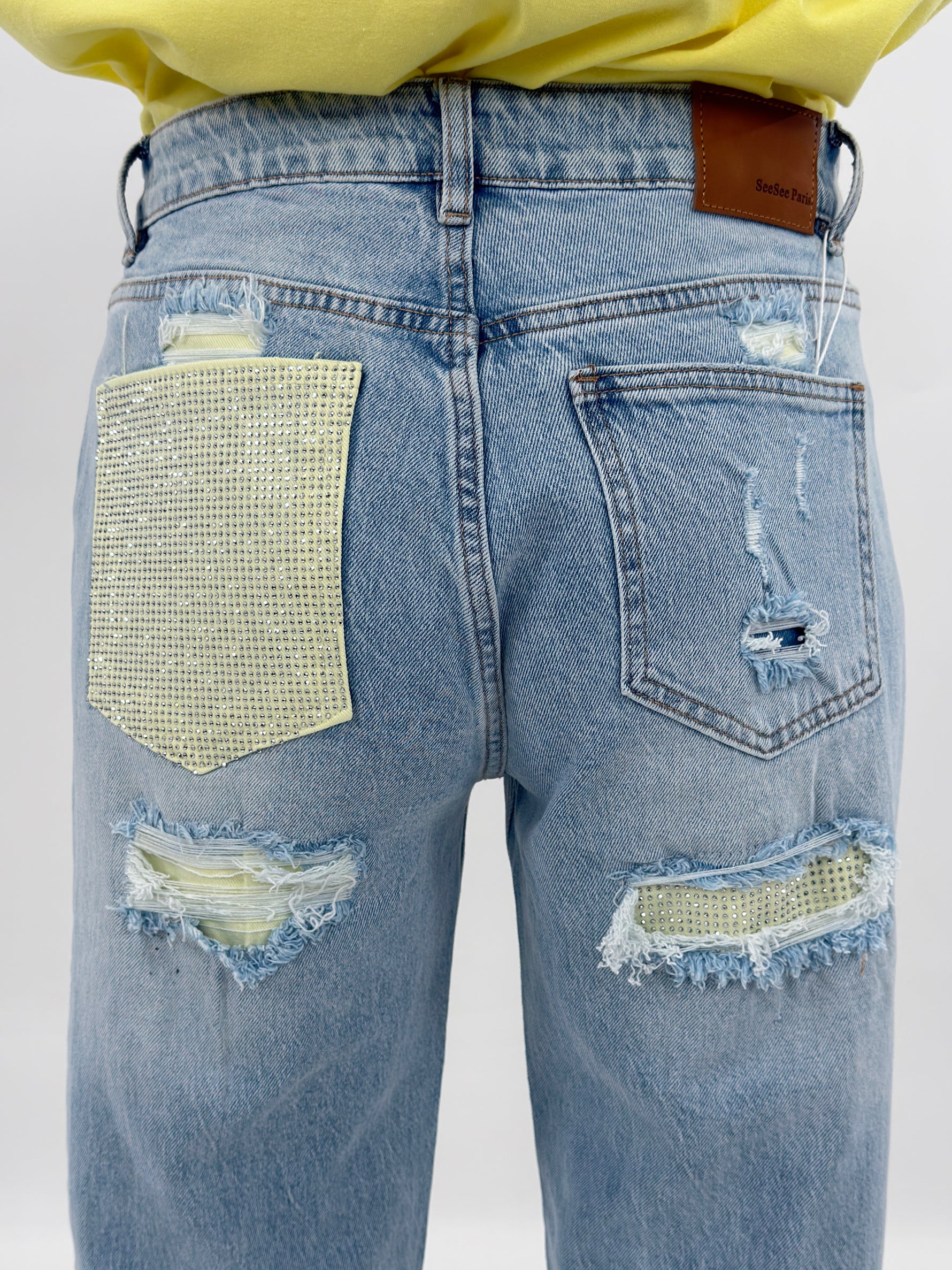 Jeans targato See See in denim chiaro modello wide leg a cinque tasche. Caratterizzato da strappi decorativi sul retro e da una tasca impreziosita da una toppa a contrasto, arricchita da applicazioni di strass.