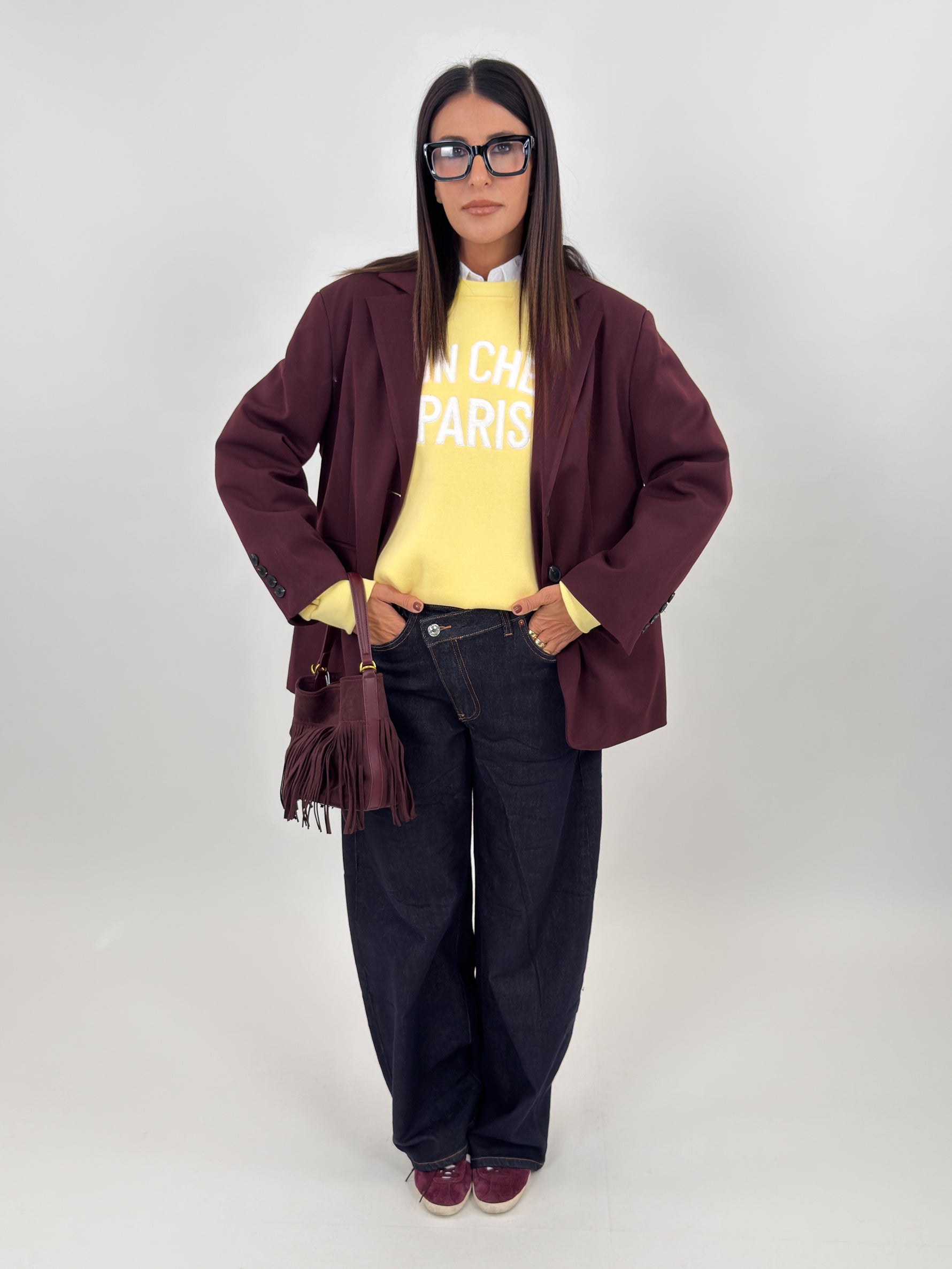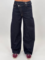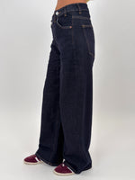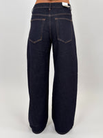 Jeans in denim blu scuro modello wide balloon, cinque tasche. Presenta cuciture a contrasto e chiusura trasversale con doppia abbottonatura e zip.